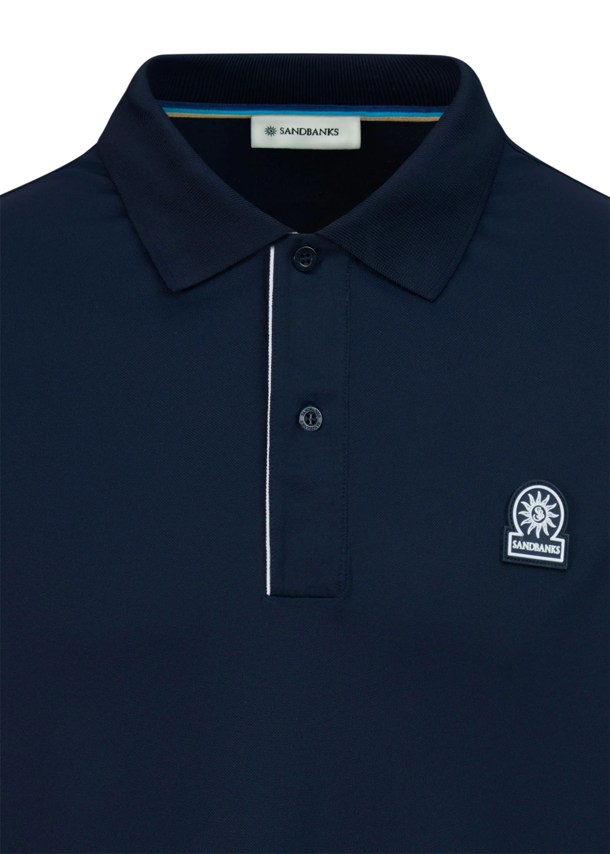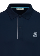 Sandbanks men's contrast placket polo shirt in navy, made from Q-NOVA® recycled polyamide; a breathable, moisture wicking and temperature regulating technical fabric. This classic fitting polo shirt has a statement contrast white placket, tonal Sandbanks rubber badge and tri-colour back neck binding.