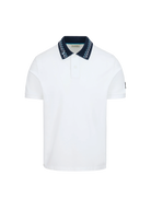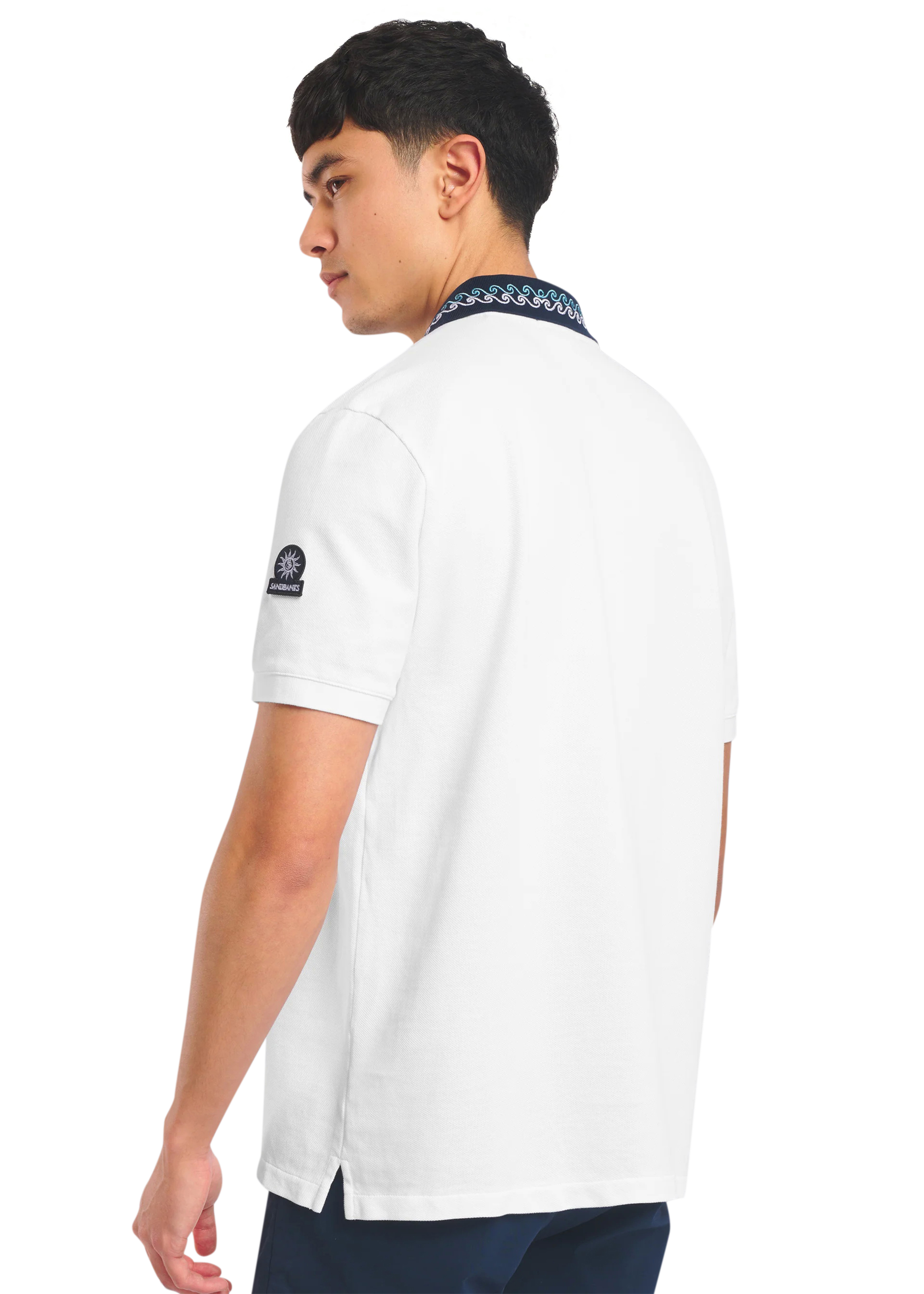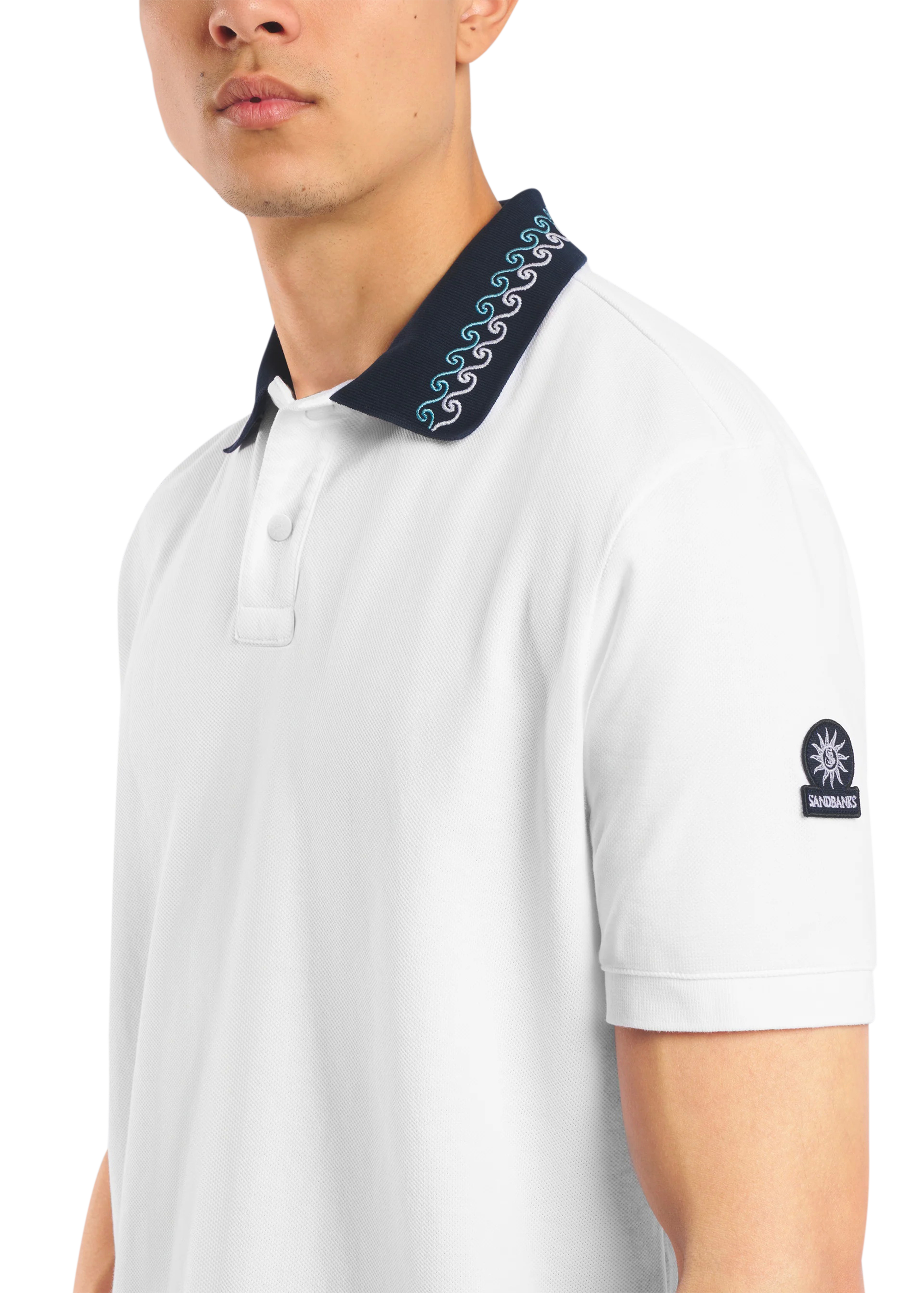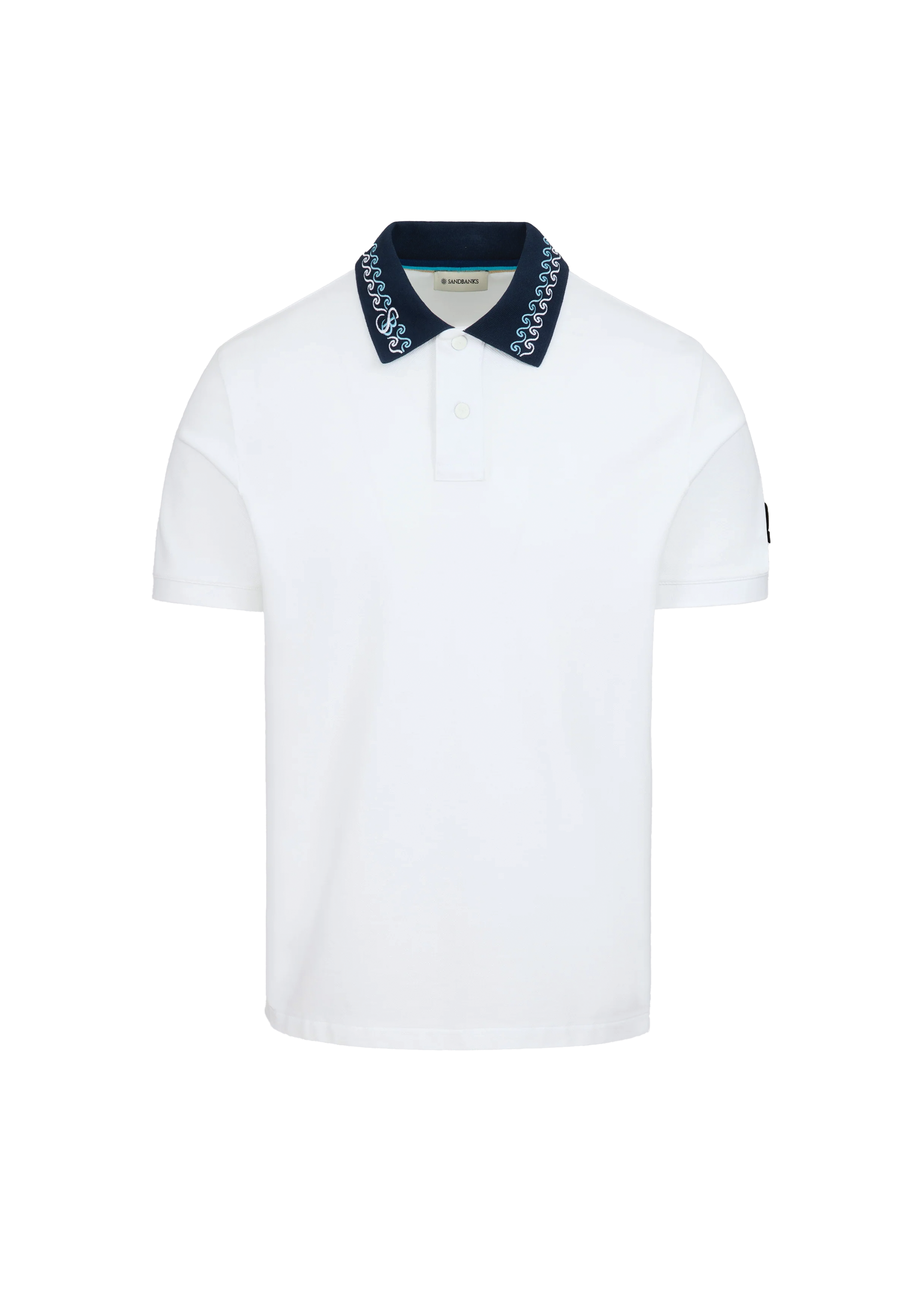 Sandbanks men's embroidered collar polo shirt in white, made from 100% organic cotton. This classic fitting polo shirt features statement navy collar with contrast white and crystal blue wave embroidery, white engraved rubberised two popper placket, and embroidered badge on the arm.