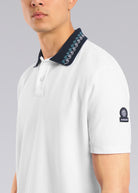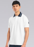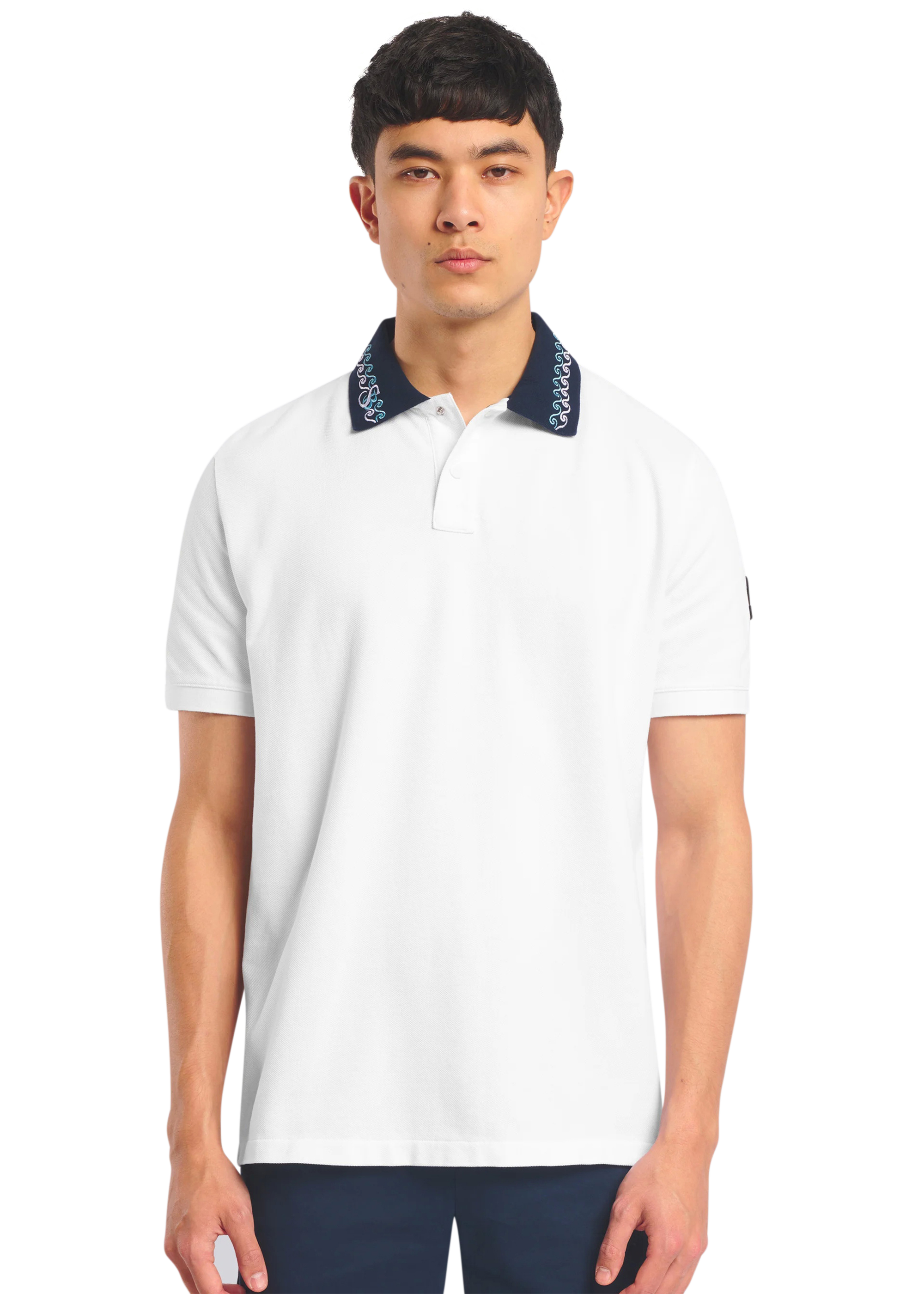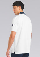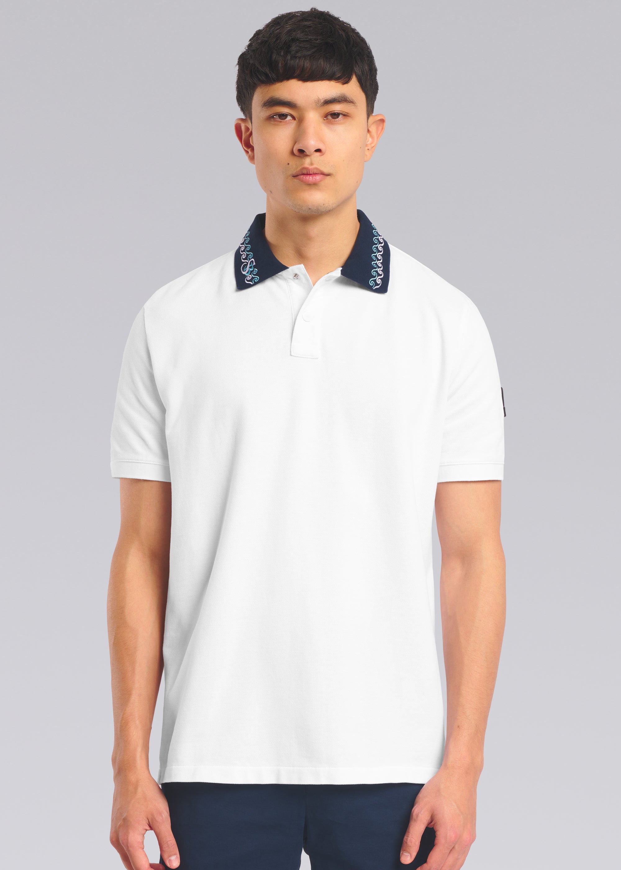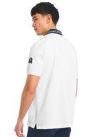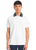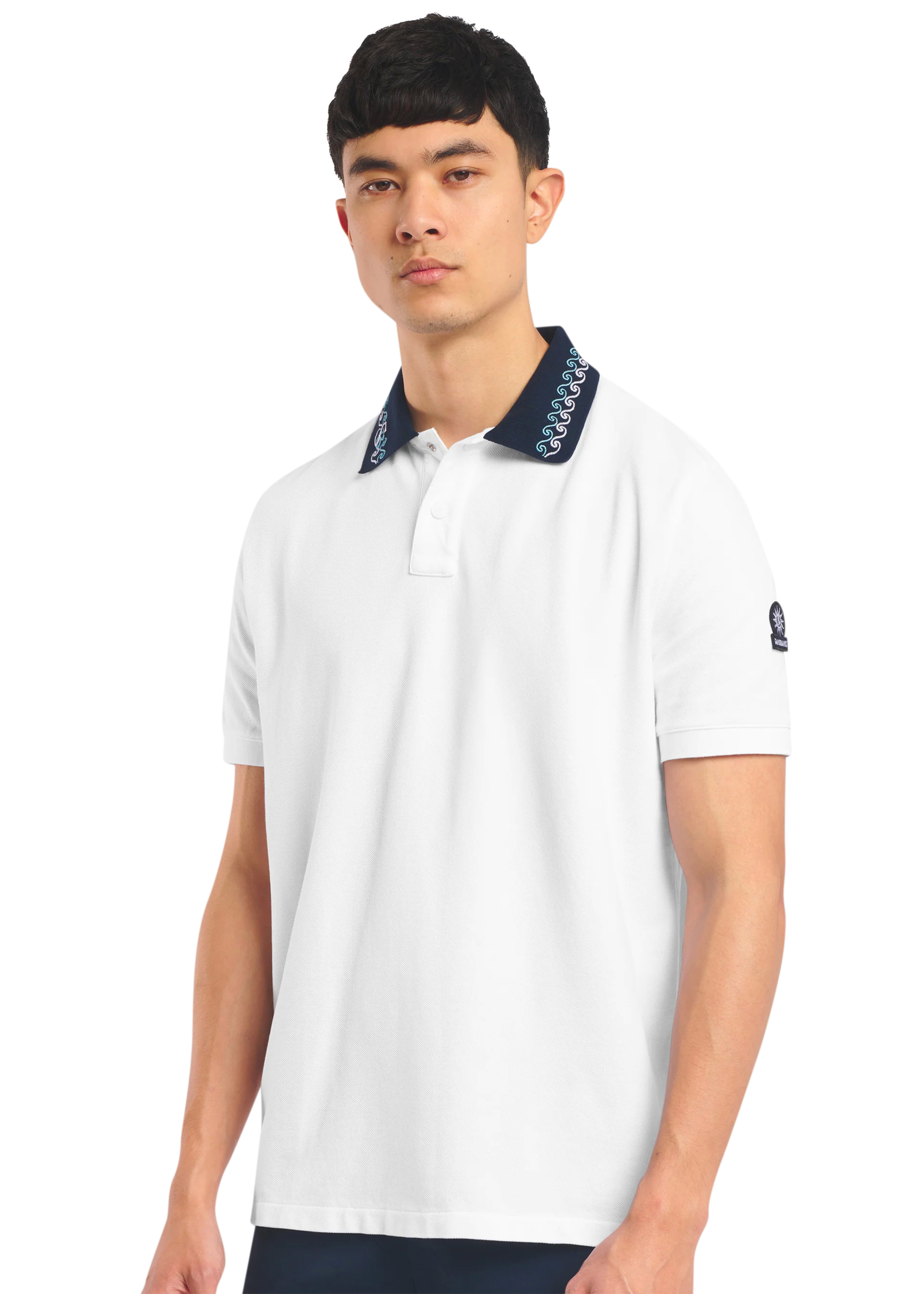 Sandbanks men's embroidered collar polo shirt in white, made from 100% organic cotton. This classic fitting polo shirt features statement navy collar with contrast white and crystal blue wave embroidery, white engraved rubberised two popper placket, and embroidered badge on the arm.