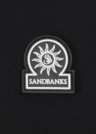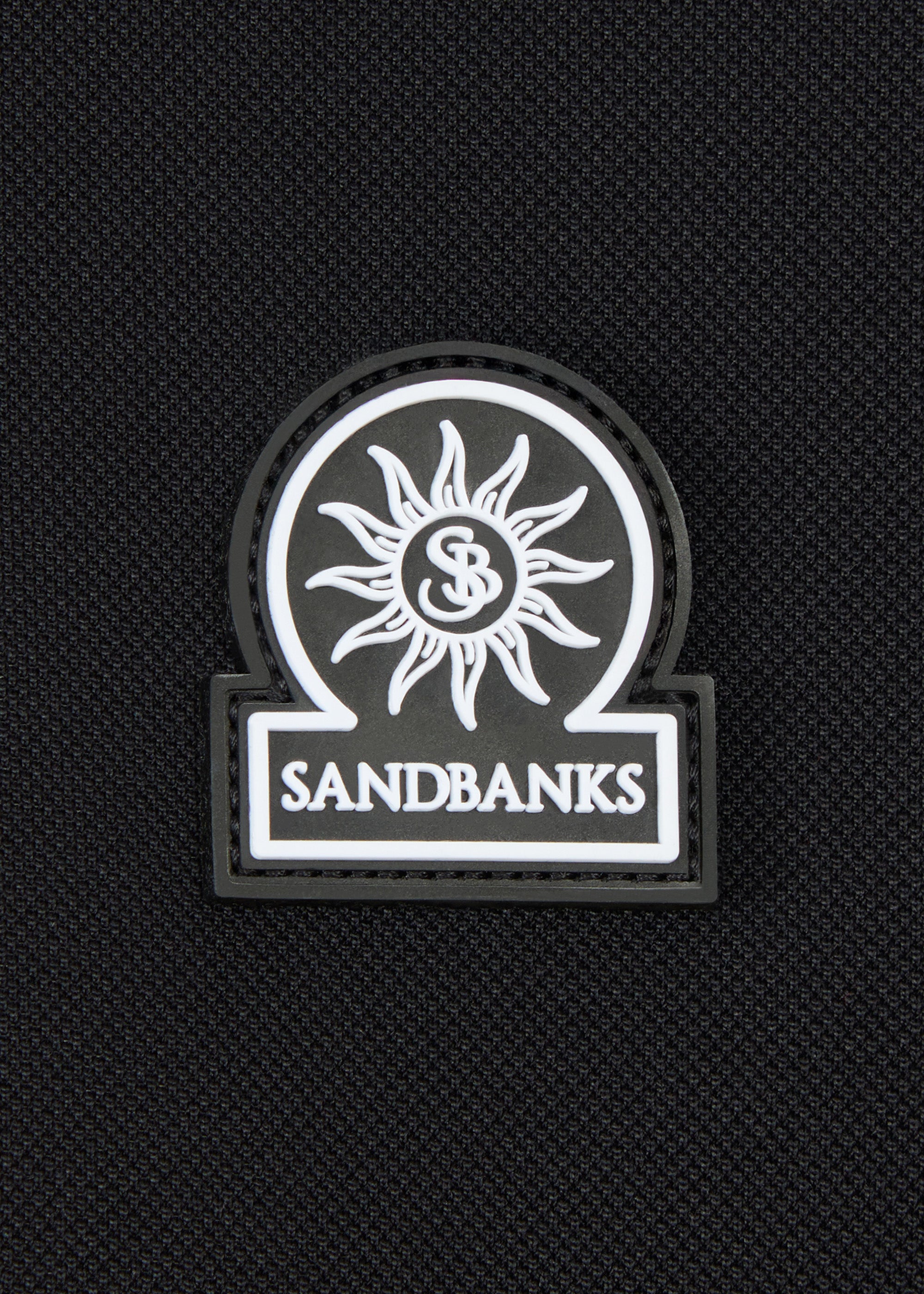 The Sandbanks Gradient Rib Polo Shirt in black is crafted from a polyamide micro pique material, providing a sporty texture. It boasts a 3-button placket and is adorned with a rubber badge in matching black and white tones.