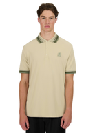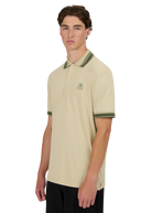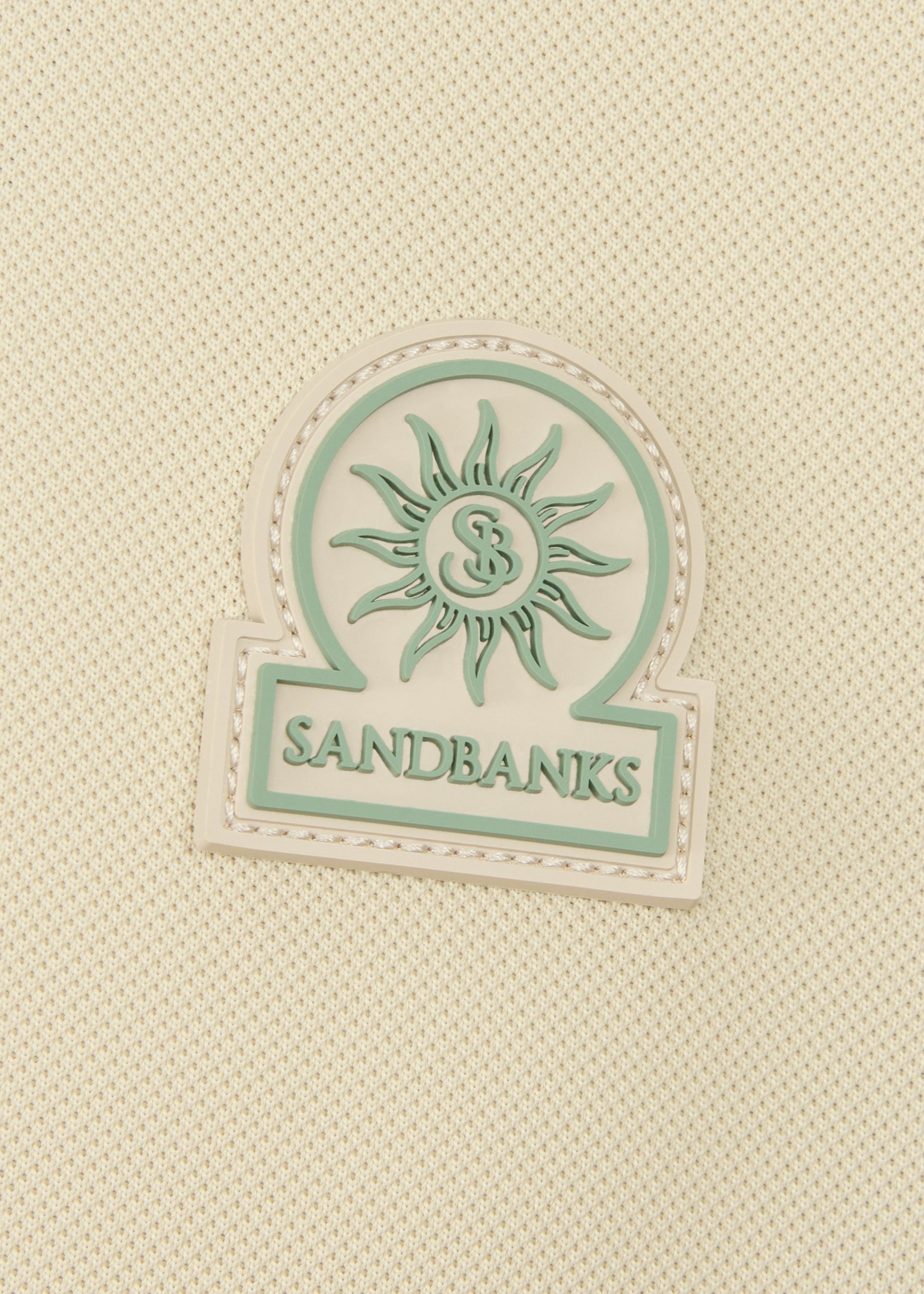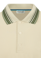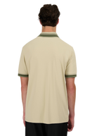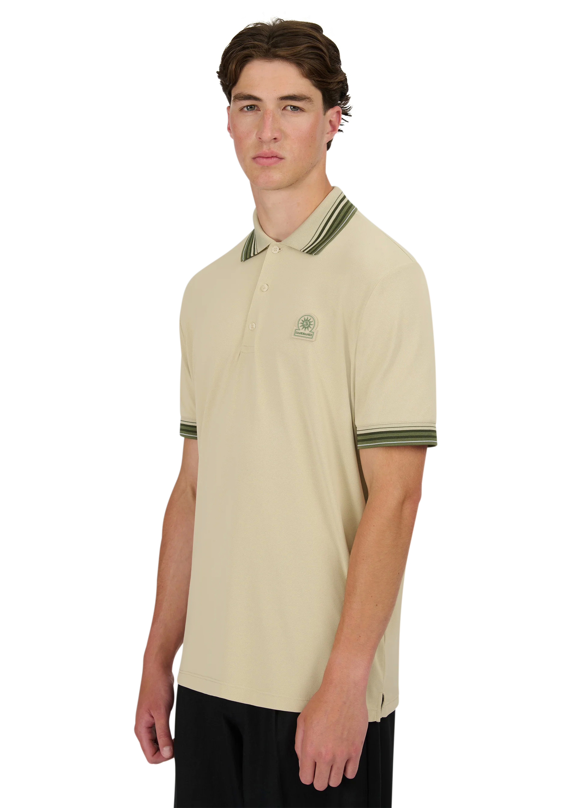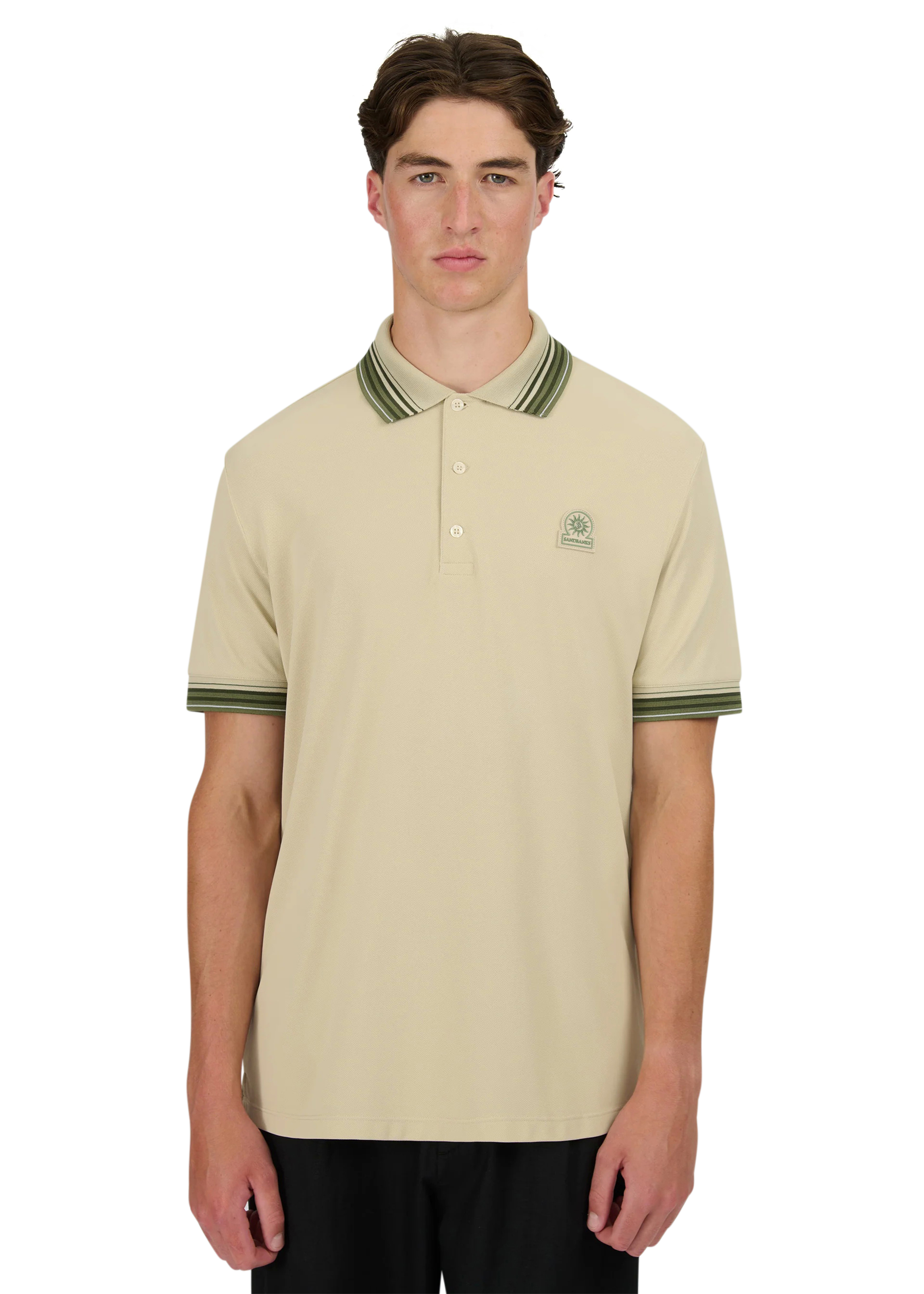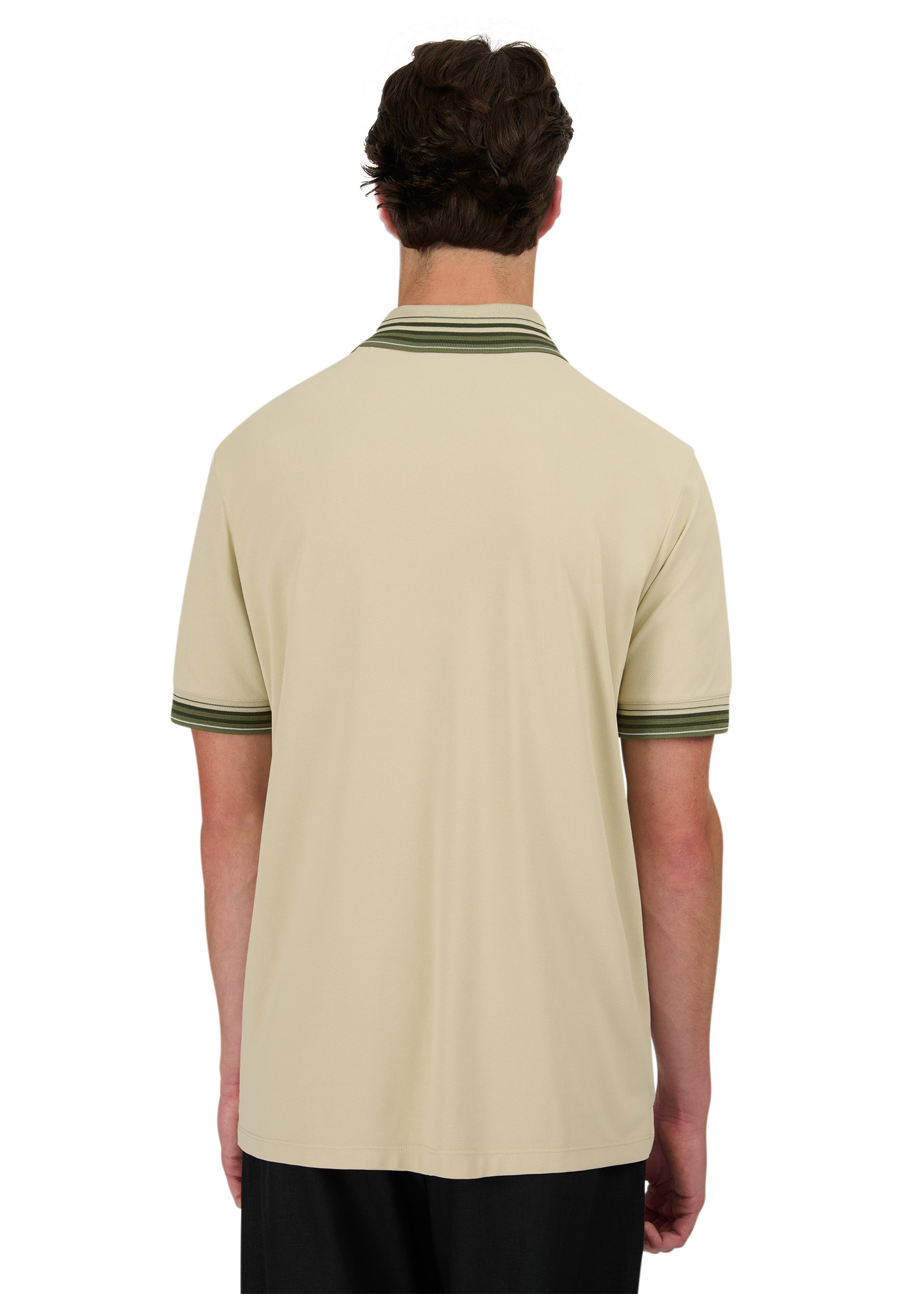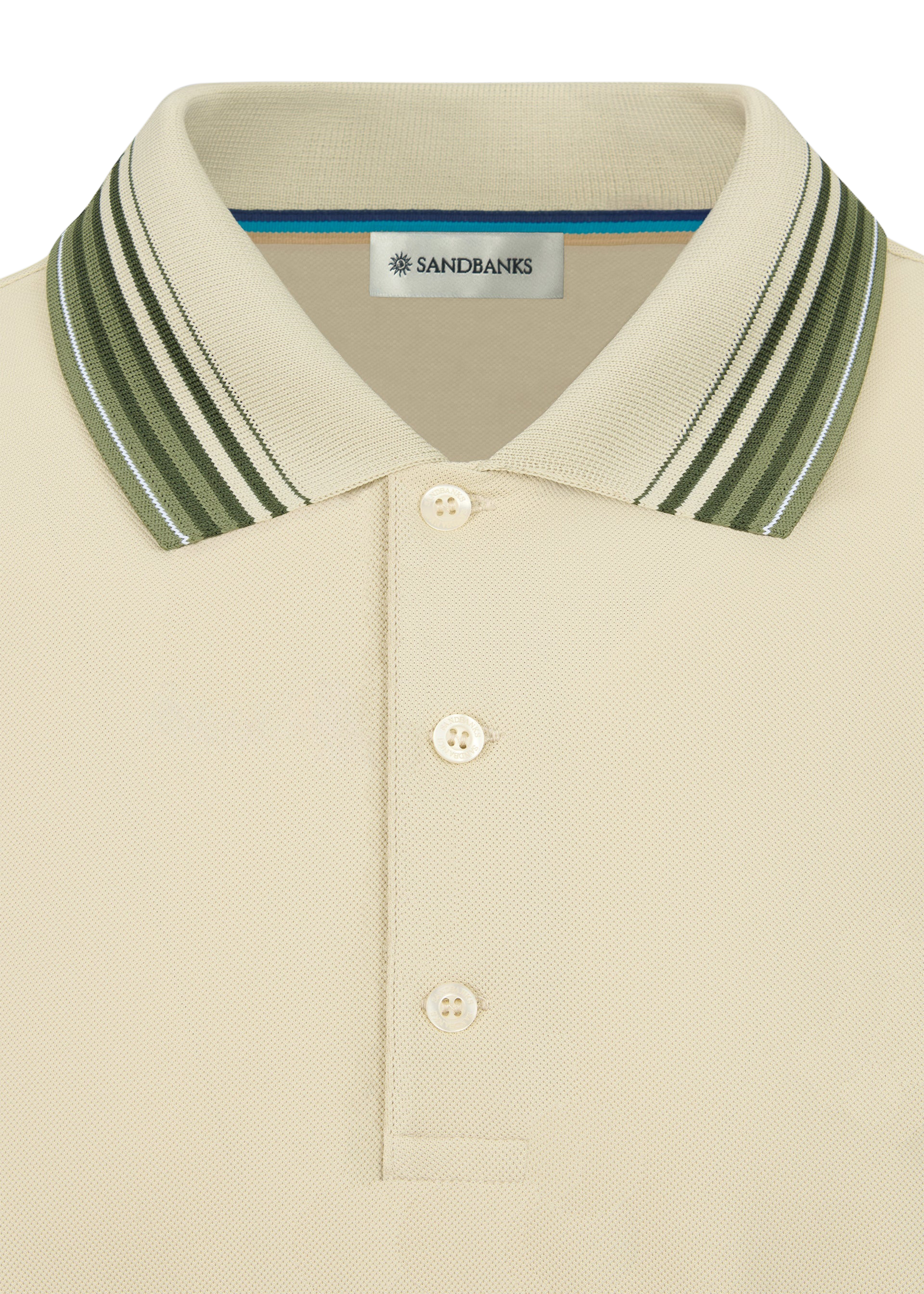 The Sandbanks Gradient Rib Polo Shirt in Stone is crafted from a polyamide micro pique material, providing a sporty texture. It boasts a 3-button placket and is adorned with a rubber badge in matching stone and sage tones.