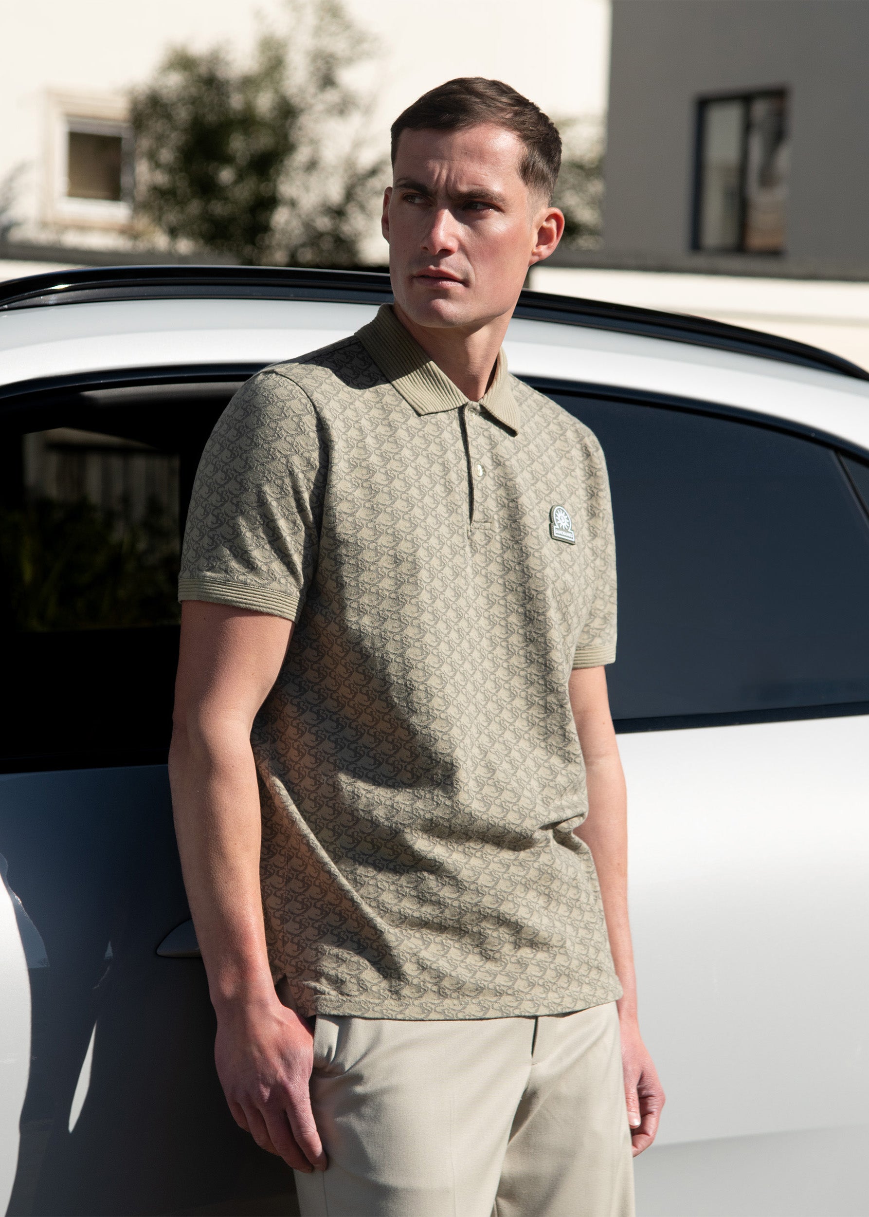 Sandbanks men's monogram polo shirt in sage, made from 100% Cotton. This classic fit polo shirt features tonal sage jacquard monogram, rubber badge logo on the chest, and tri-colour back neck binding.