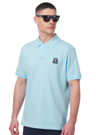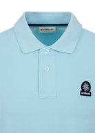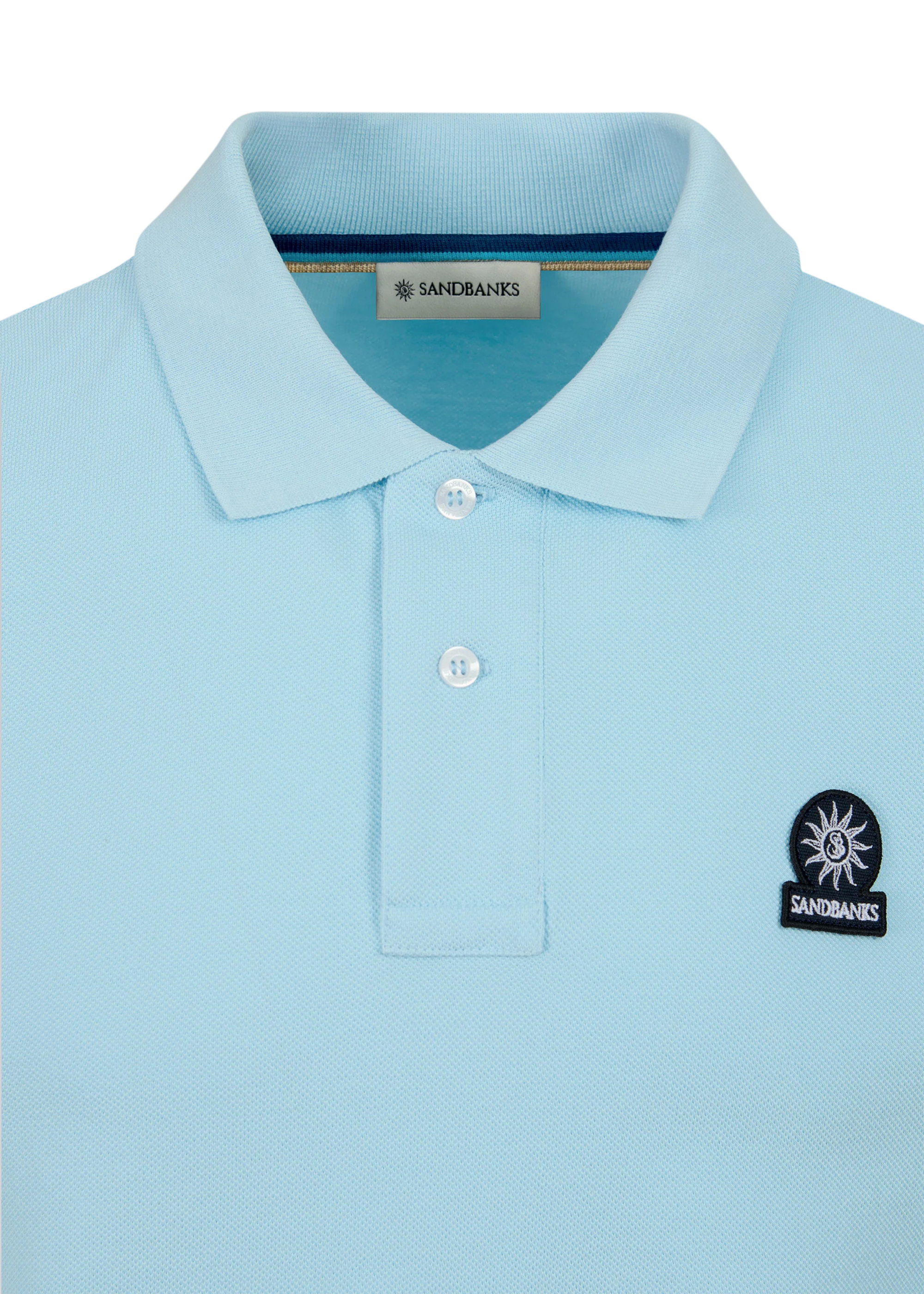 Sandbanks men's badge logo polo shirt in crystal blue, made from 100% mercerised organic cotton. This classic fitting 2 button polo shirt features an embroidered badge logo on the chest, ribbed collar and cuff, and tri-colour back neck binding.