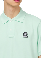 Sandbanks men's badge logo polo shirt in mint, made from 100% mercerised organic cotton. This classic fitting 2 button polo shirt features an embroidered badge logo on the chest, ribbed collar and cuff, and tri-colour back neck binding.