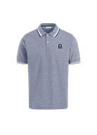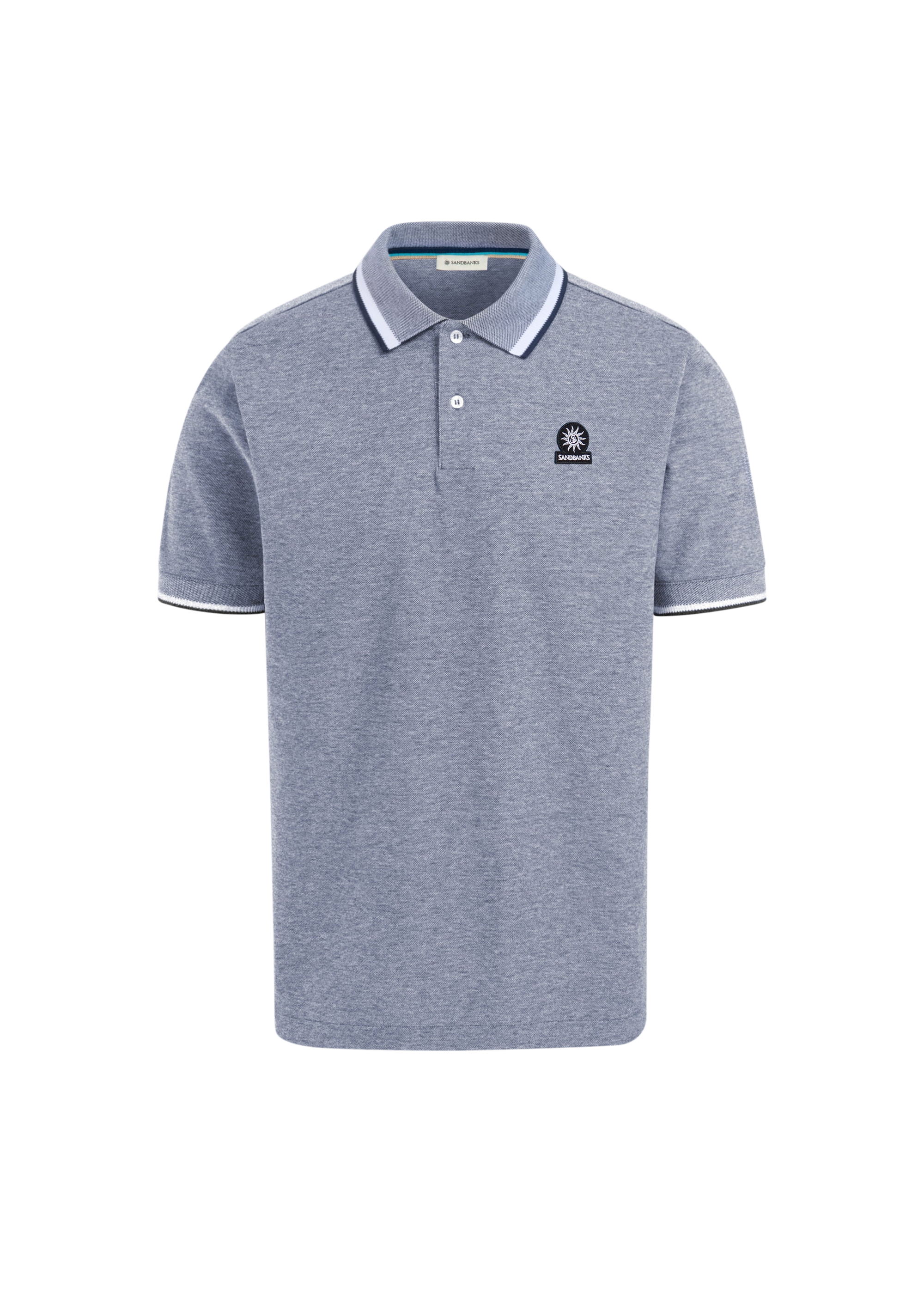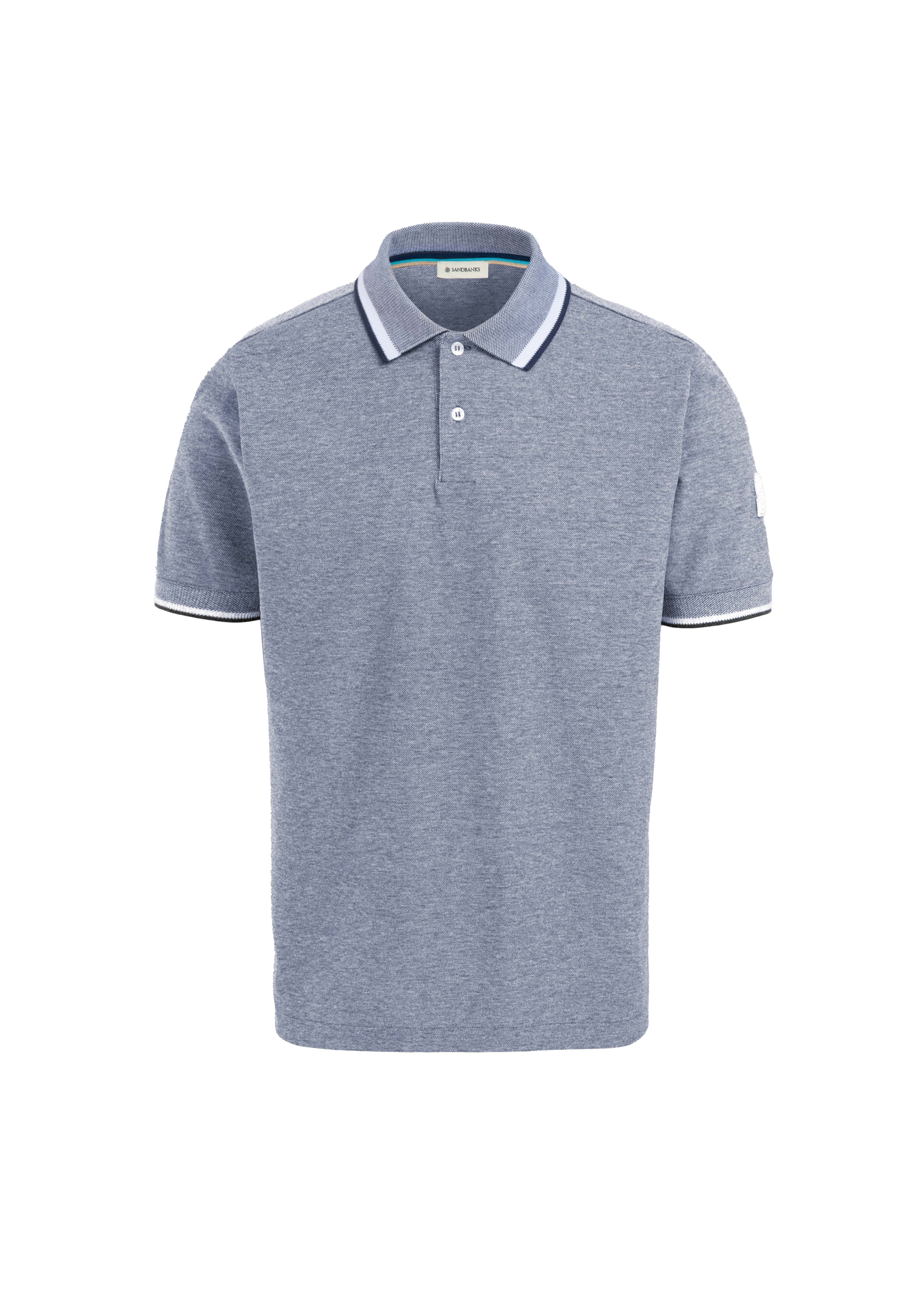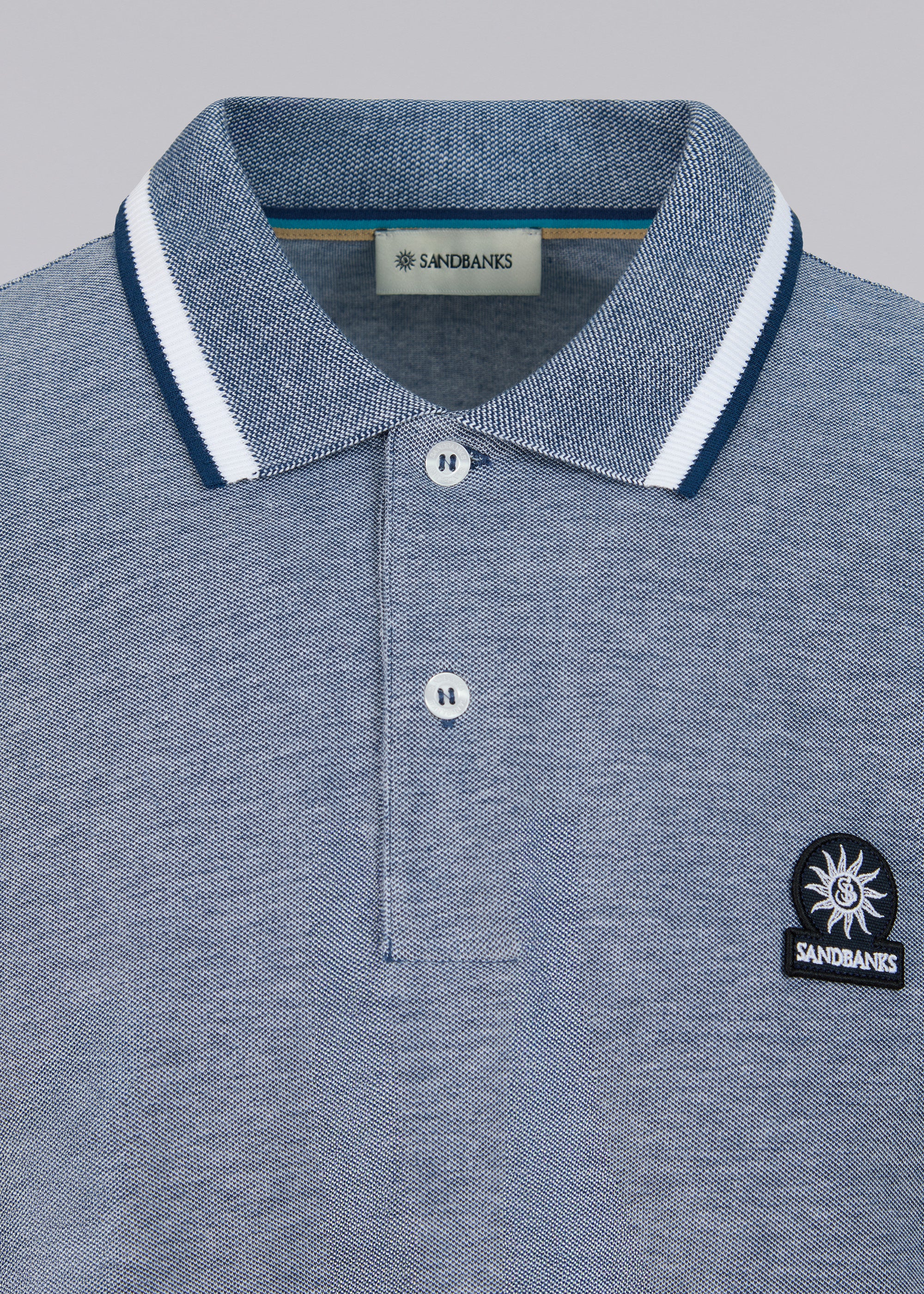 Sandbanks men's oxford stripe polo shirt in navy, made from sustainably sourced 100% BCI Cotton. This classic fitting polo shirt features statement contrast stripe collar, Sandbanks embroidered chest badge, and 2 button placket.