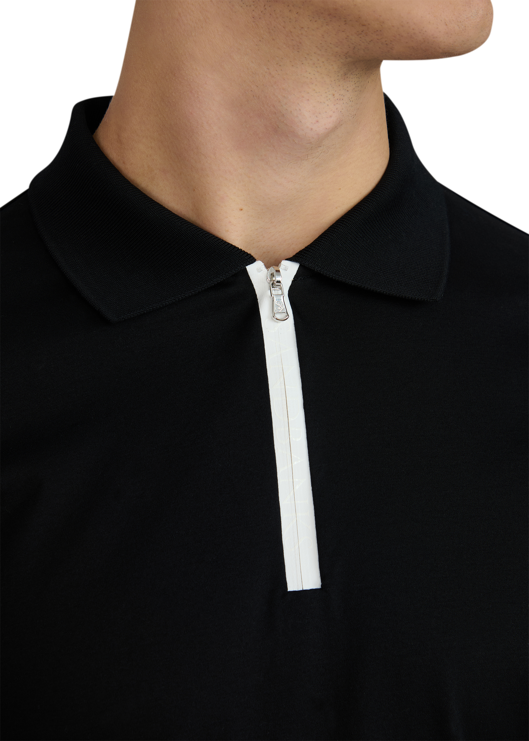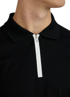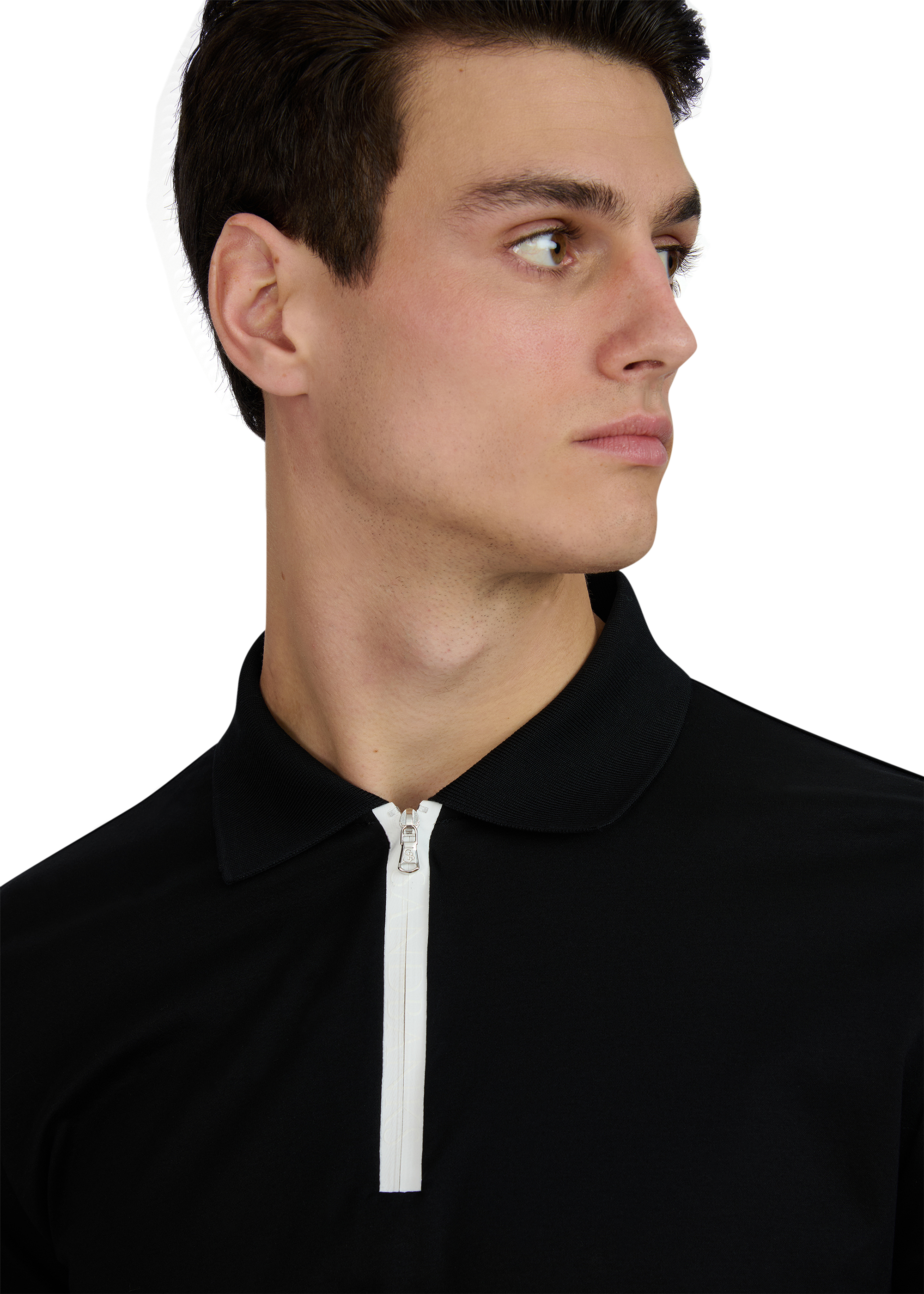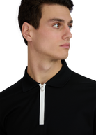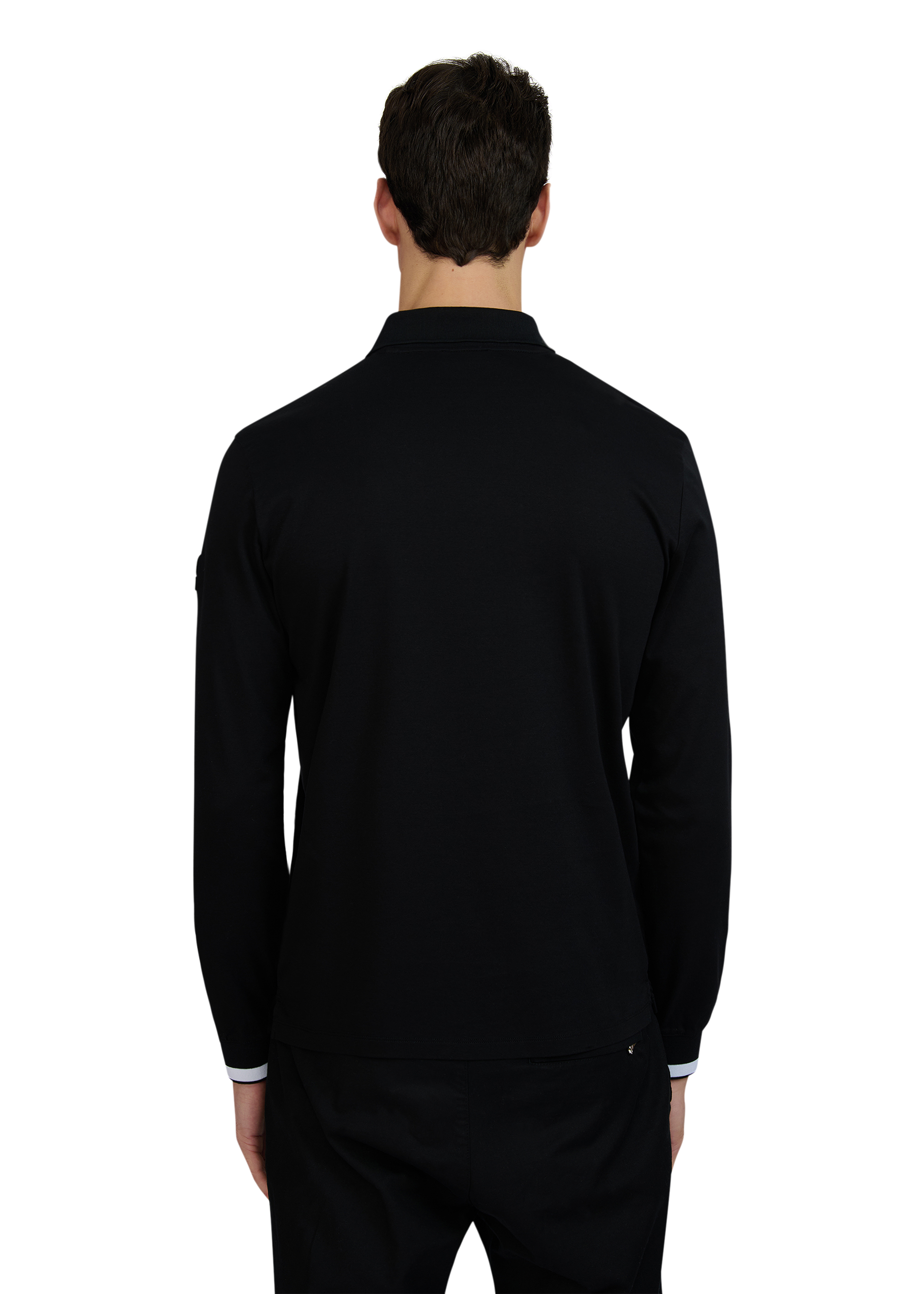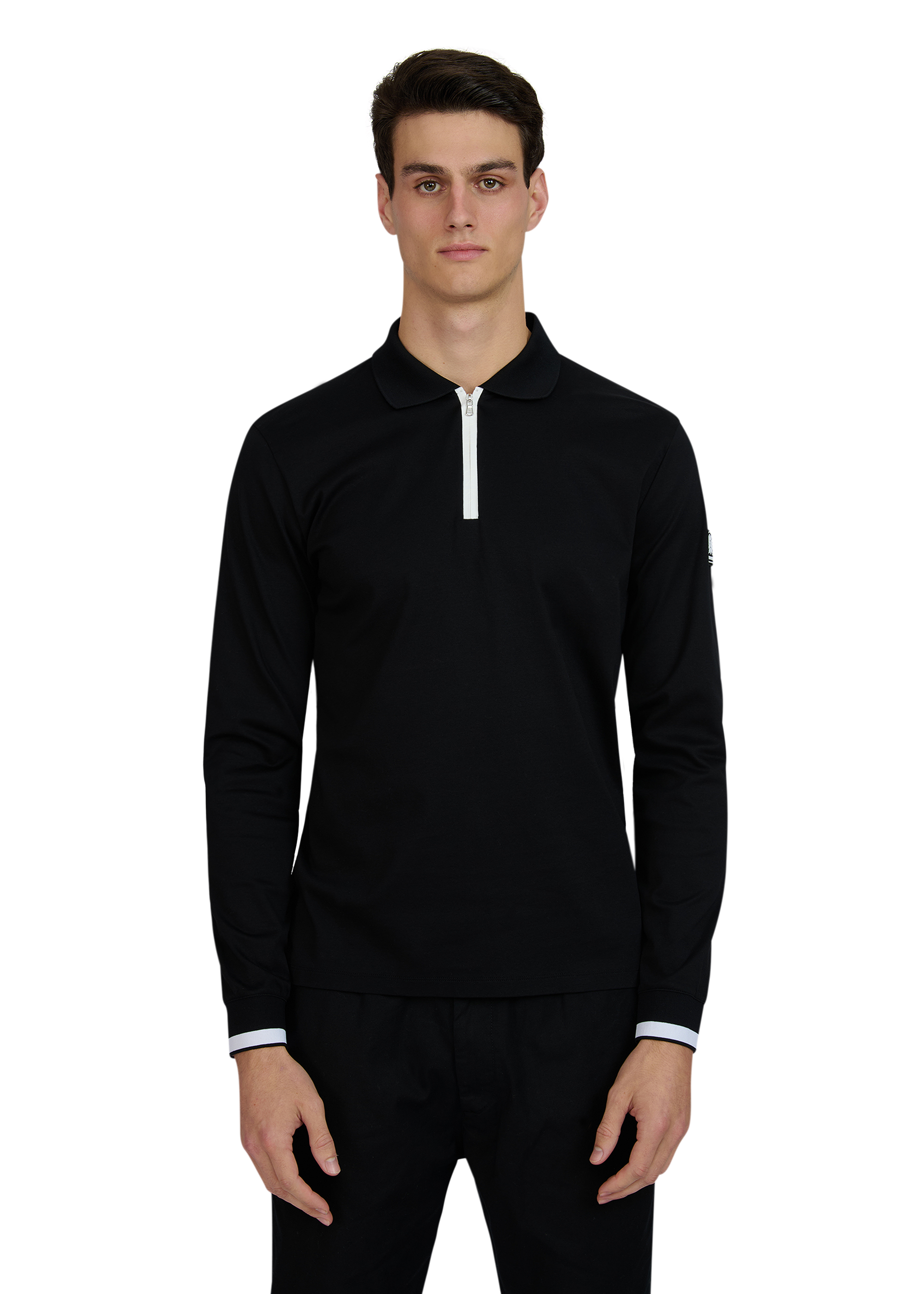 Sandbanks men's silicone zip long sleeve polo shirt in black, made from 100% mercerised interlock cotton. This slim fitting polo shirt features central Lampo silicone zip in white with print, sandbanks rubber badge on arm, white tipped knitted cuff and tri-colour back neck binding.