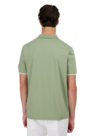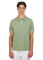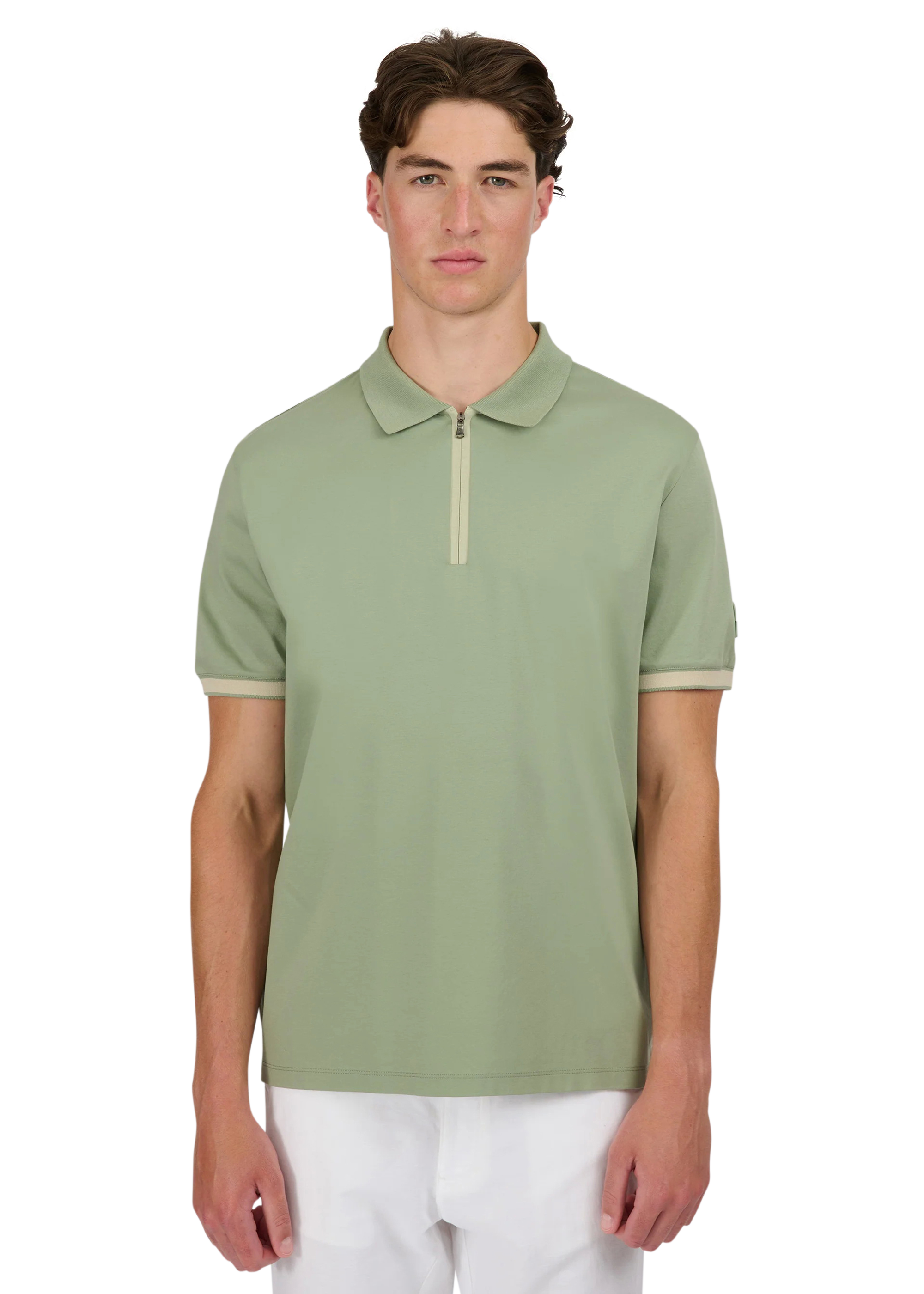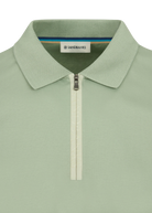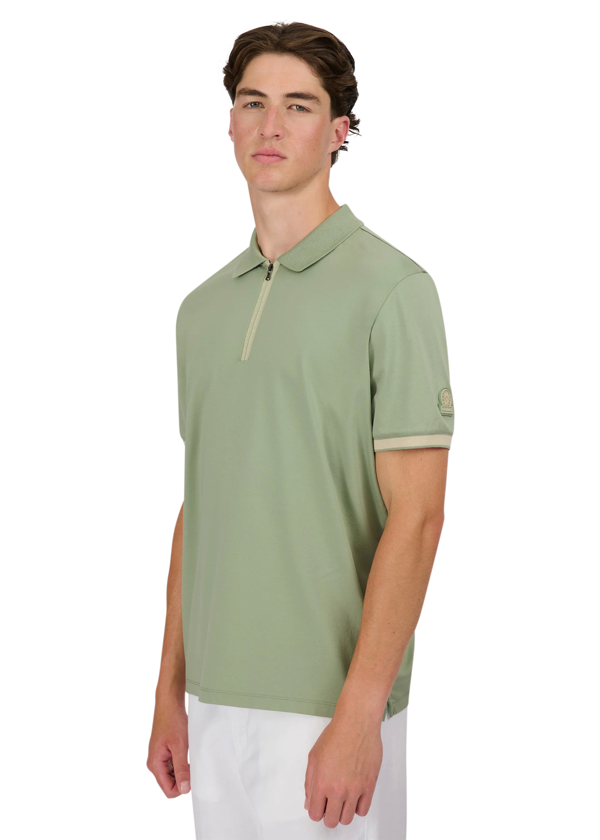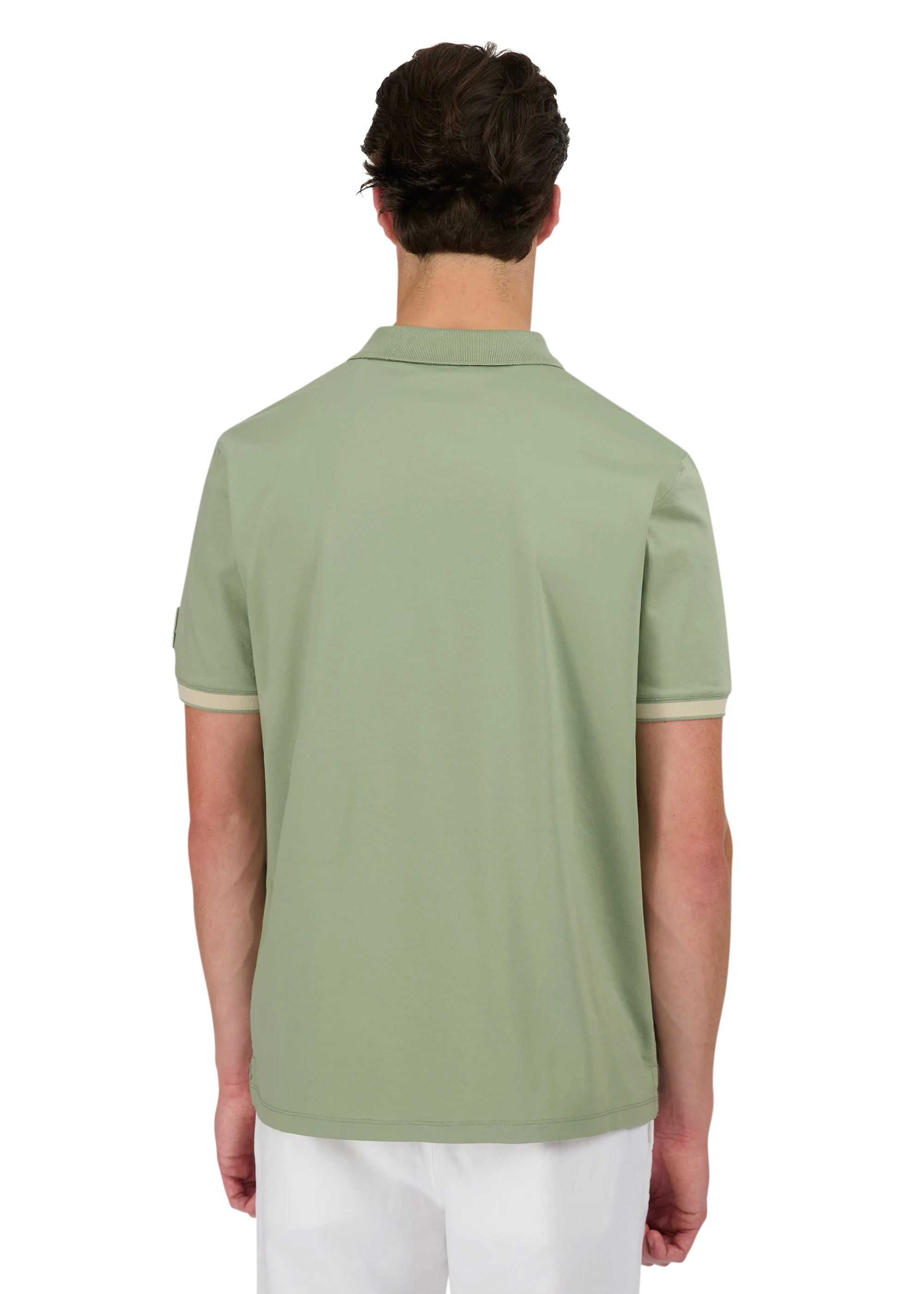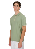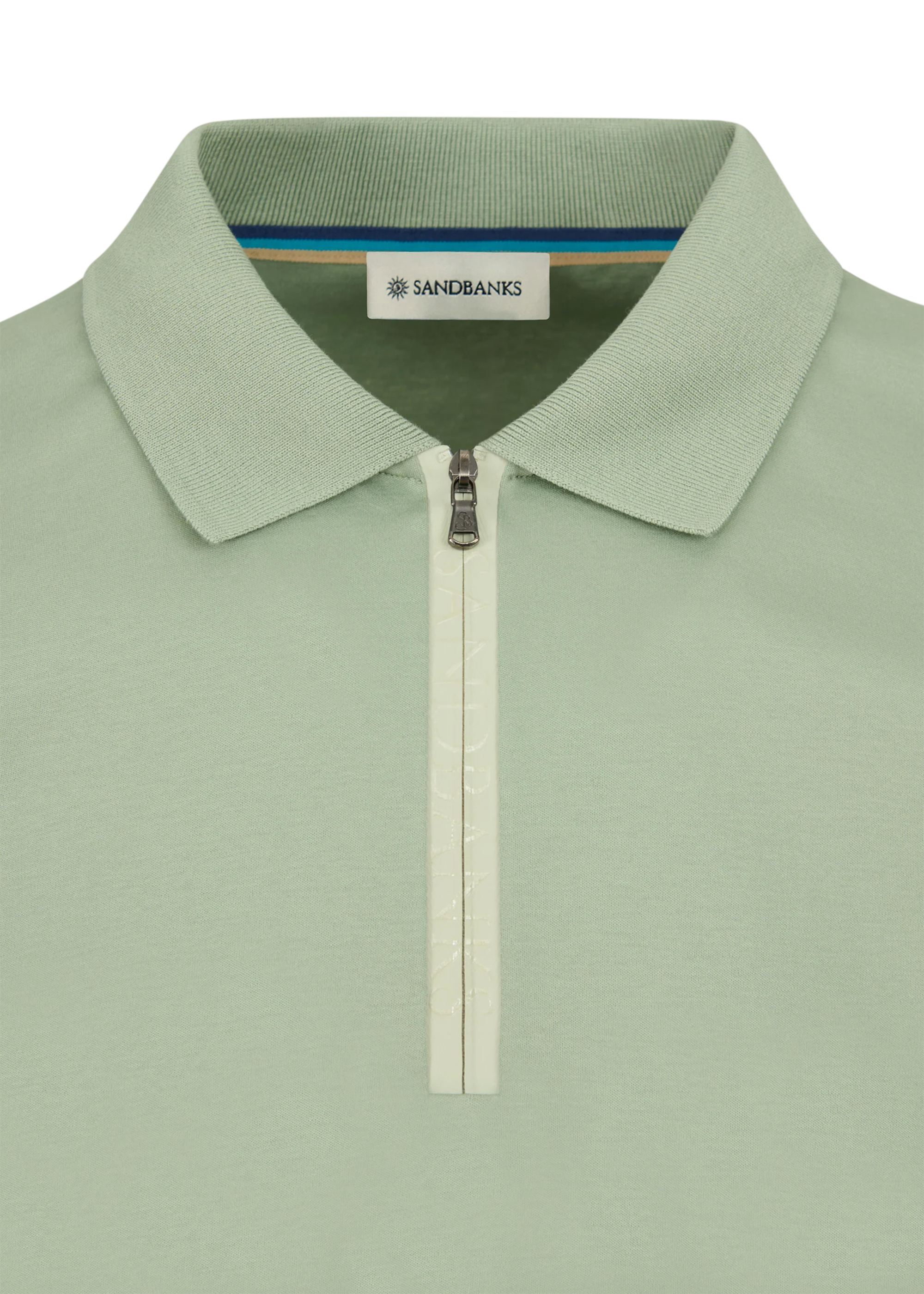 Sandbanks men's silicone zip polo shirt in sage, made from 100% mercerised interlock cotton. This classic fitting polo shirt features a central Lampo silicone zip in stone with tonal logo print, sandbanks rubber logo badge on sleeve, stone striped knitted cuffs and tri-colour back neck binding.