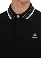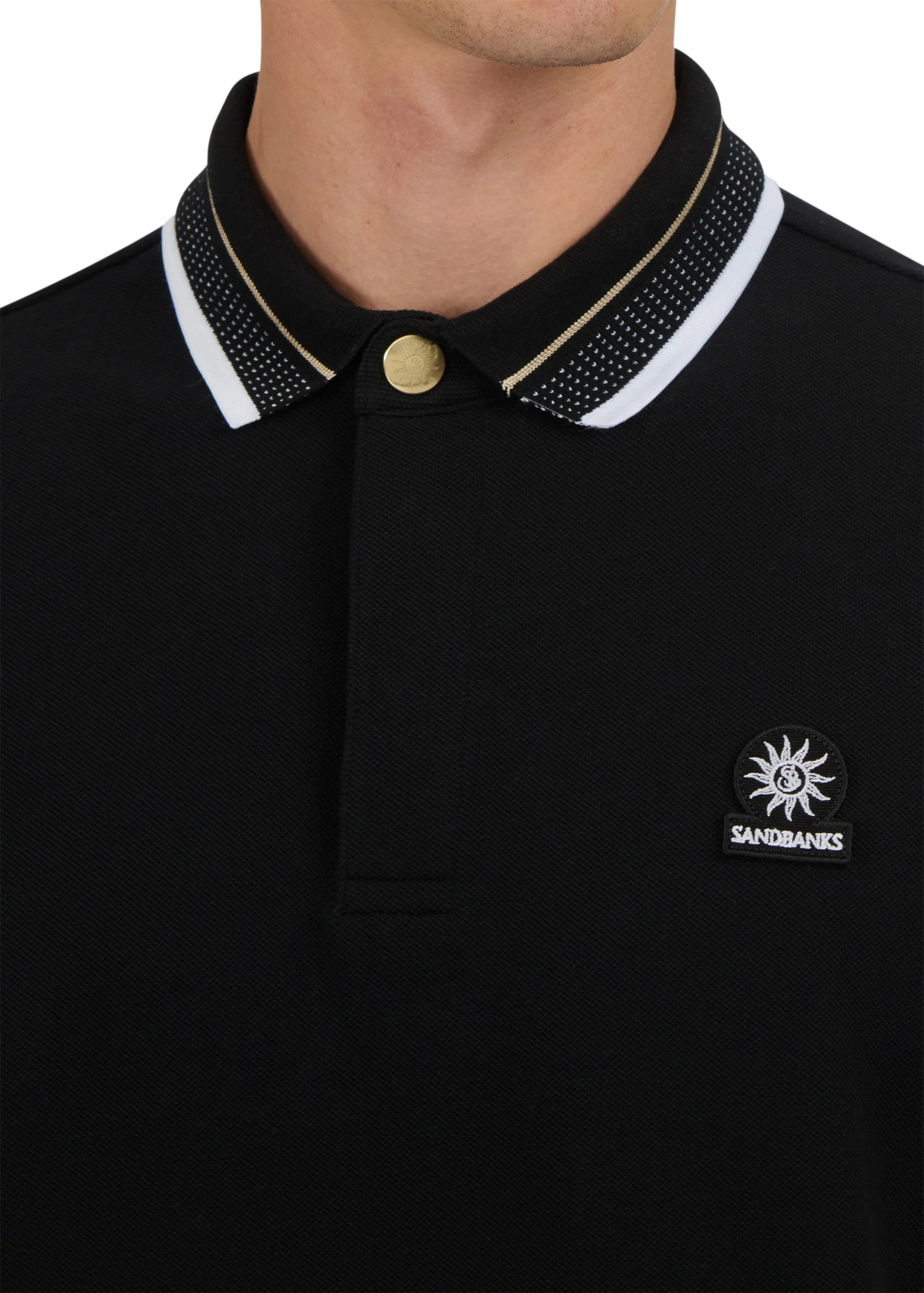 Sandbanks men's snap collar polo shirt in black, made from pique 100% bci cotton. This classic fitting polo shirt features a statement brushed gold snap popper on a collar stand, tipped ribbed collar, concealed button placket and embroidered chest badge.