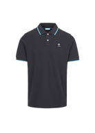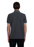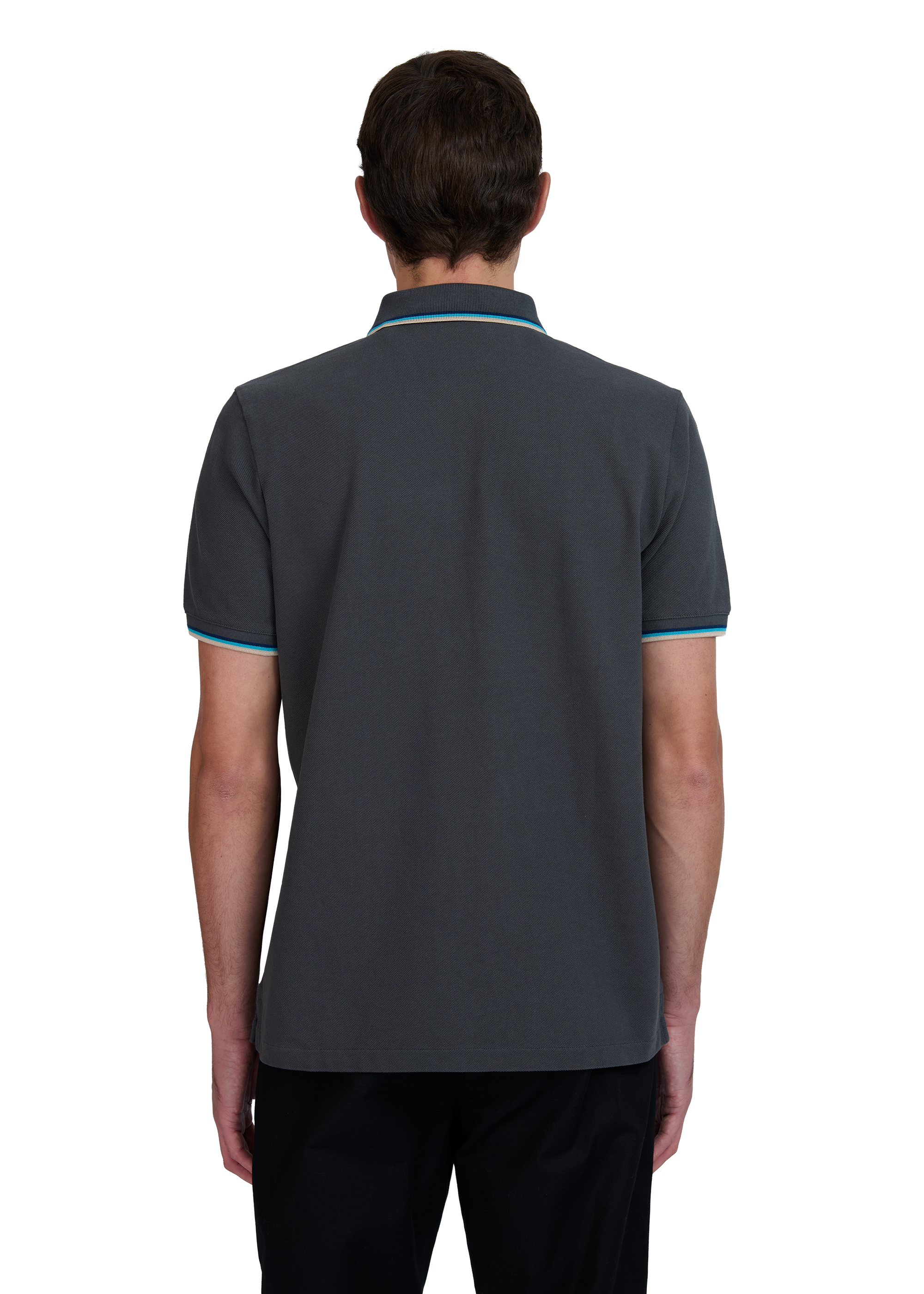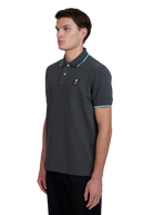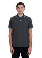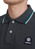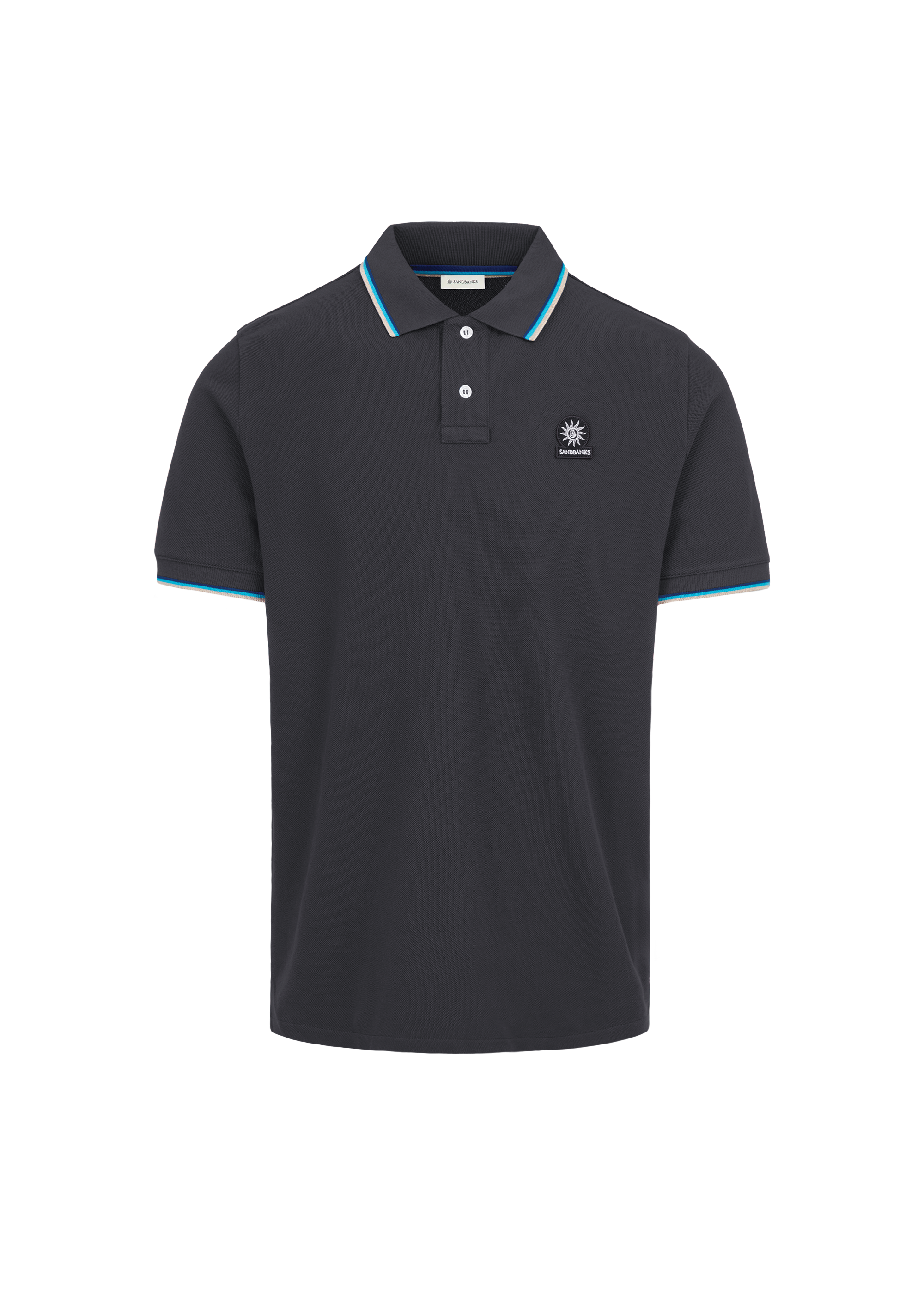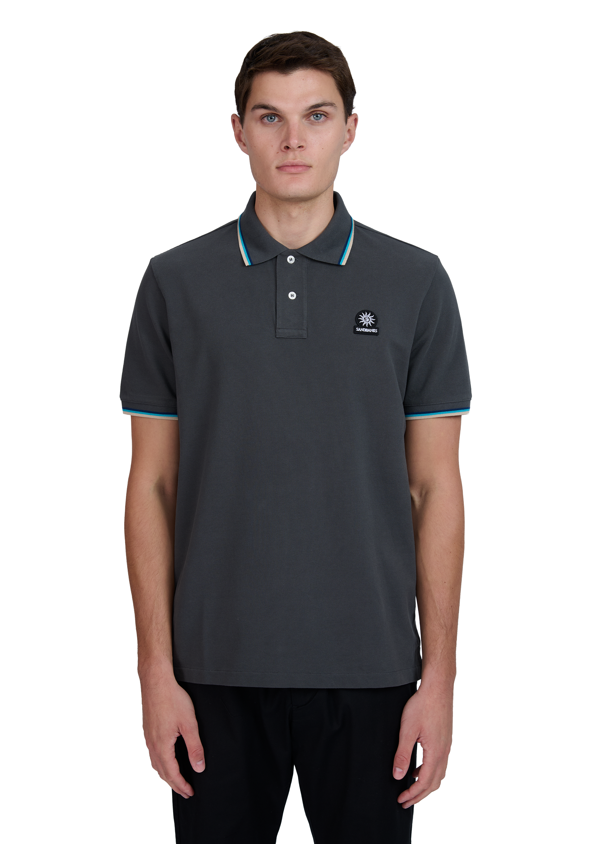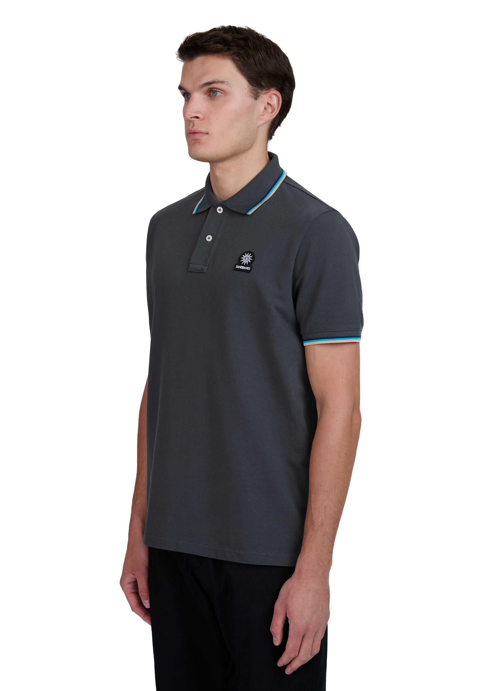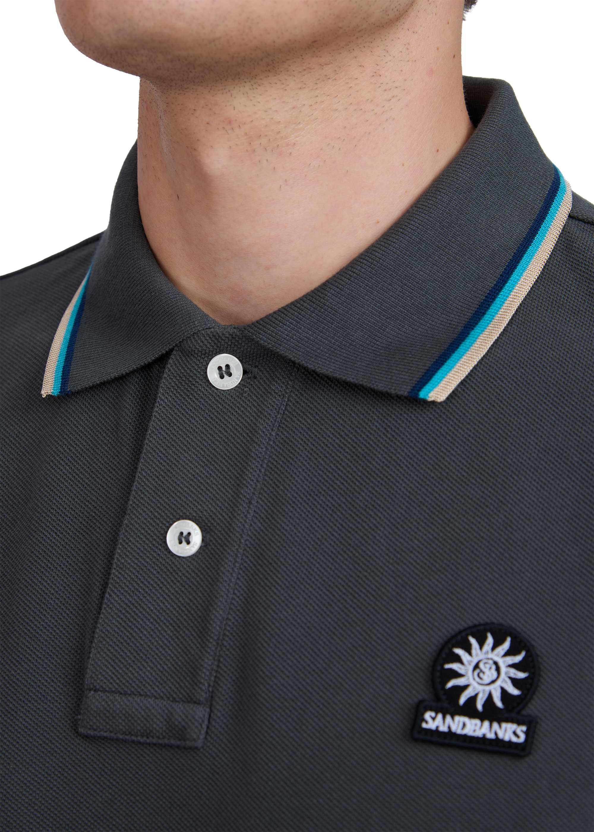 Sandbanks men's badge logo polo shirt in anthracite, made from 100% organic cotton. This classic fitting 2 button polo shirt features an embroidered badge logo on the chest, tri-colour tipped ribbed collar, cuff and back neck binding.