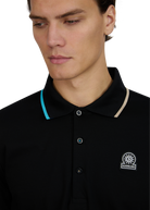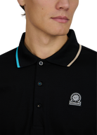 Sandbanks men’s tipped collar long sleeve Polo in black, crafted from 100% cotton. This slim-fitting polo shirt features a tri-colour tipped collar, three-button placket with tri-colour thread, and is finished with the Sandbanks silicone badge.