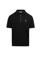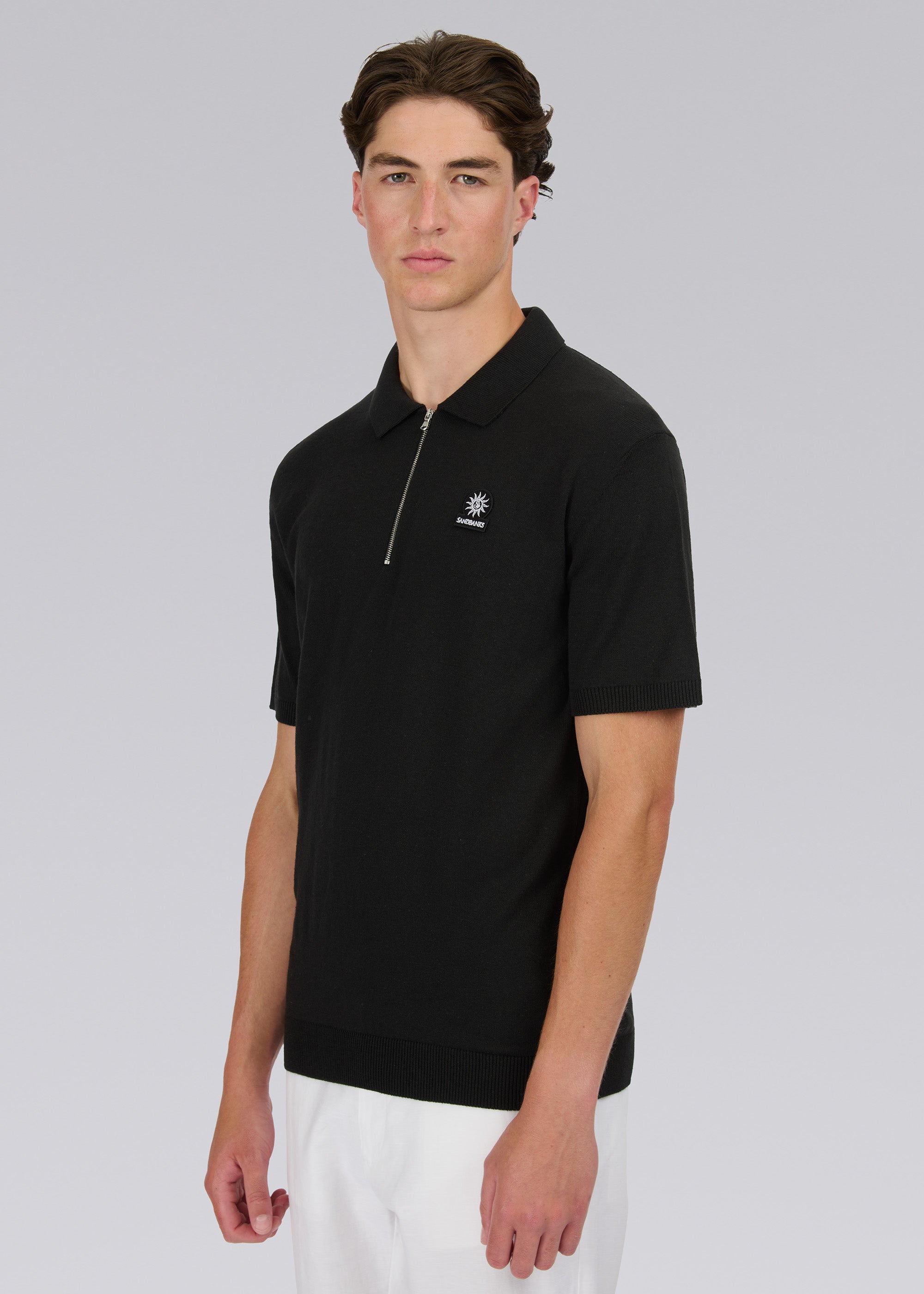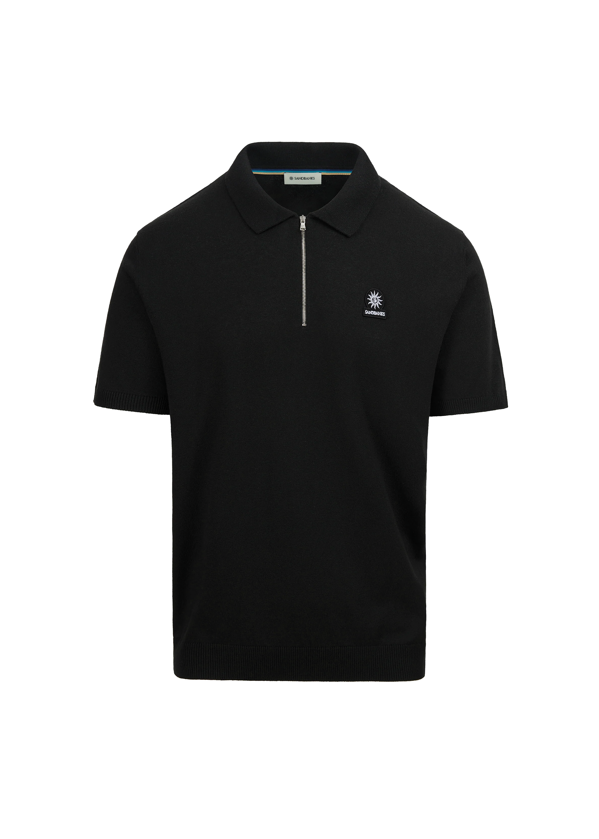 Sandbanks men's fine gauge knitted zip polo shirt in black, made from Ecotec® cotton blend yarns. This polo shirt features a metal Lampo zip with SB engraved puller, Sandbanks embroidered chest badge, ribbed collar, cuffs and hem.