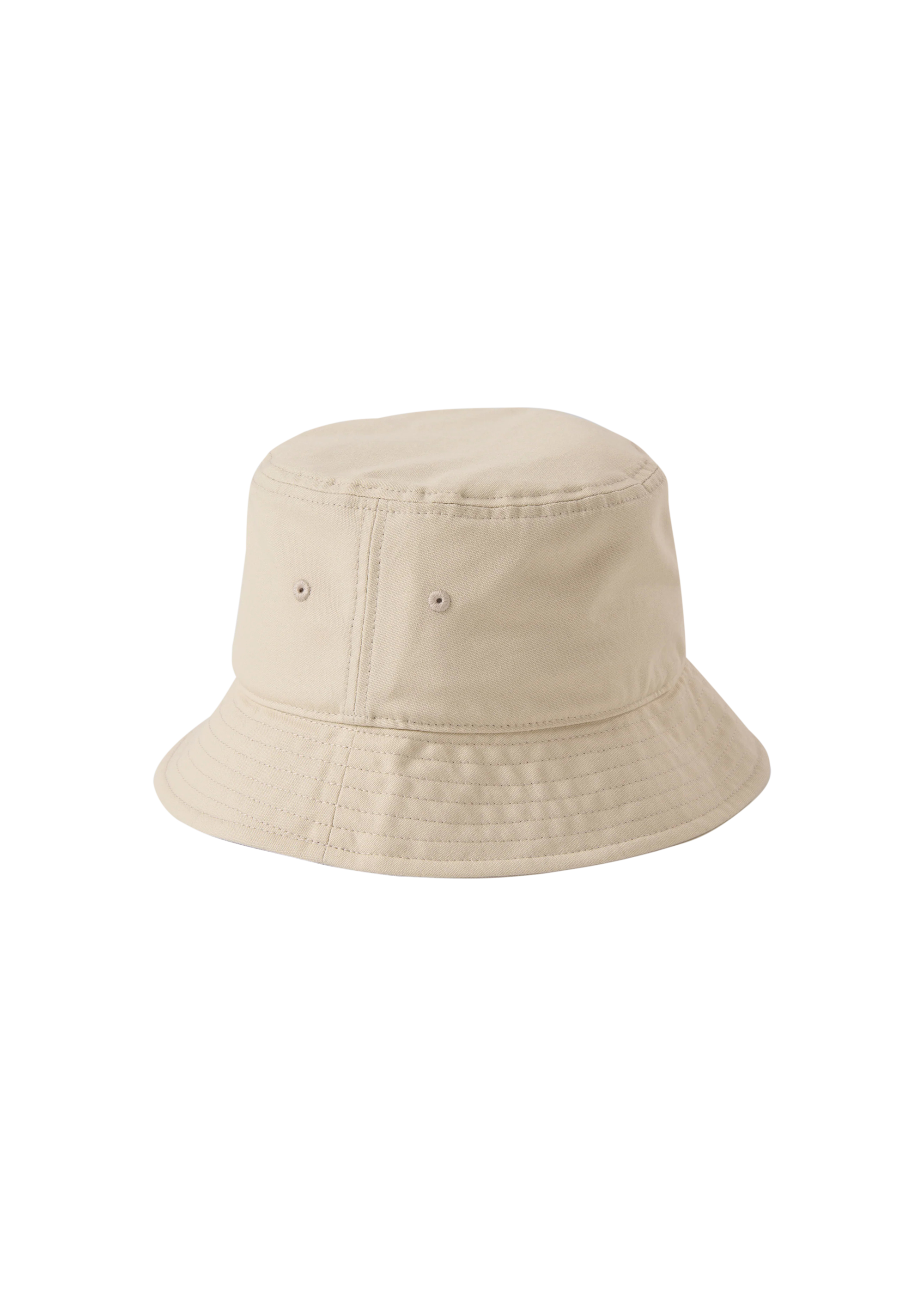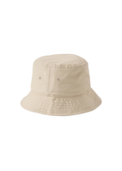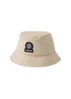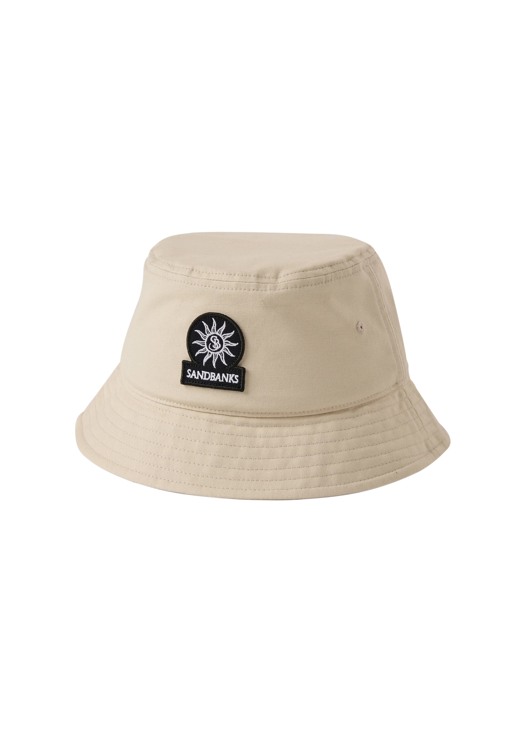 Sandbanks badge logo bucket hat in stone made from 100% organic cotton, featuring black badge logo with white embroidery, internal Sandbanks binding and embroidered eyelets.