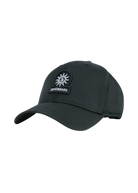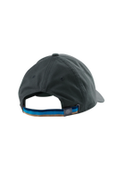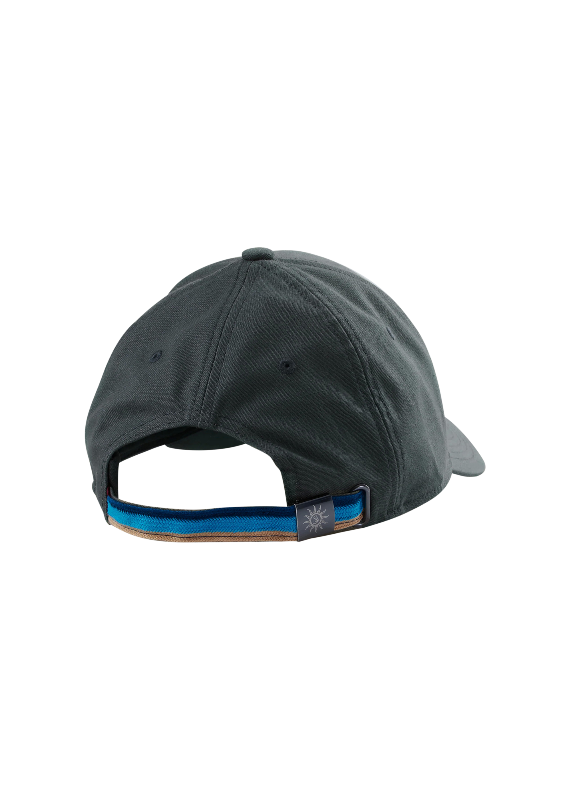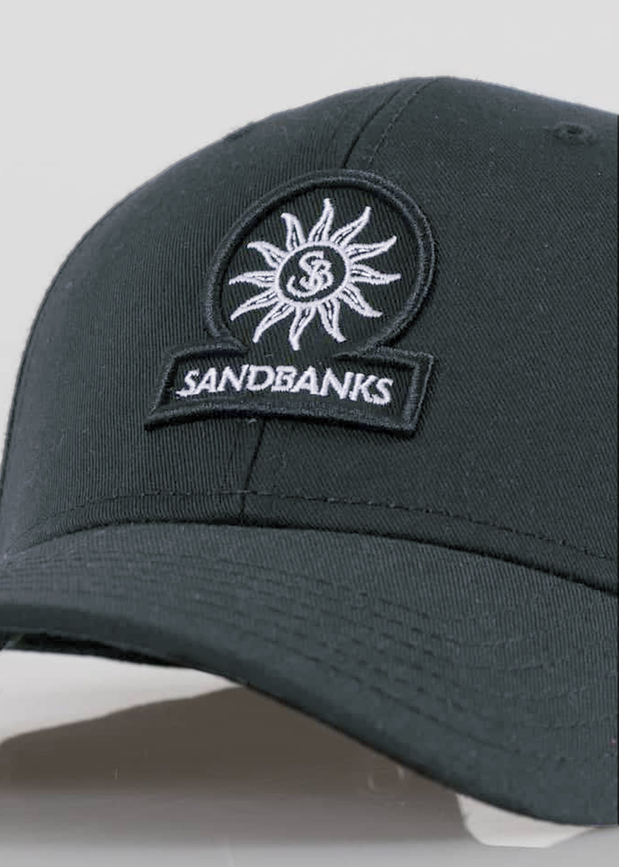 Sandbanks Badge Logo strap-back cap in anthracite with black badge and white embroidered logo made entirely from recycled polyester (plastic bottles) and features, knitted tri-colour rear strap and laser engraved SB logo fastener in gun metal.