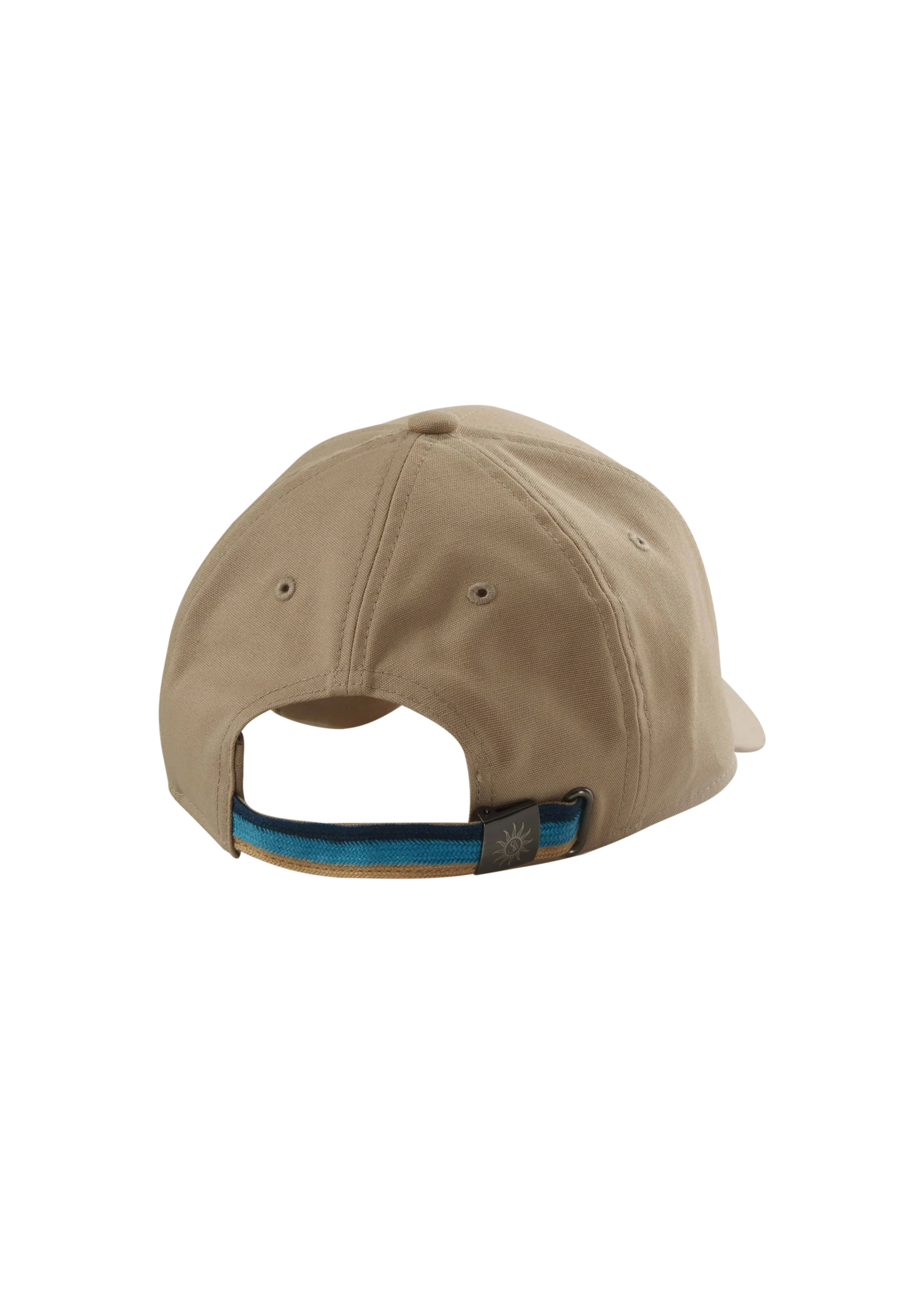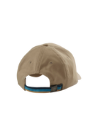 Sandbanks Badge Logo strap-back cap in sand made from 100% organic cotton and features sand badge with black embroidery,  knitted tri-colour rear strap and laser engraved SB logo fastener in gun metal.