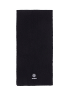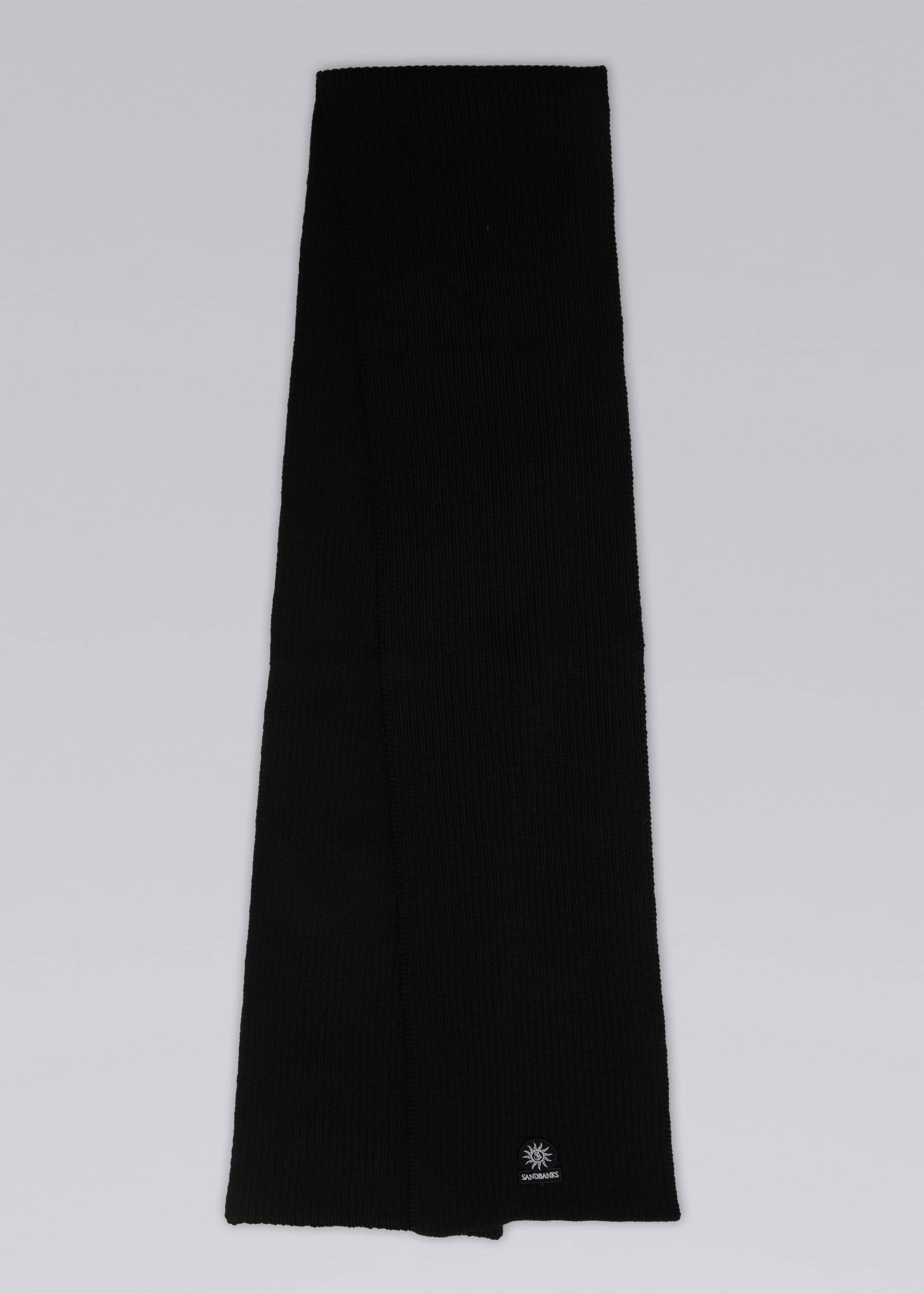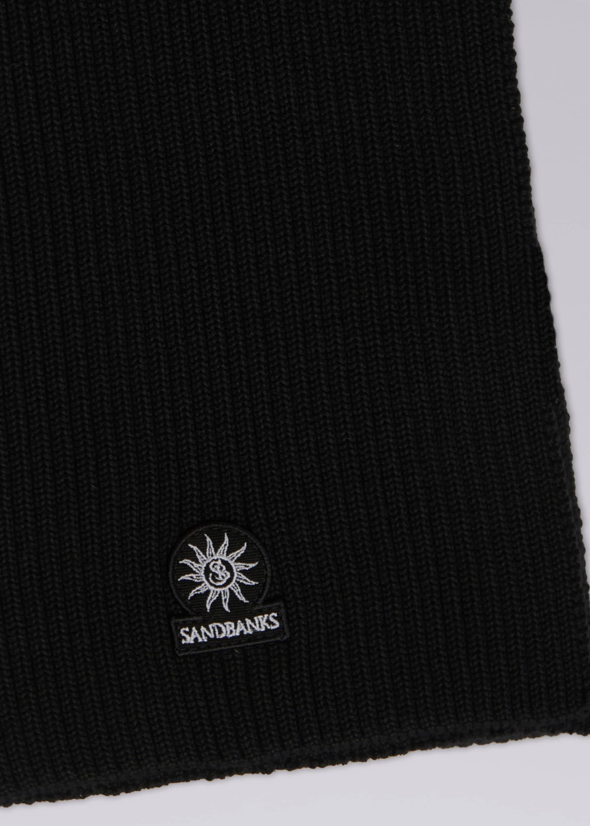 Sandbanks knitted badge logo scarf in black, made from merino wool mix.