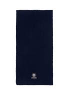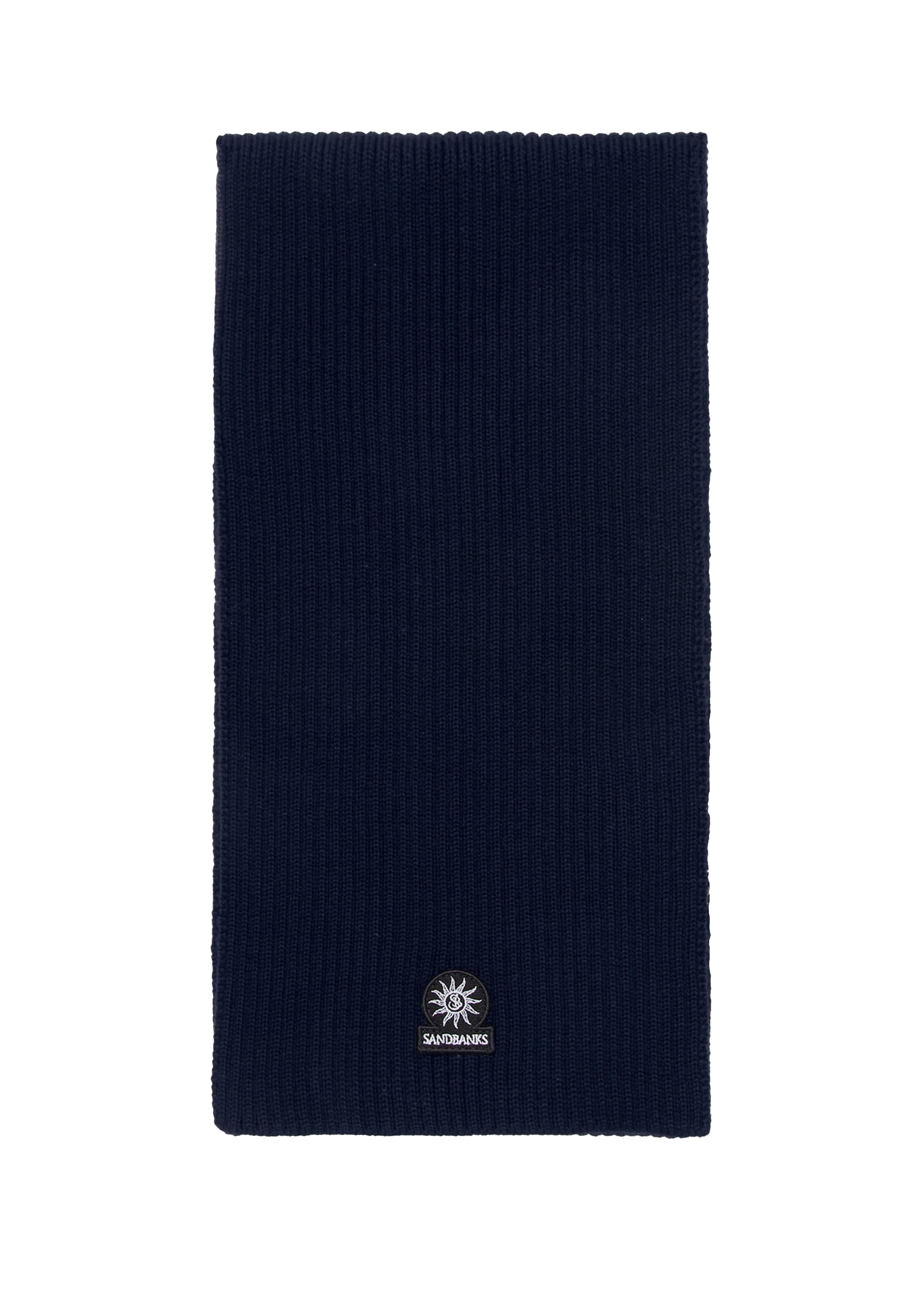 Sandbanks knitted badge logo scarf in navy, made from merino wool mix.