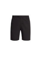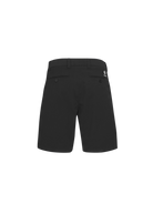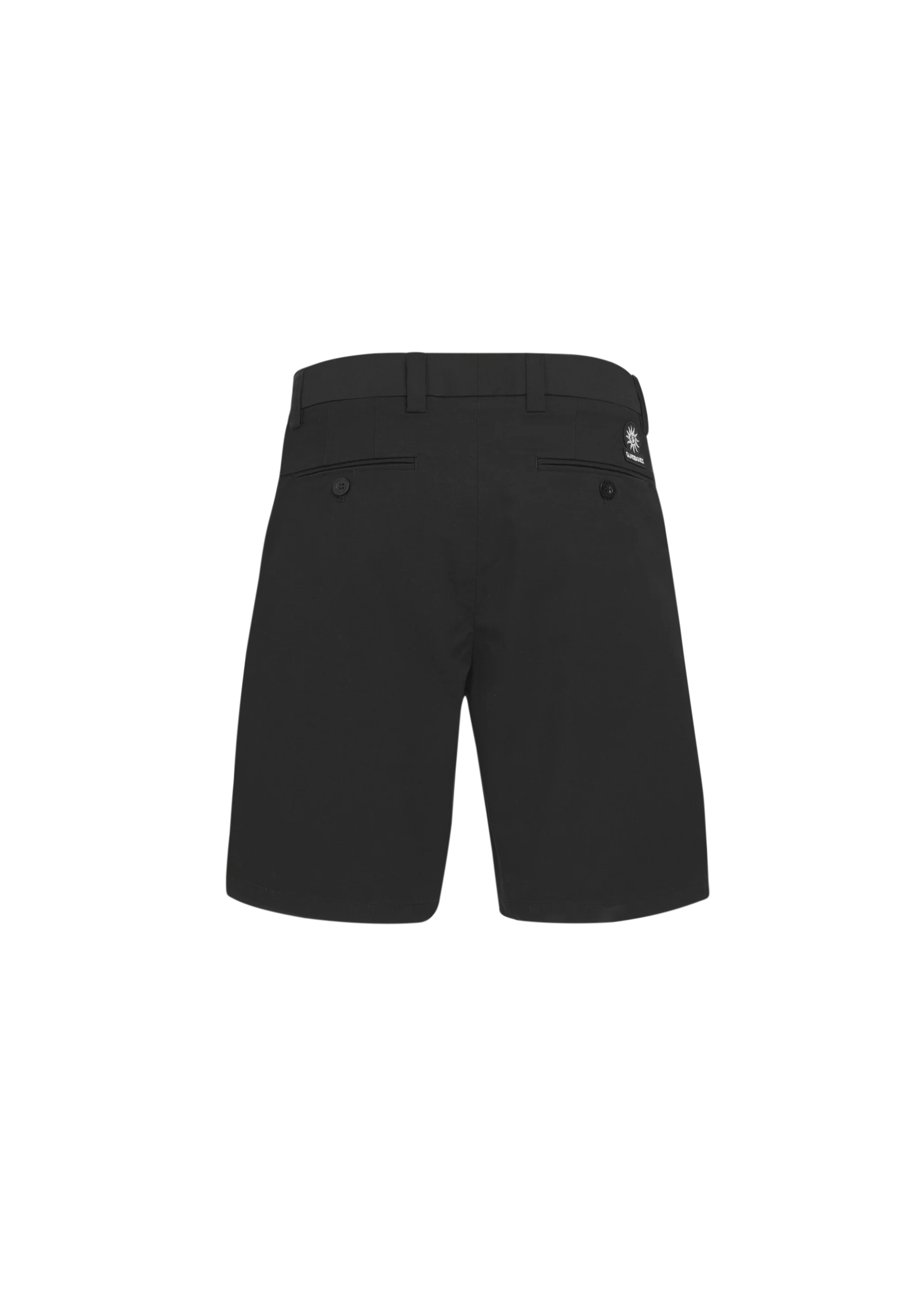 Sandbanks men's badge logo chino short in black, made from 97% Organic Cotton and 3% Elastane to allow for a comfortable fit. This chino short features a Sandbanks logo badge embroidery on the back, sandbanks branded buttons, front YKK zip, tri-colour turn back tab and belt loops.