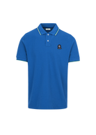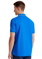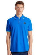 Sandbanks men's badge logo polo shirt in nautical blue, made from 100% organic cotton. This classic fitting 2 button polo shirt features an embroidered badge logo on the chest, tri-colour tipped ribbed collar, cuff and back neck binding.
