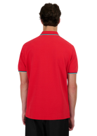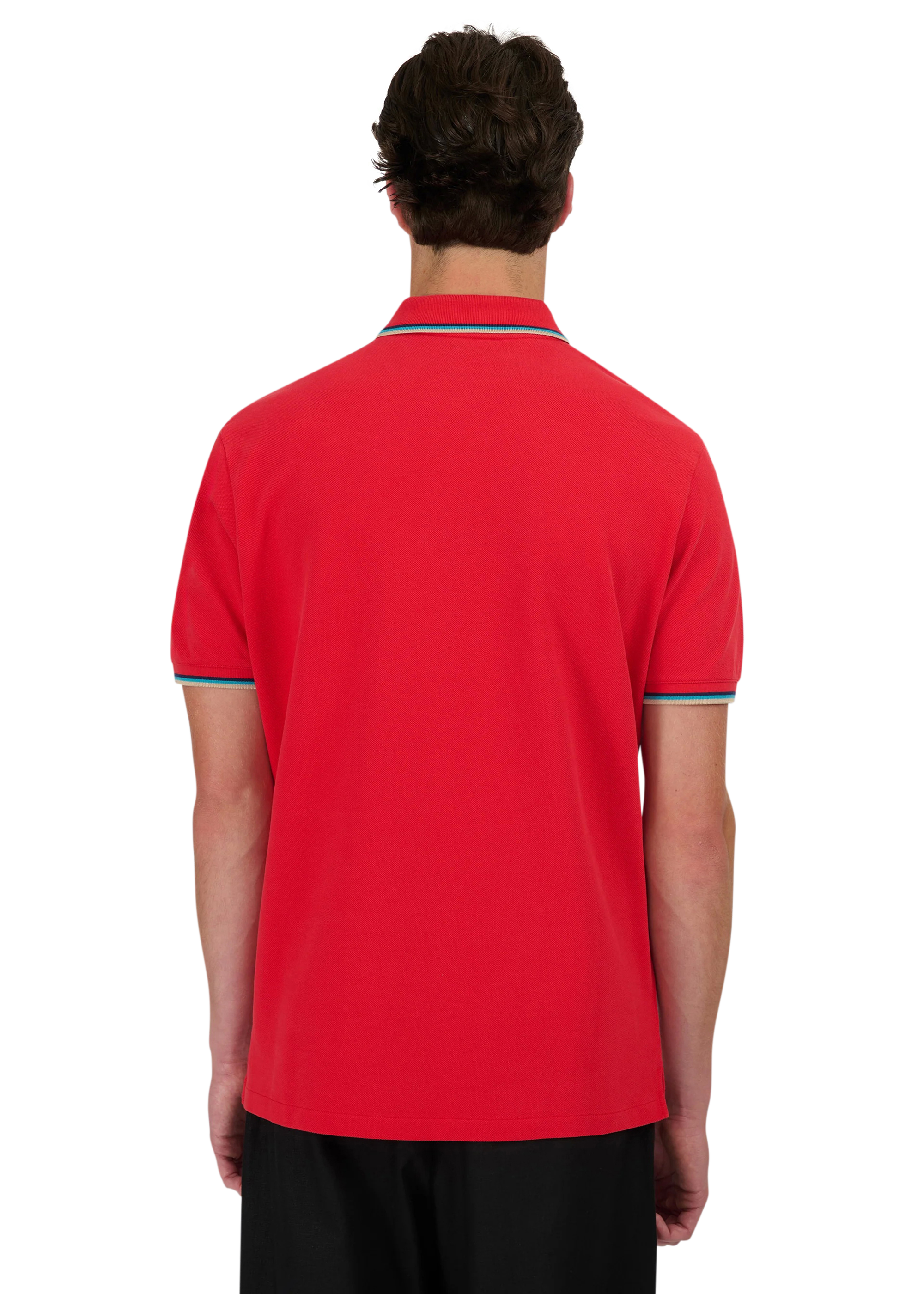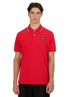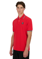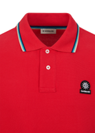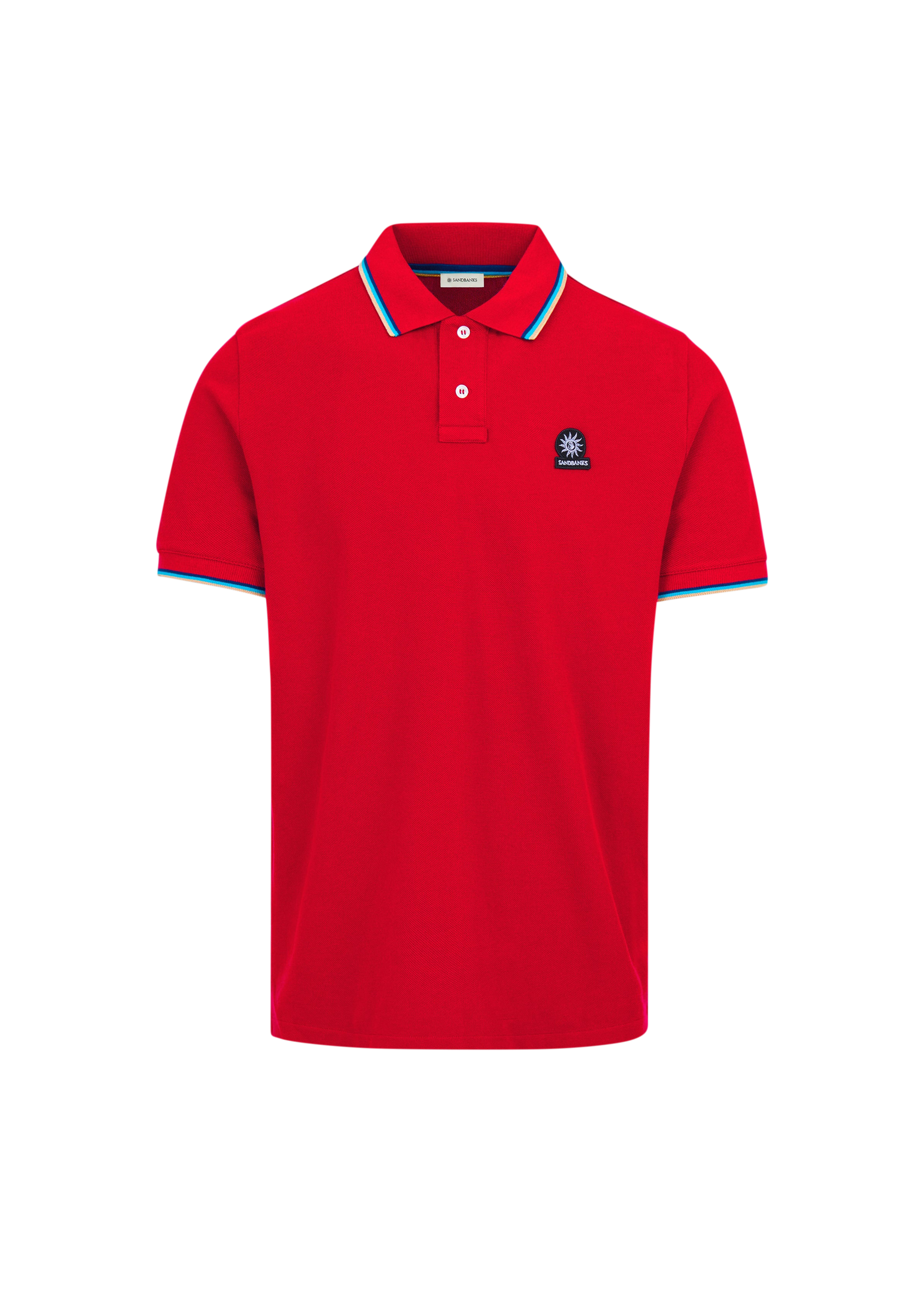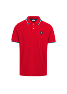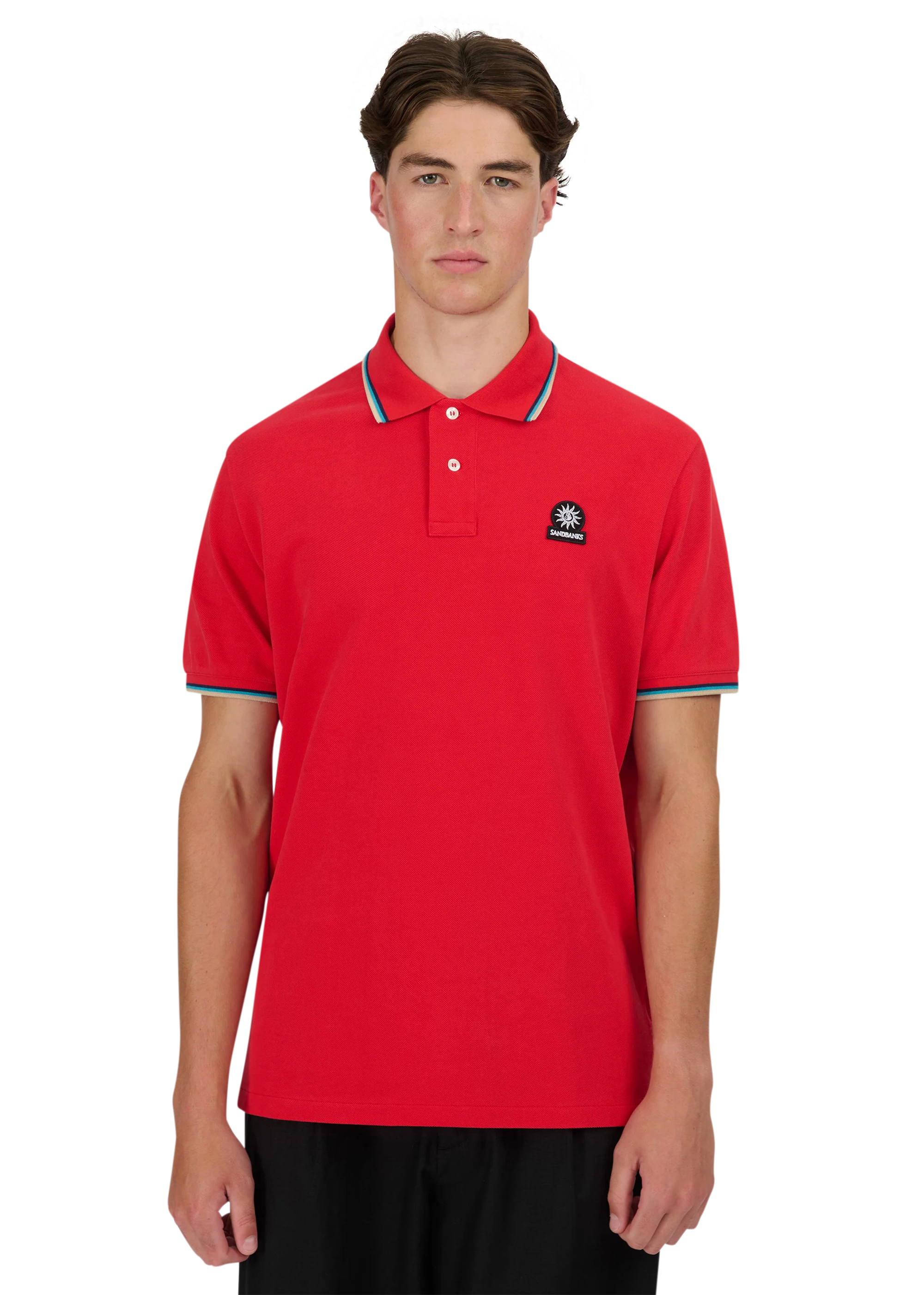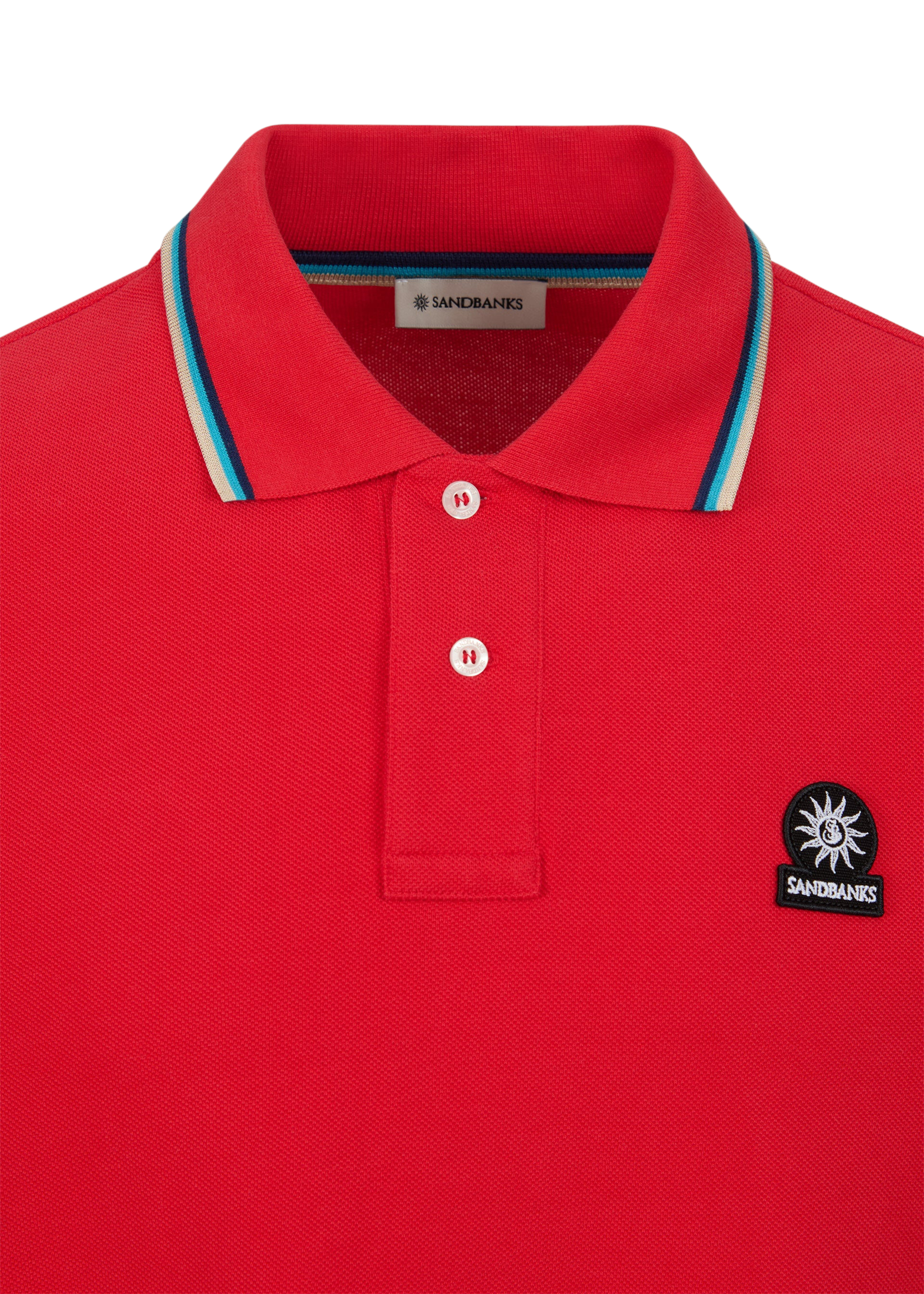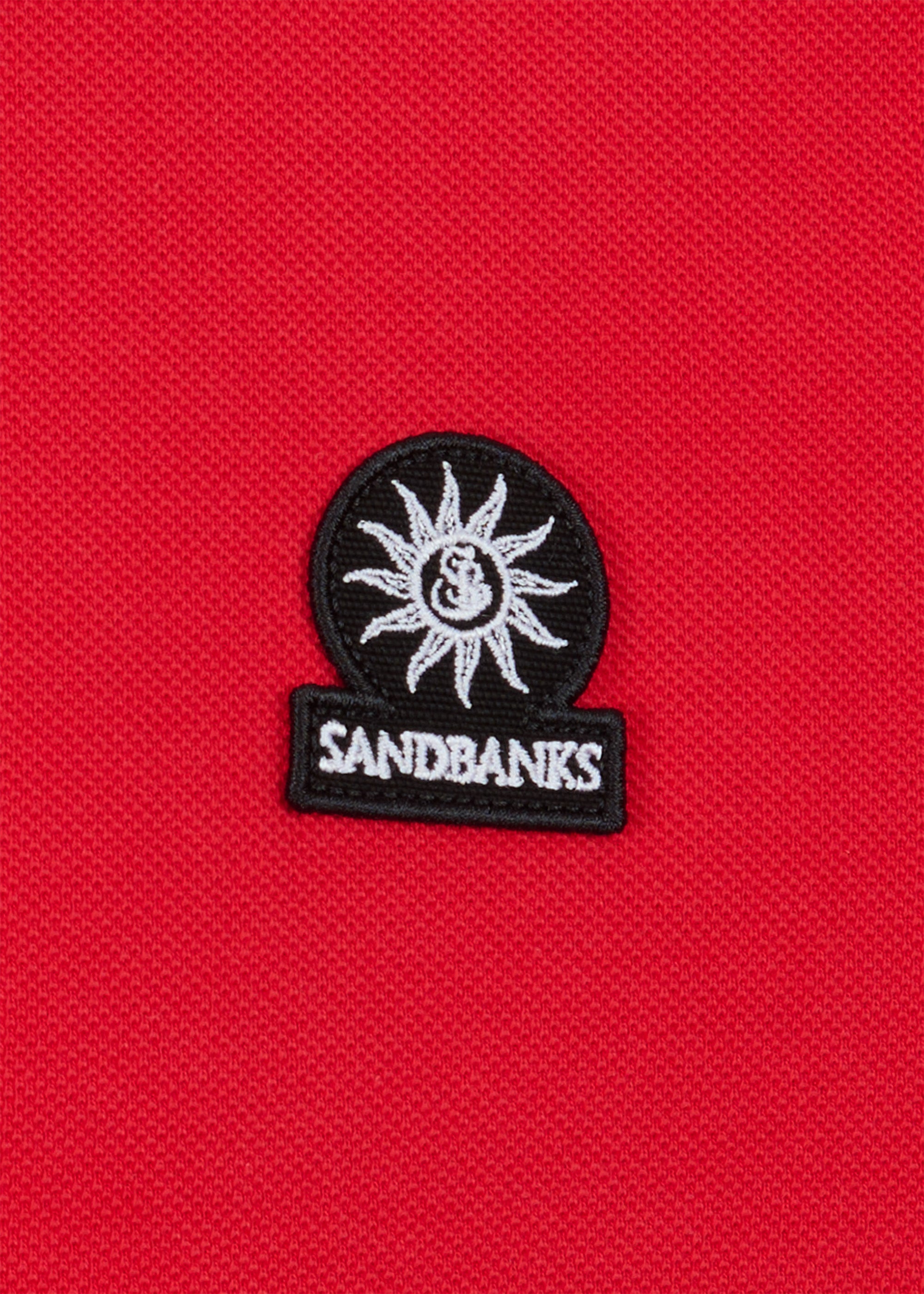 Sandbanks men's badge logo polo shirt in red, made from 100% organic cotton. This classic fitting 2 button polo shirt features an embroidered badge logo on the chest, tri-colour tipped ribbed collar, cuff and back neck binding.