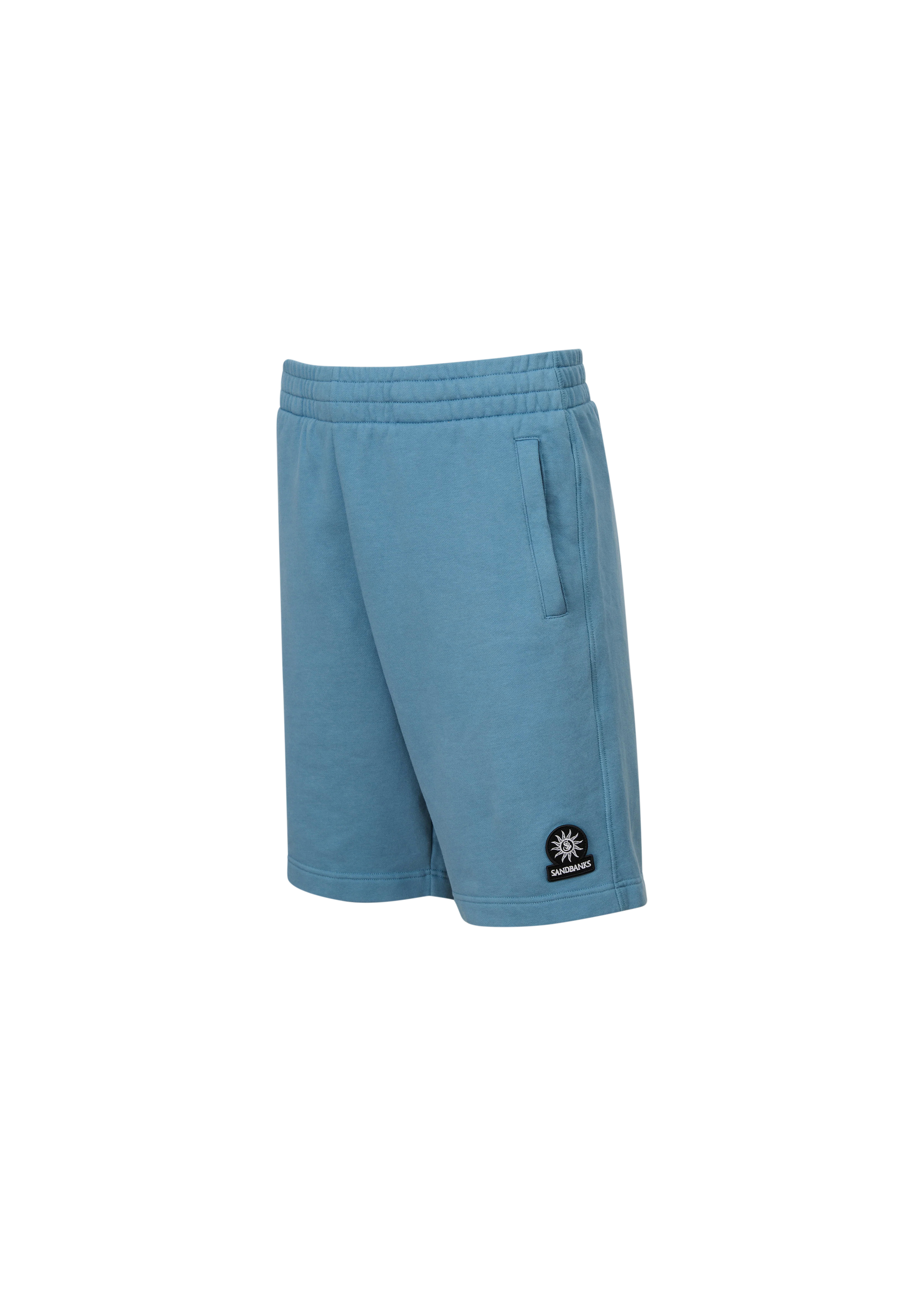 Sandbanks badge logo sweat shorts in teal constructed with a 400gsm diagonal weave knitted fabric that features a slight brushed back for a superior soft feeling, whilst remaining breathable. Made from a 95% cotton 5% elastane for improved feel, shape retention, finished with an embroidered badge logo, and side zip pockets with engraved pullers.