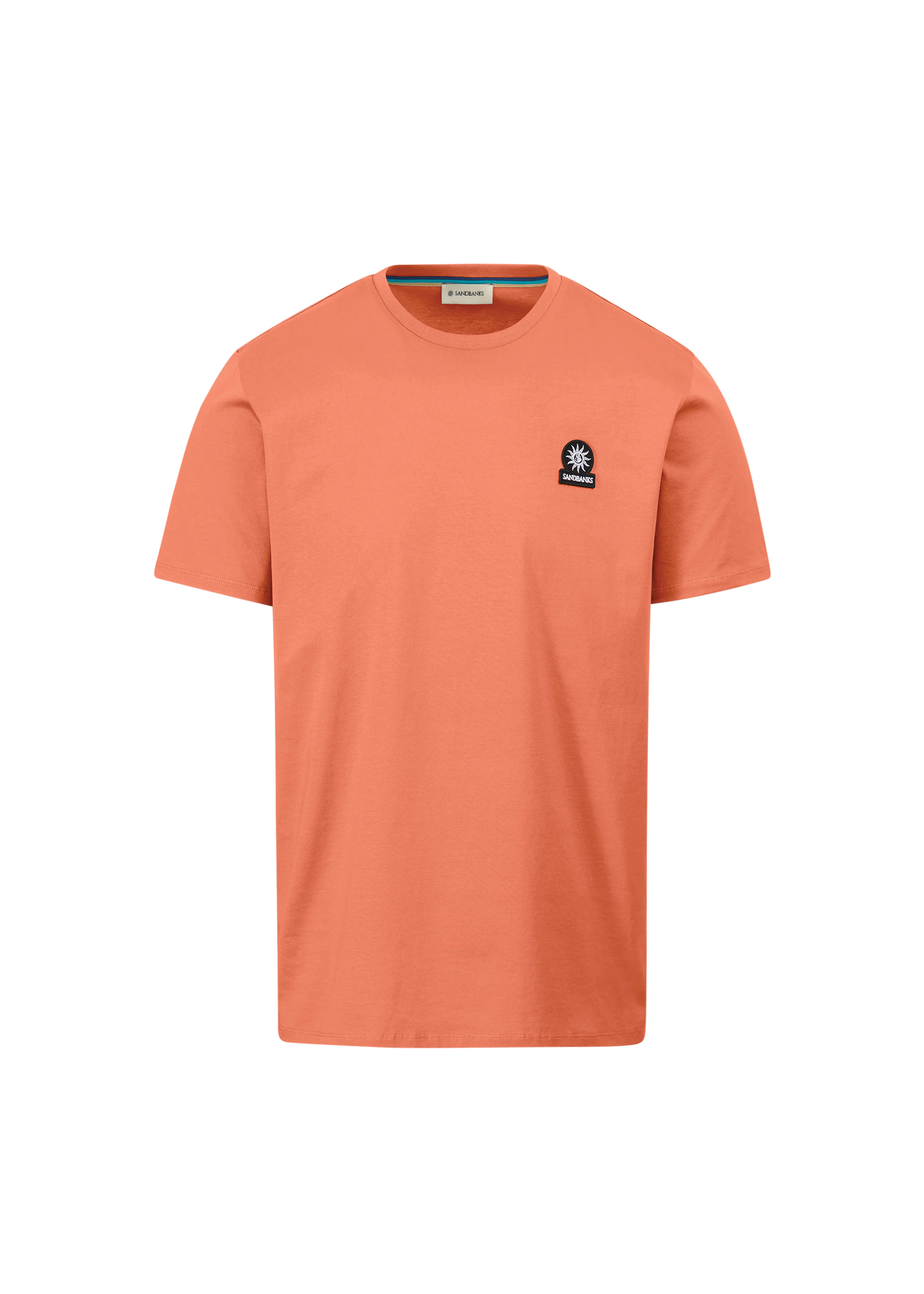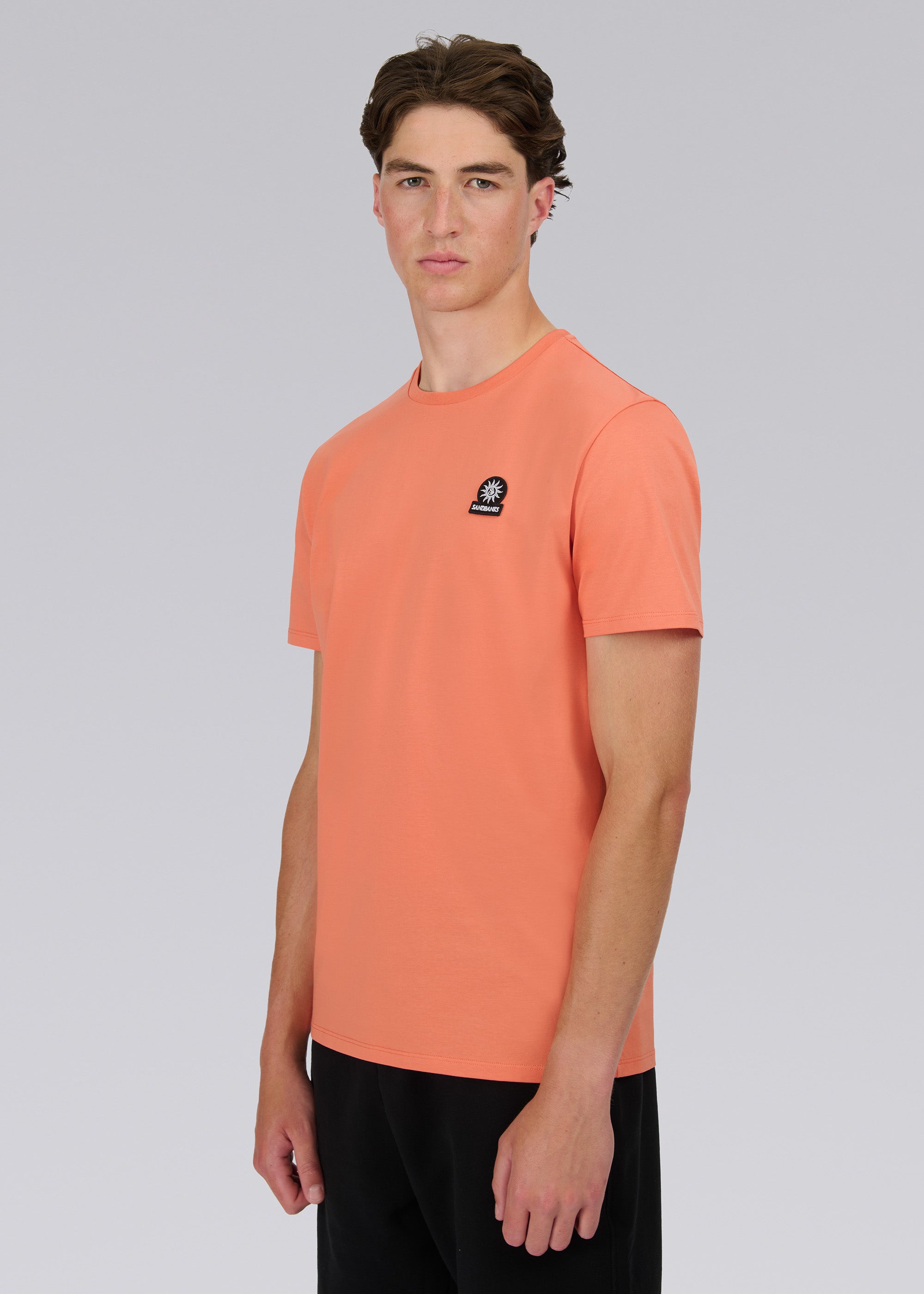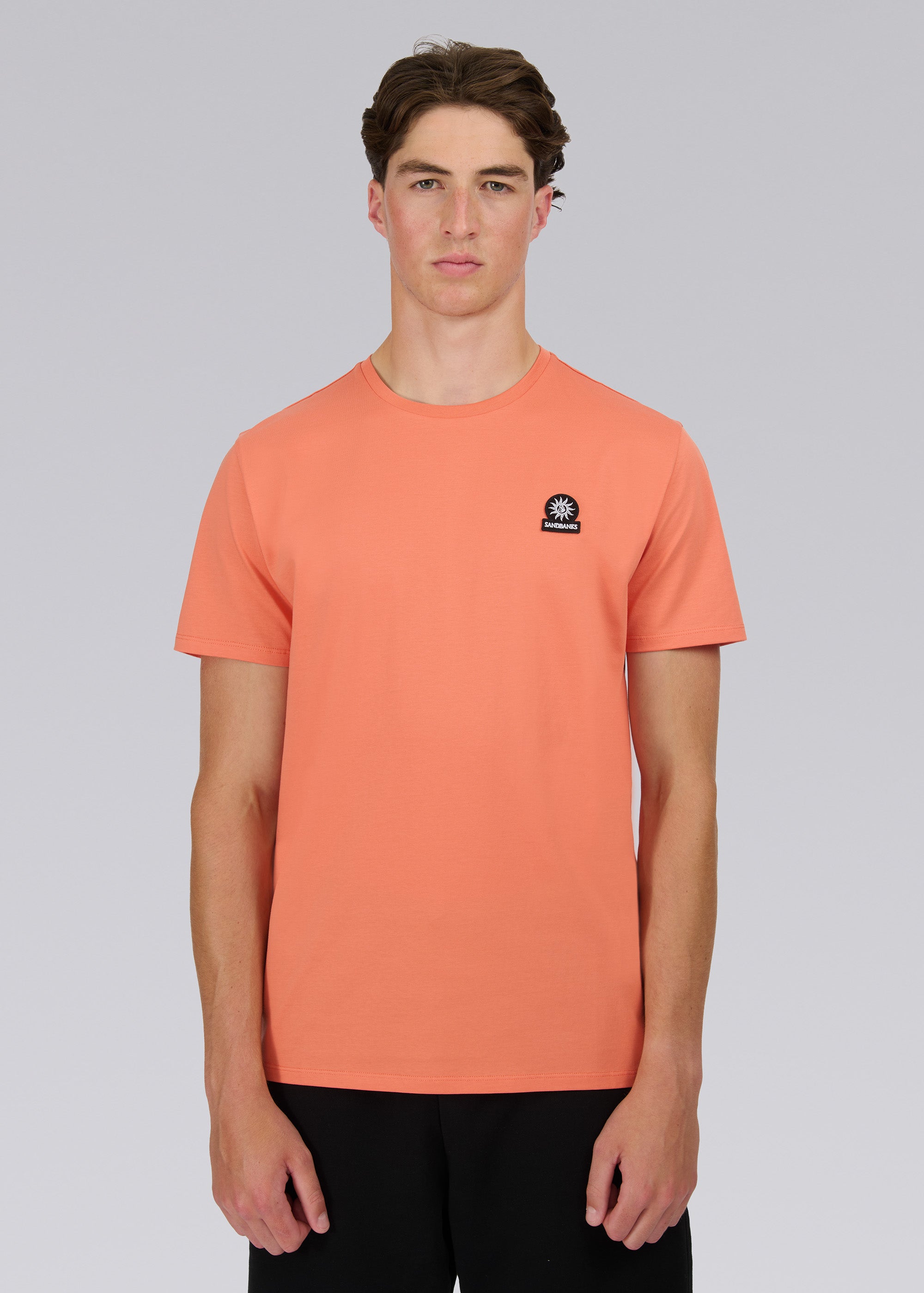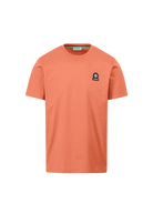 Sandbanks men's badge logo t-shirt in coral, made from mercerised cotton for a silky and luxurious feel. This classic fitting crew neck t-shirt features an embroidered badge logo on the chest and tri-colour back neck binding.