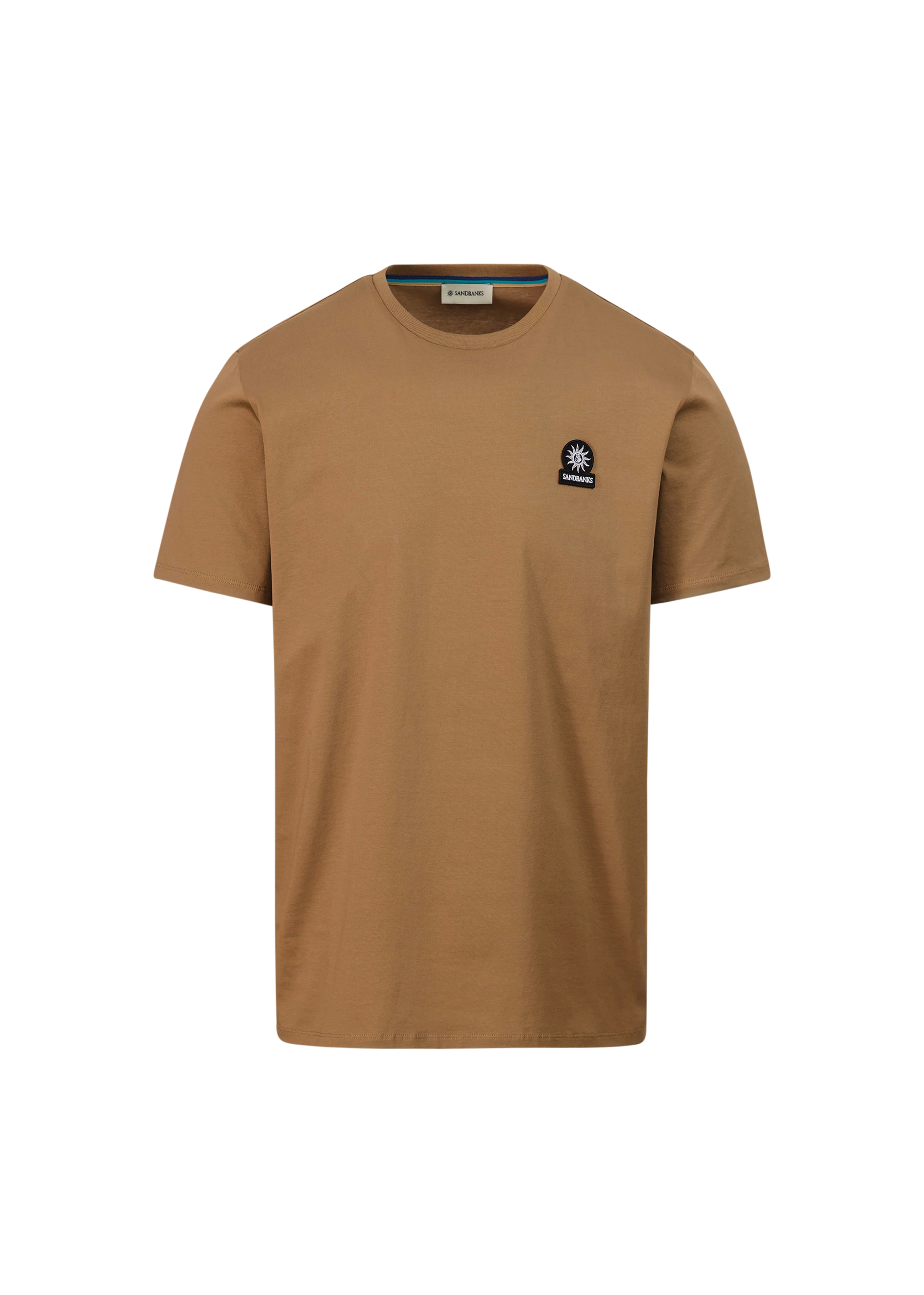 Sandbanks men's badge logo t-shirt in light brown, made from mercerised cotton for a silky and luxurious feel. This classic fitting crew neck t-shirt features an embroidered badge logo on the chest and tri-colour back neck binding.