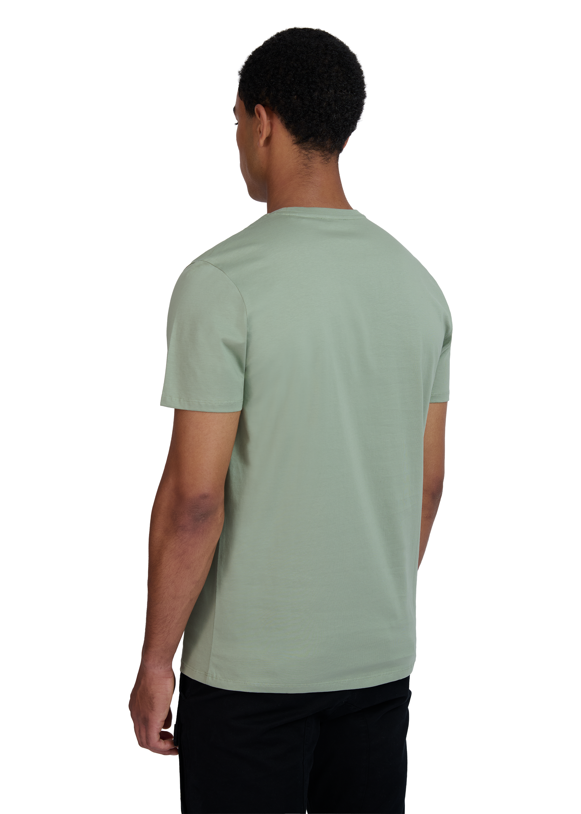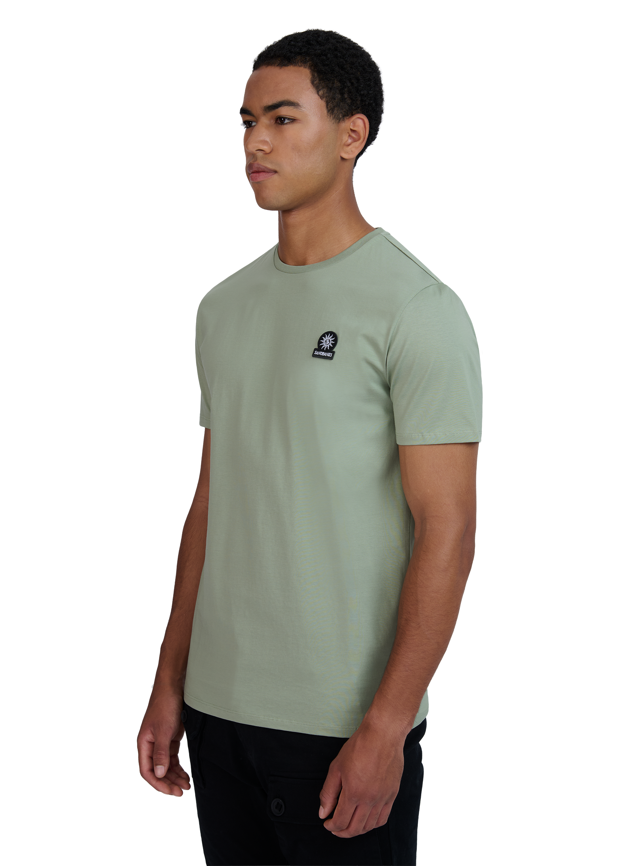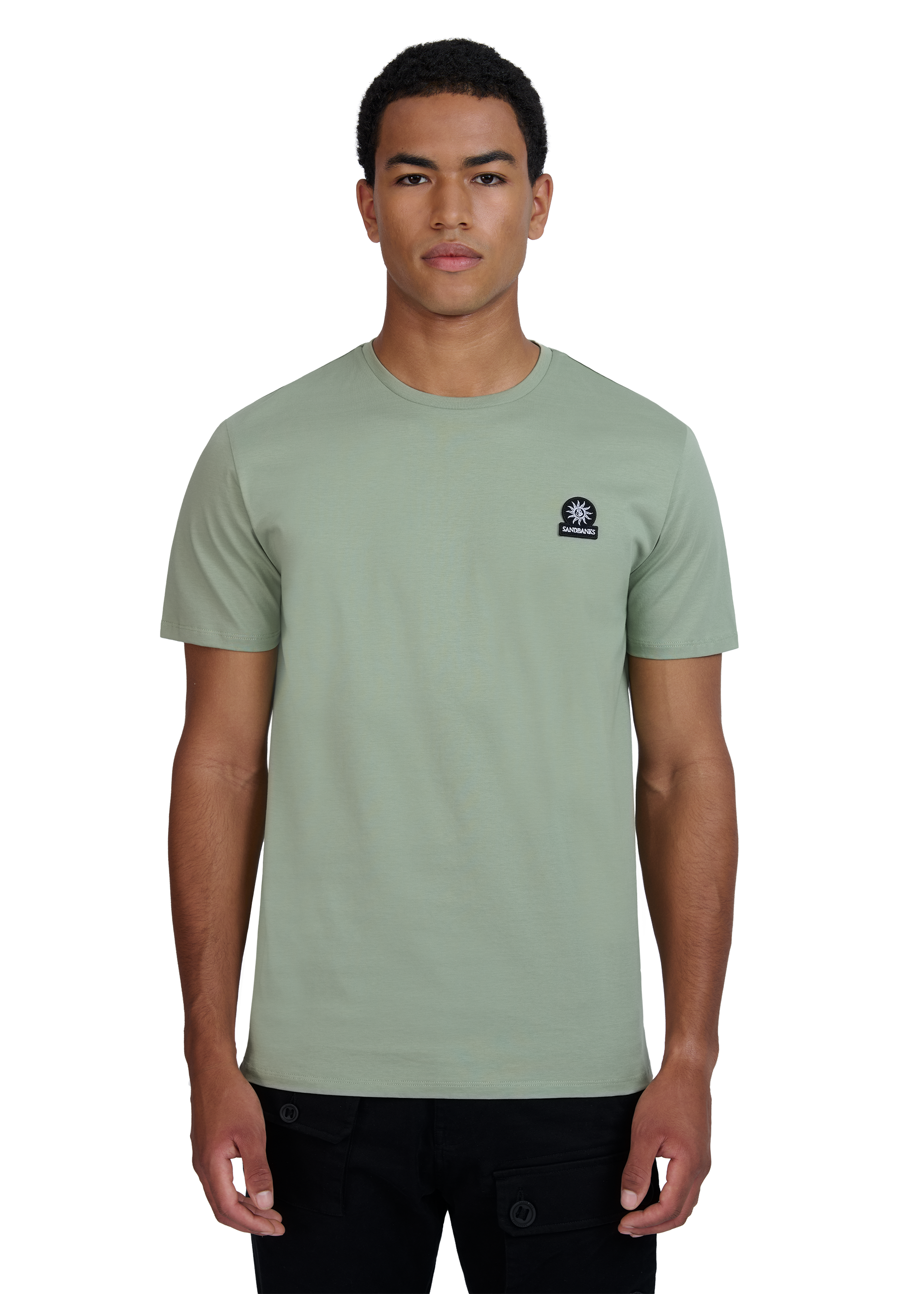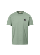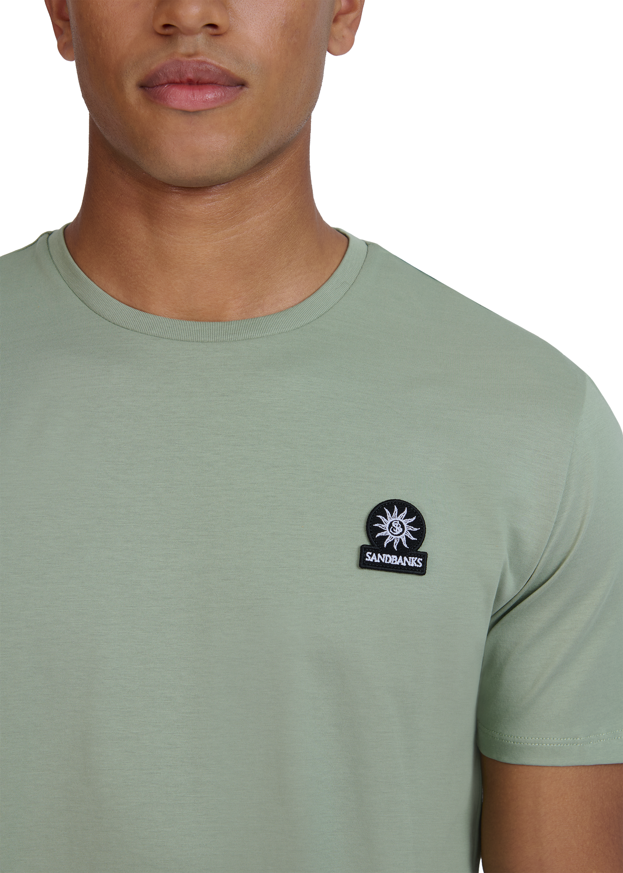 Sandbanks men's badge logo t-shirt in sage, made from mercerised cotton for a silky and luxurious feel. This classic fitting crew neck t-shirt features an embroidered badge logo on the chest and tri-colour back neck binding.