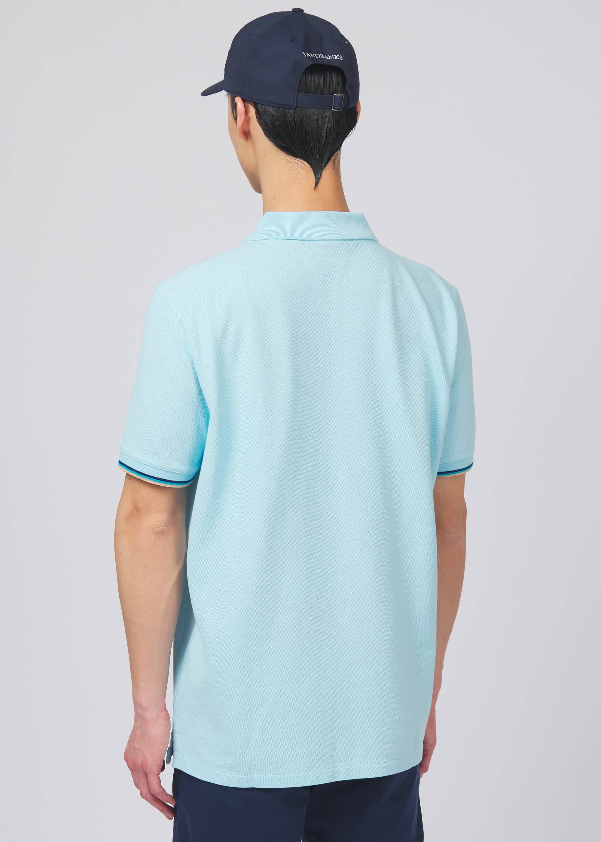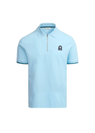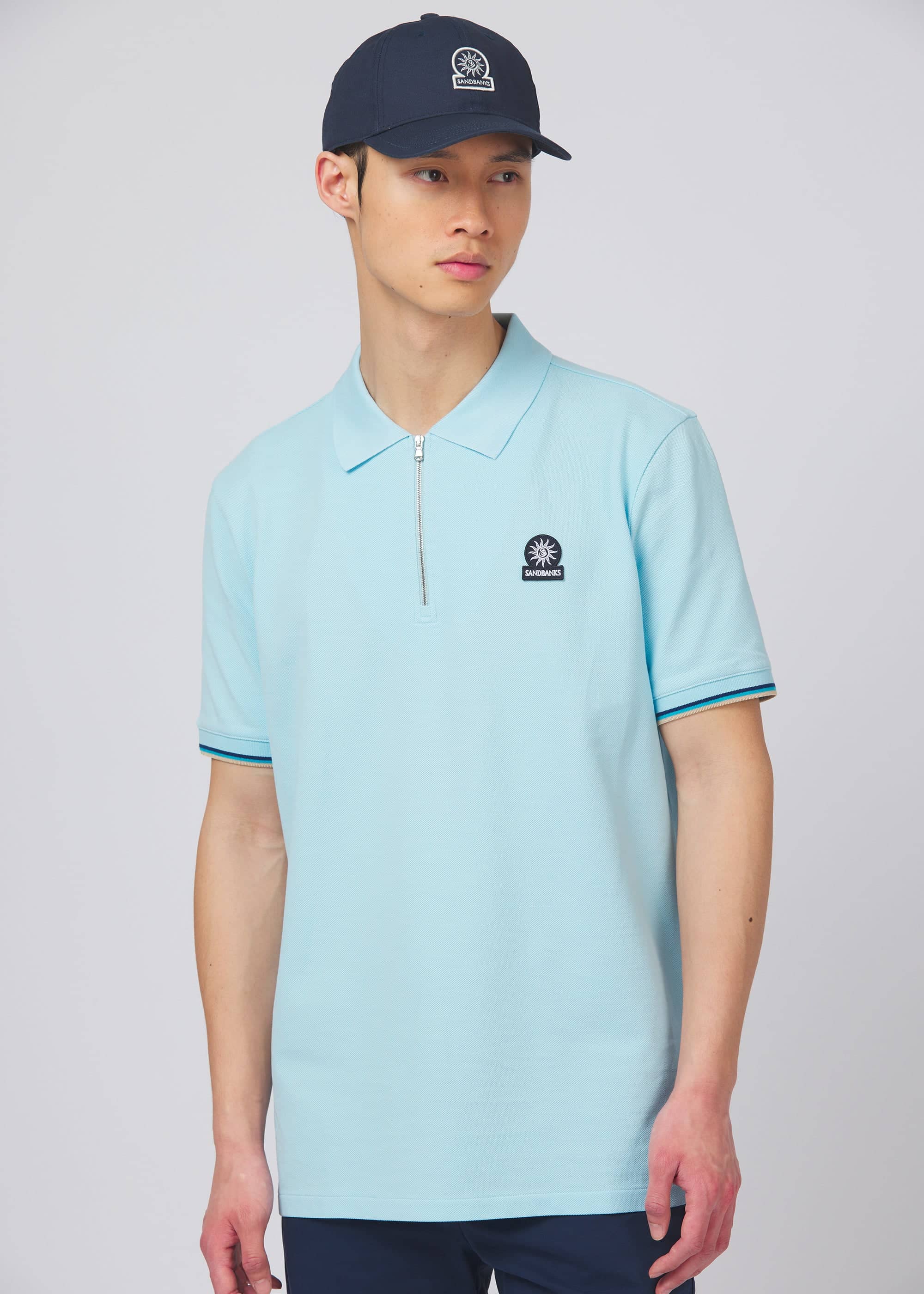 Sandbanks men's badge logo zip polo shirt in crystal blue, made from 100% organic cotton. This classic fitting zip polo shirt features an embroidered badge logo on the chest, tri-colour tipped knitted cuff and back neck binding.
