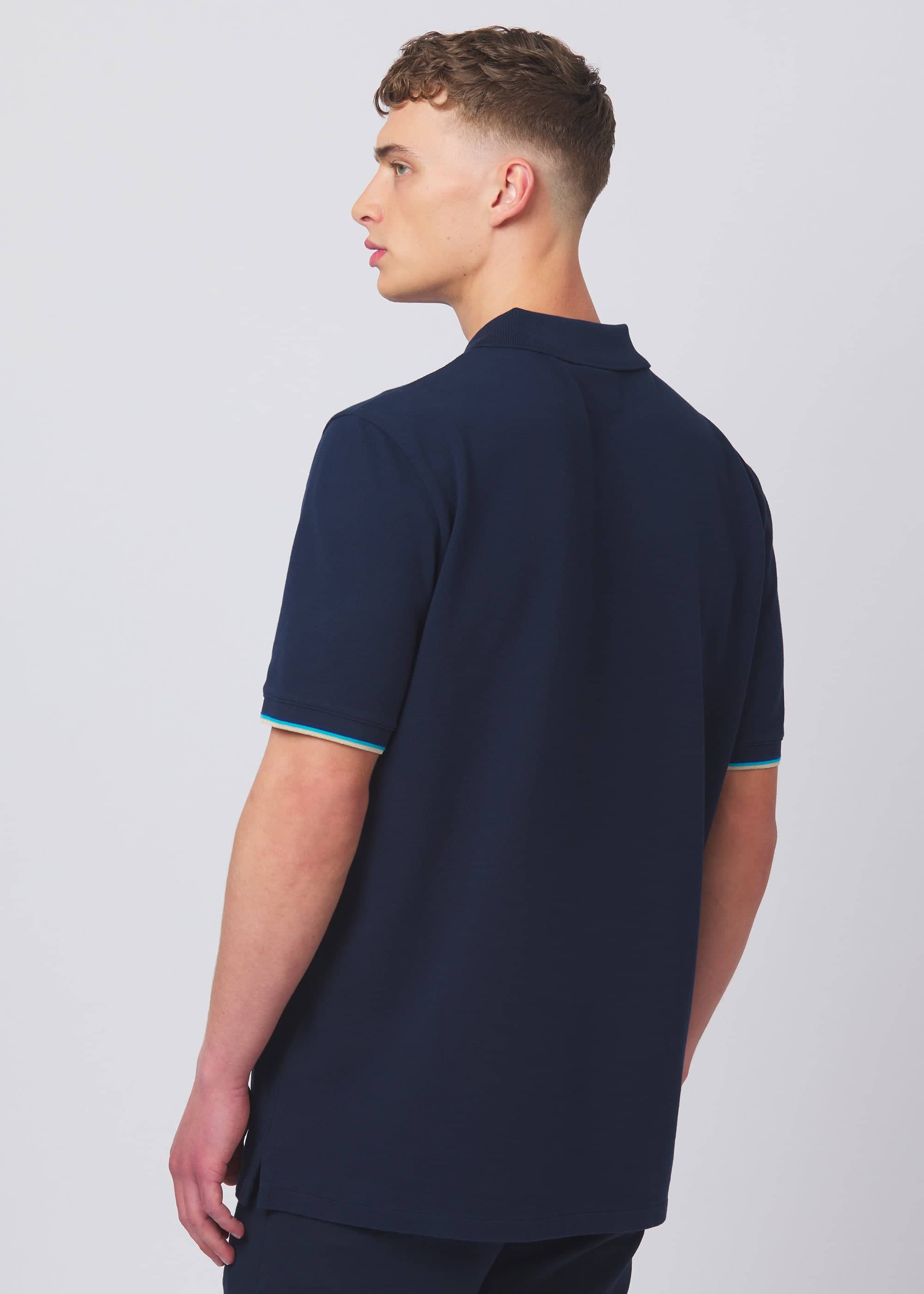 - Tri-colour tipped cuff and back neck binding
