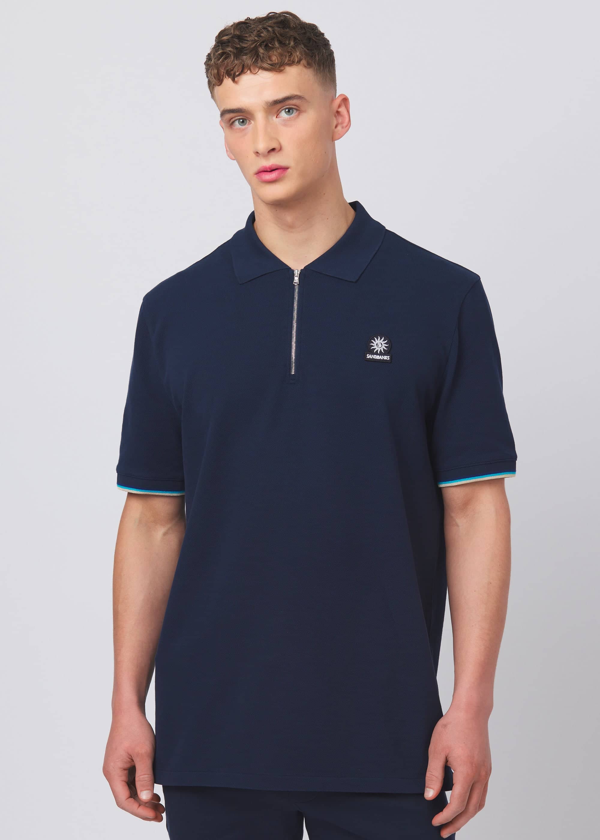 Sandbanks men's badge logo zip polo shirt in navy, made from 100% organic cotton. This classic fitting zip polo shirt features an embroidered badge logo on the chest, tri-colour tipped knitted cuff and back neck binding.