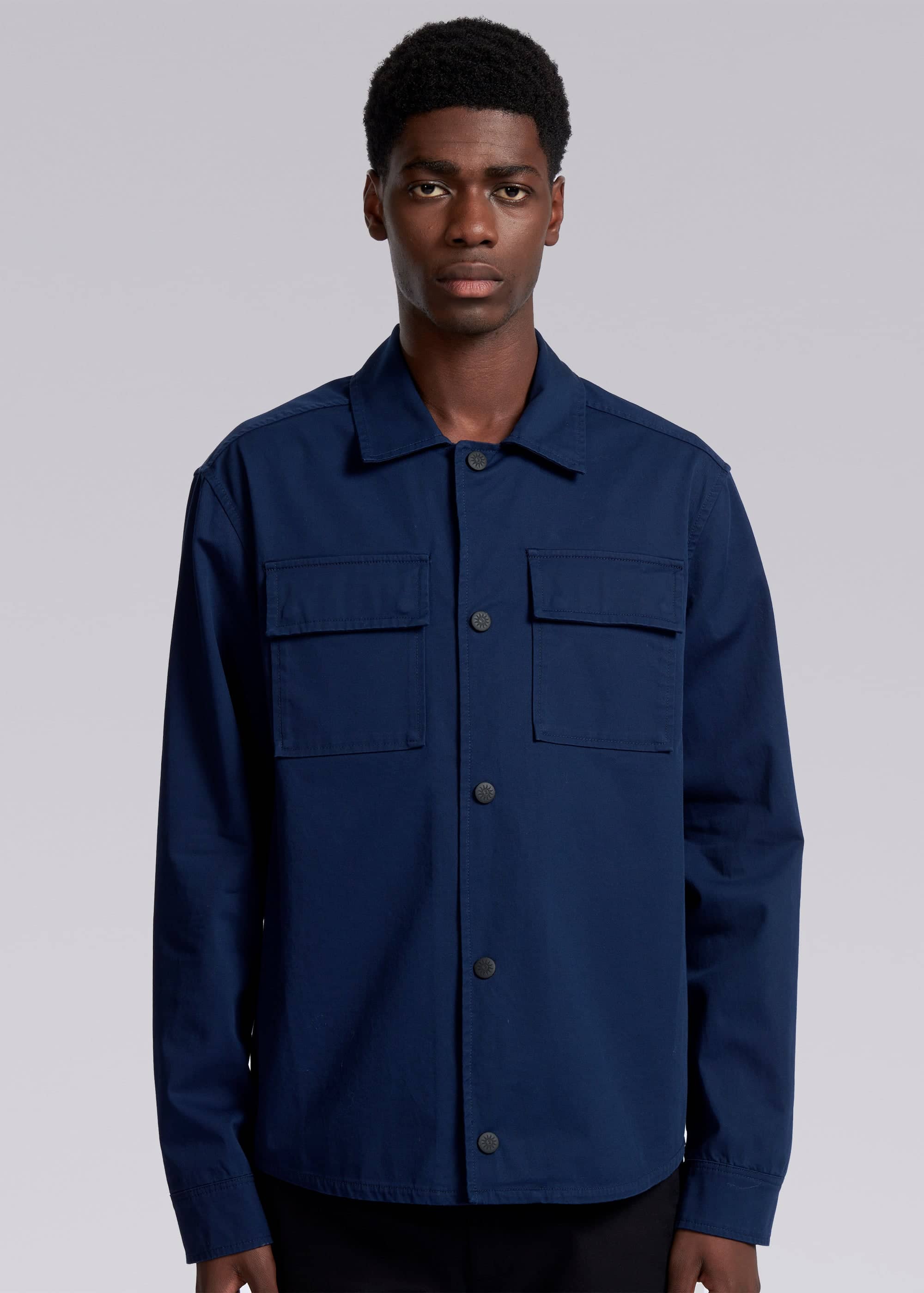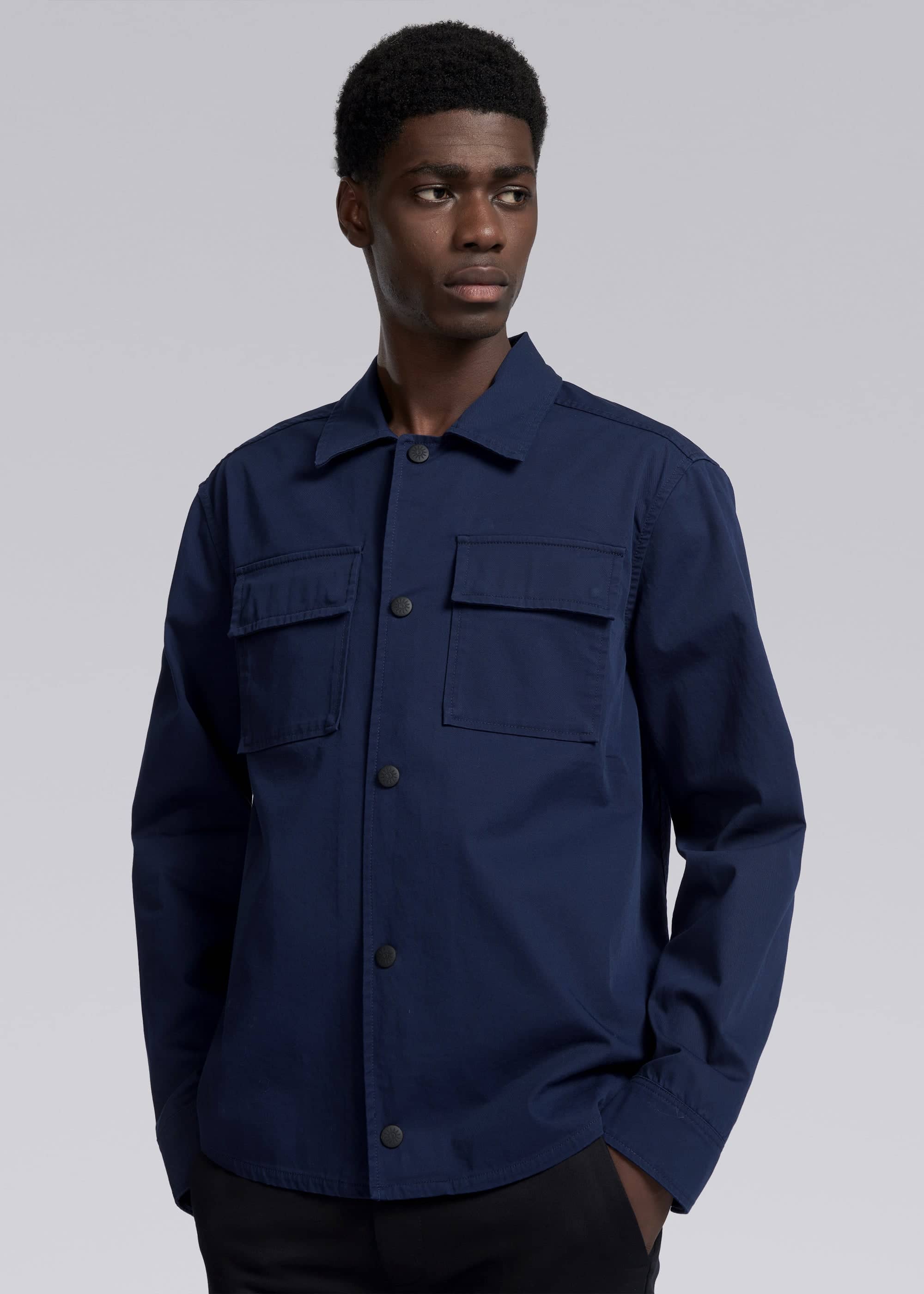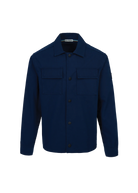 Sandbanks men's gabardine button down overshirt in navy, made from a cotton stretch gabardine with a soft and luxurious handle. This overshirt features a Sandbanks logo badge embroidery on the sleeve, tri-colour neck binding, 2 chest pockets, and black rubberised buttons at centre front and cuff.