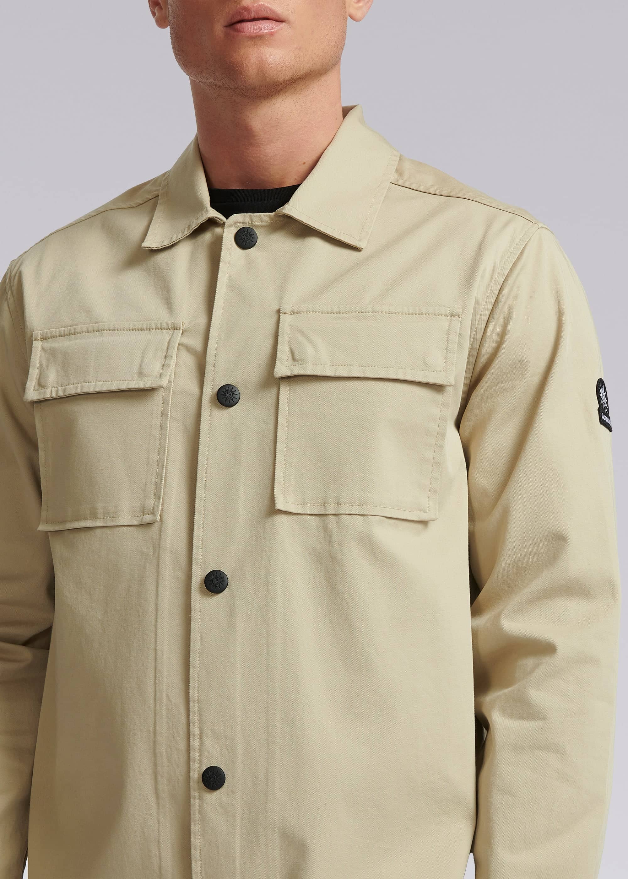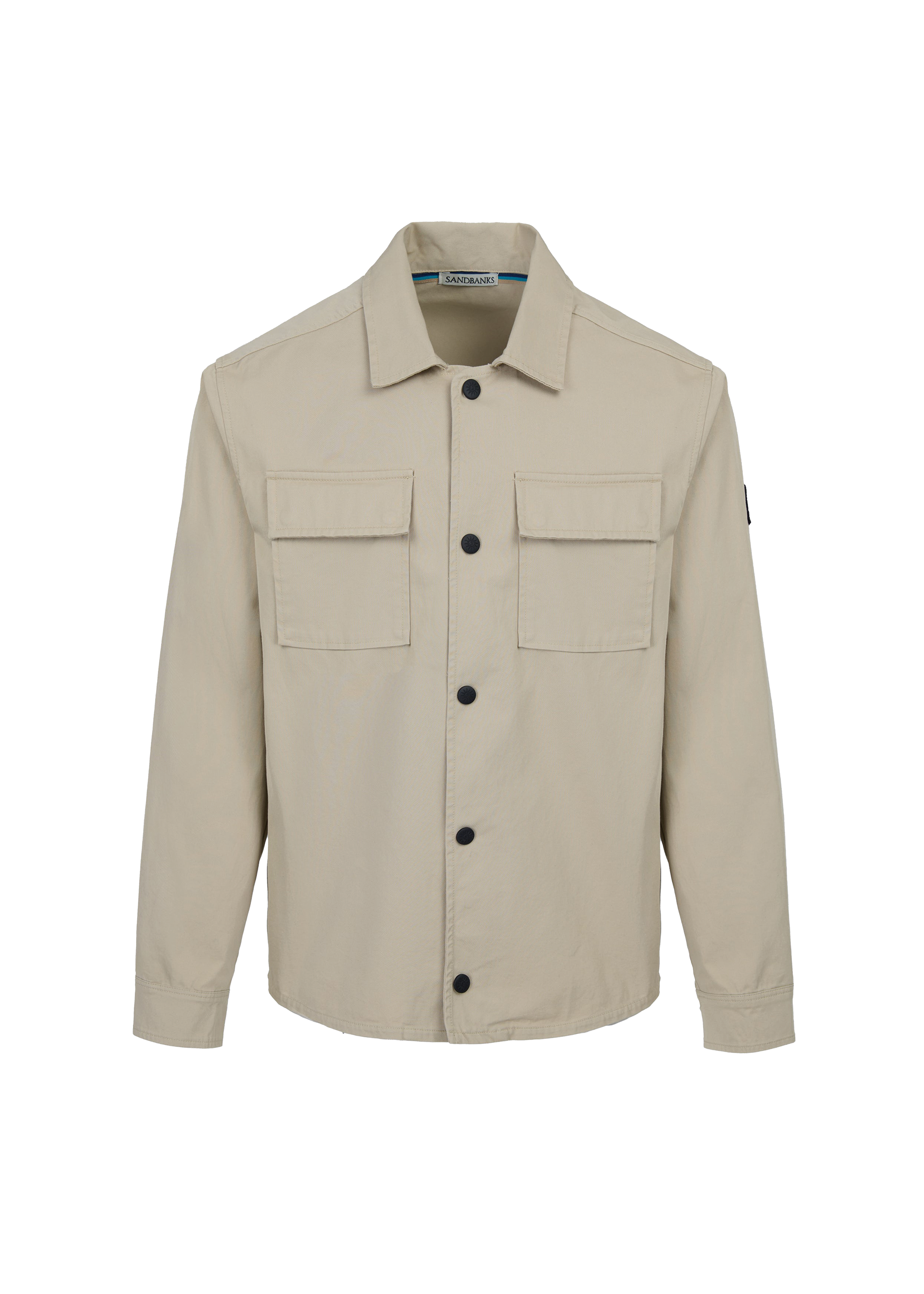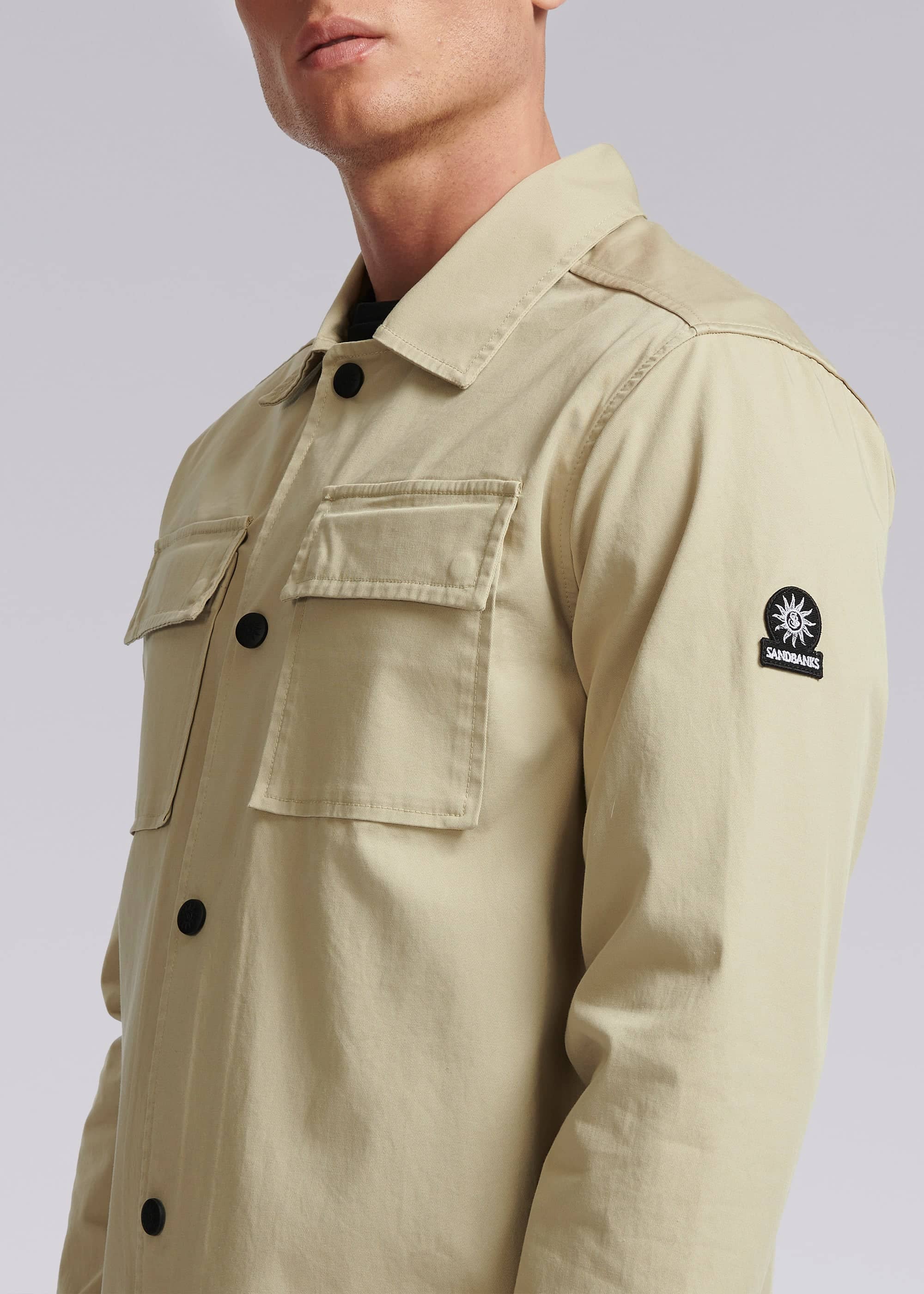 Sandbanks men's gabardine button down overshirt in stone, made from a cotton stretch gabardine with a soft and luxurious handle. This overshirt features a Sandbanks logo badge embroidery on the sleeve, tri-colour neck binding, 2 chest pockets, and black rubberised buttons at centre front and cuff.