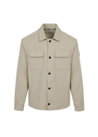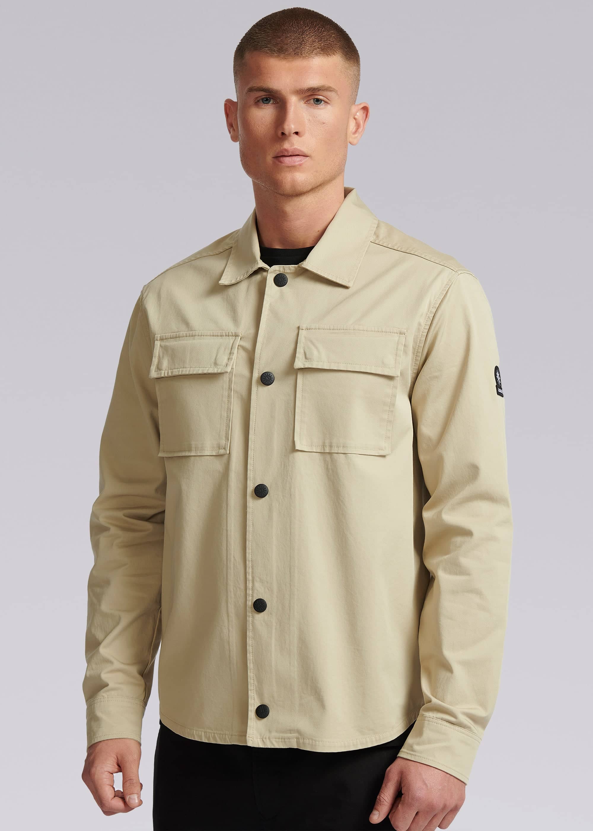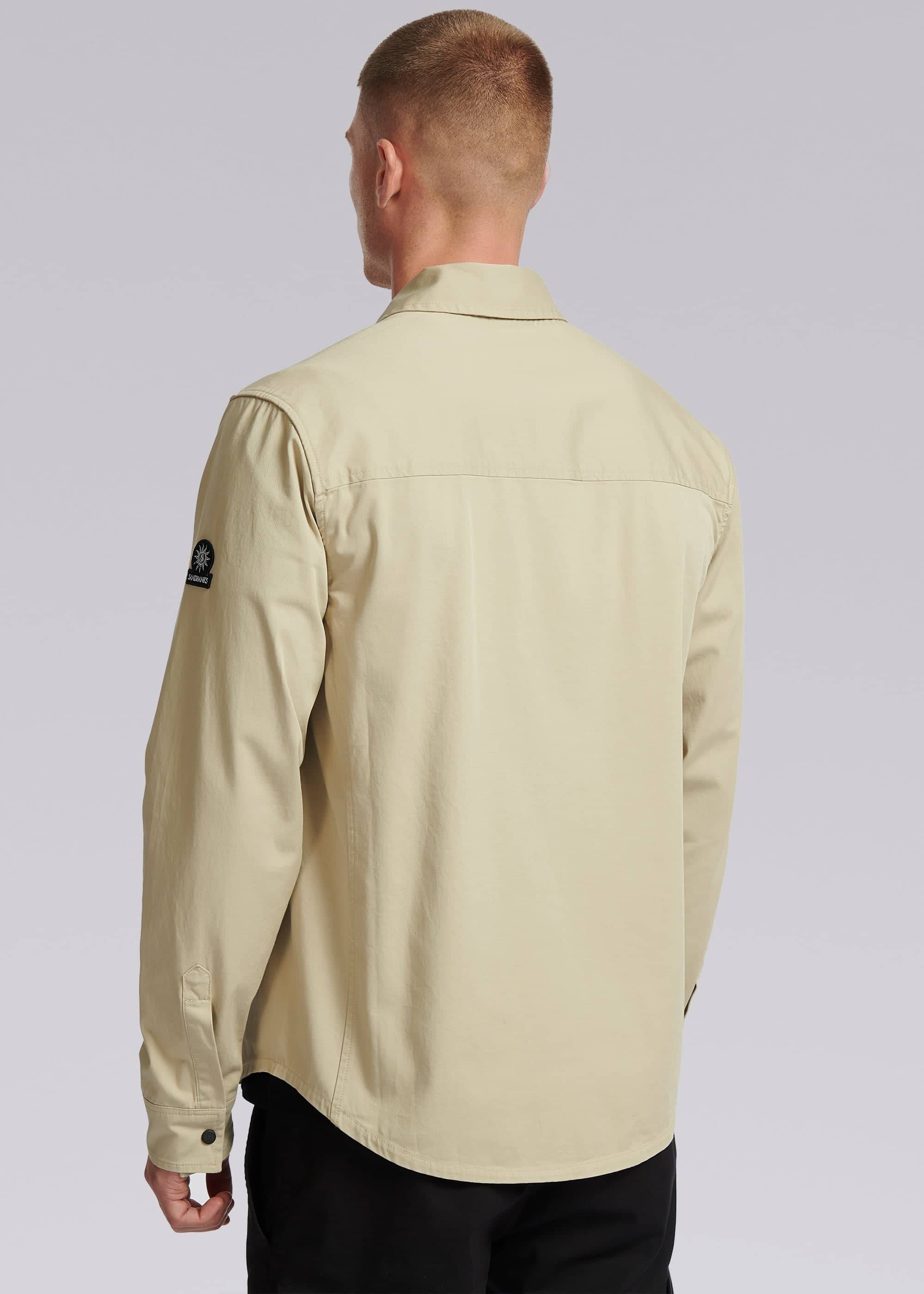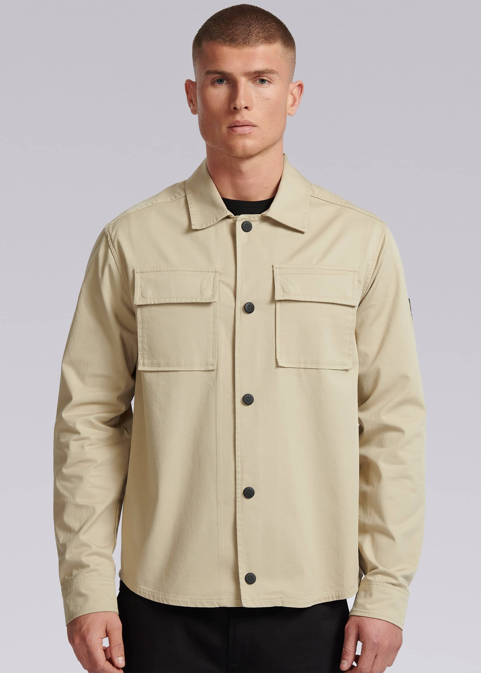 Sandbanks men's gabardine button down overshirt in stone, made from a cotton stretch gabardine with a soft and luxurious handle. This overshirt features a Sandbanks logo badge embroidery on the sleeve, tri-colour neck binding, 2 chest pockets, and black rubberised buttons at centre front and cuff.