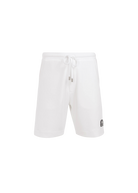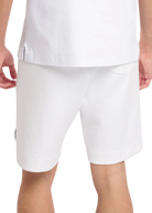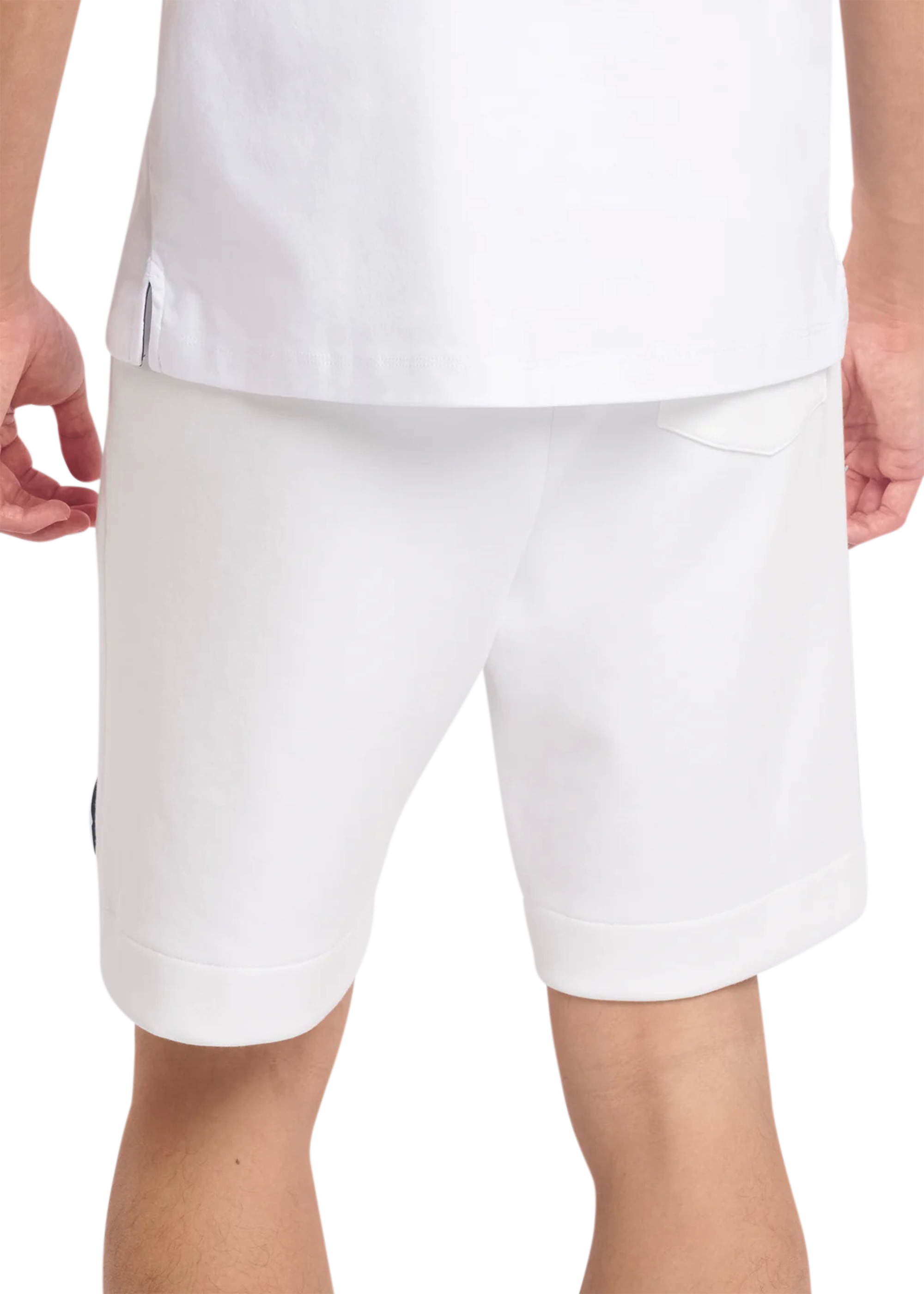 Sandbanks men's badge logo interlock shorts in white. This classic fitting garment is made from an interlock fabric for a superior smooth finish, featuring navy rubber badge with contrast white branding, and engraved gunmetal cord ends.