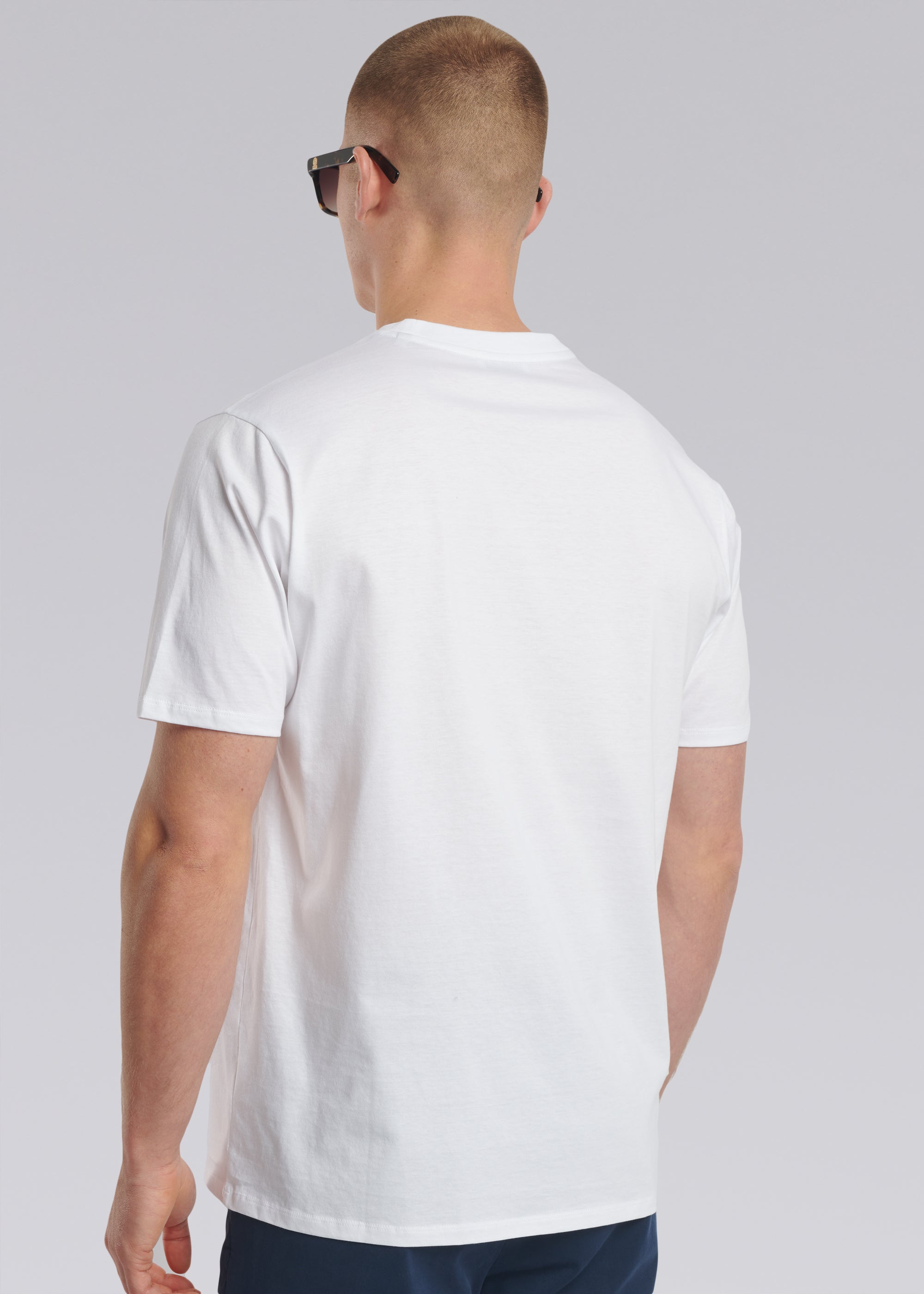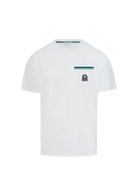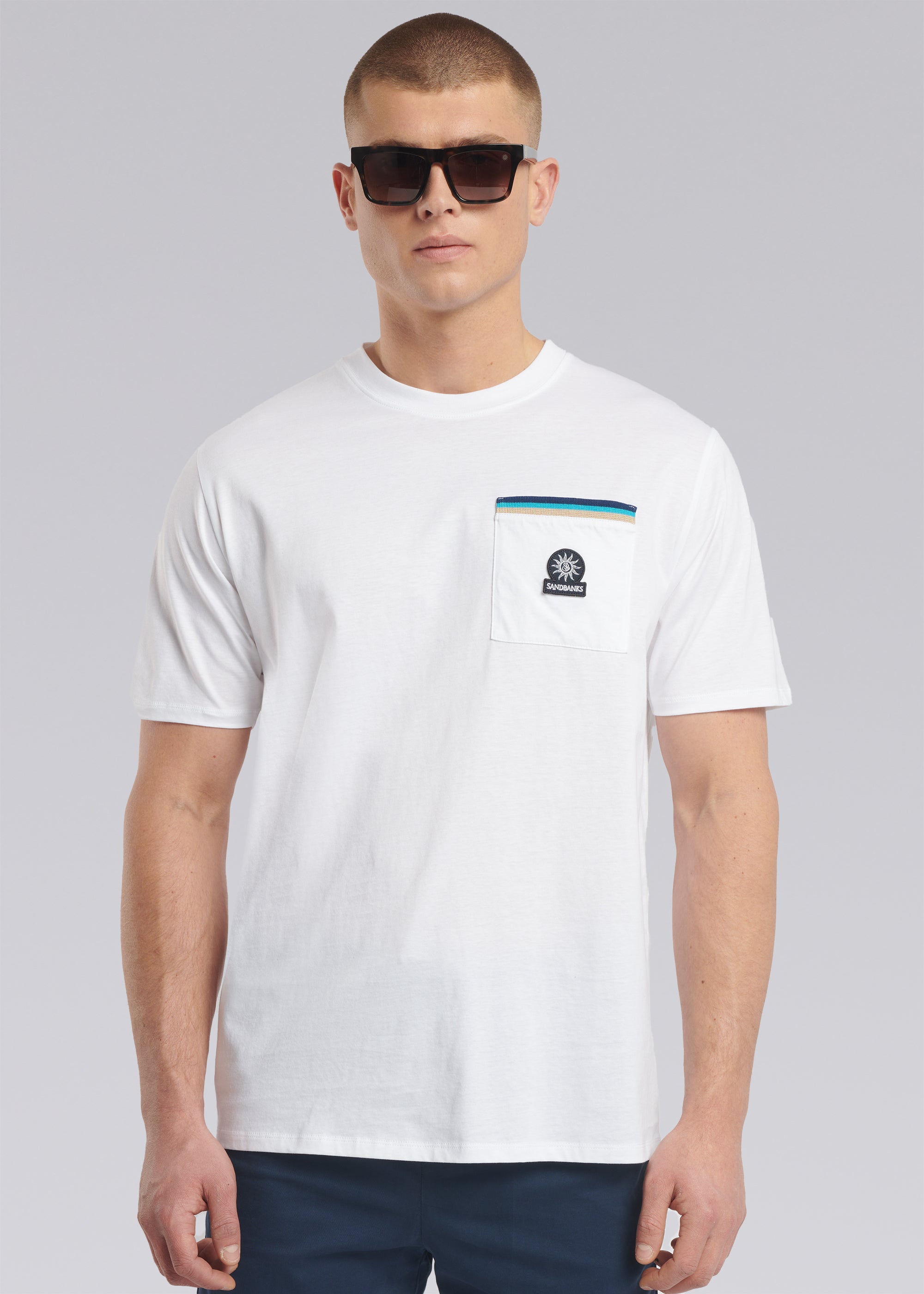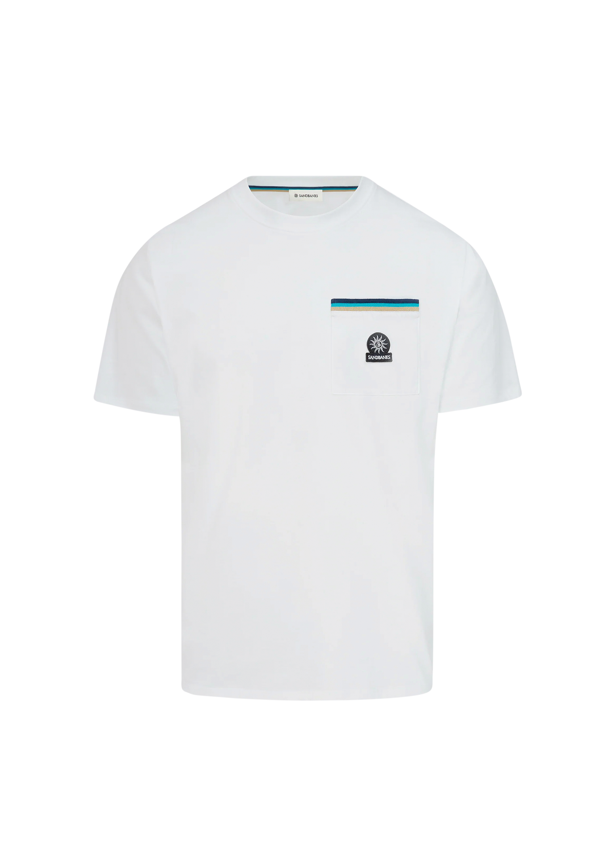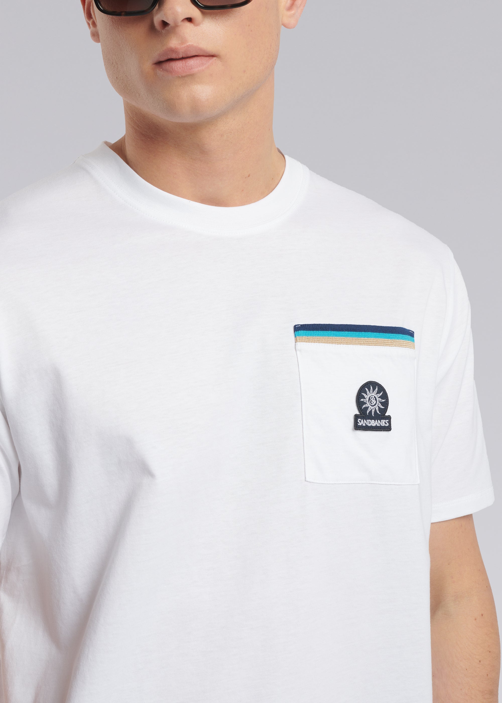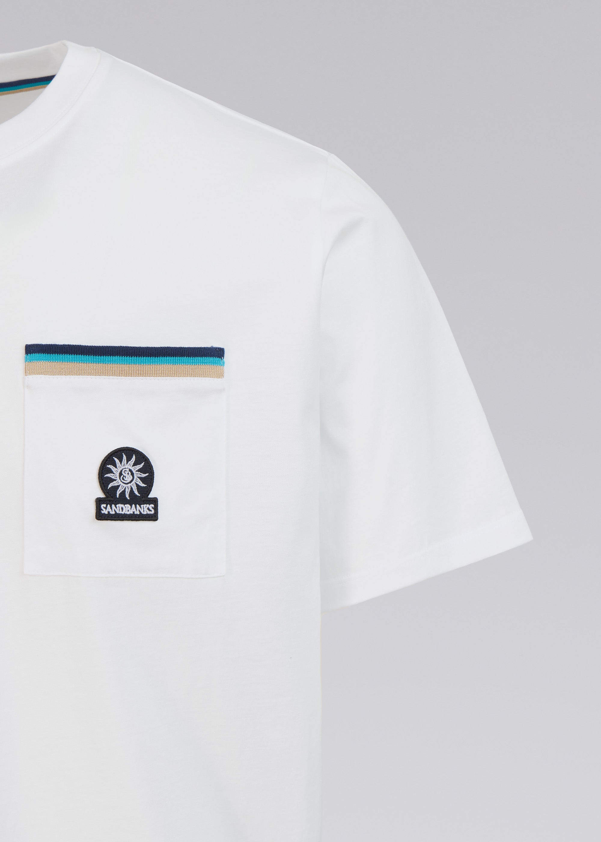 Sandbanks men's badge logo pocket t-shirt in white, made from mercerised 100% organic cotton for a silky and luxurious feel. This relaxed fitting crew neck t-shirt features statement pocket with embroidered badge logo and tri-colour rib binding pocket.