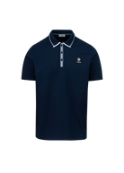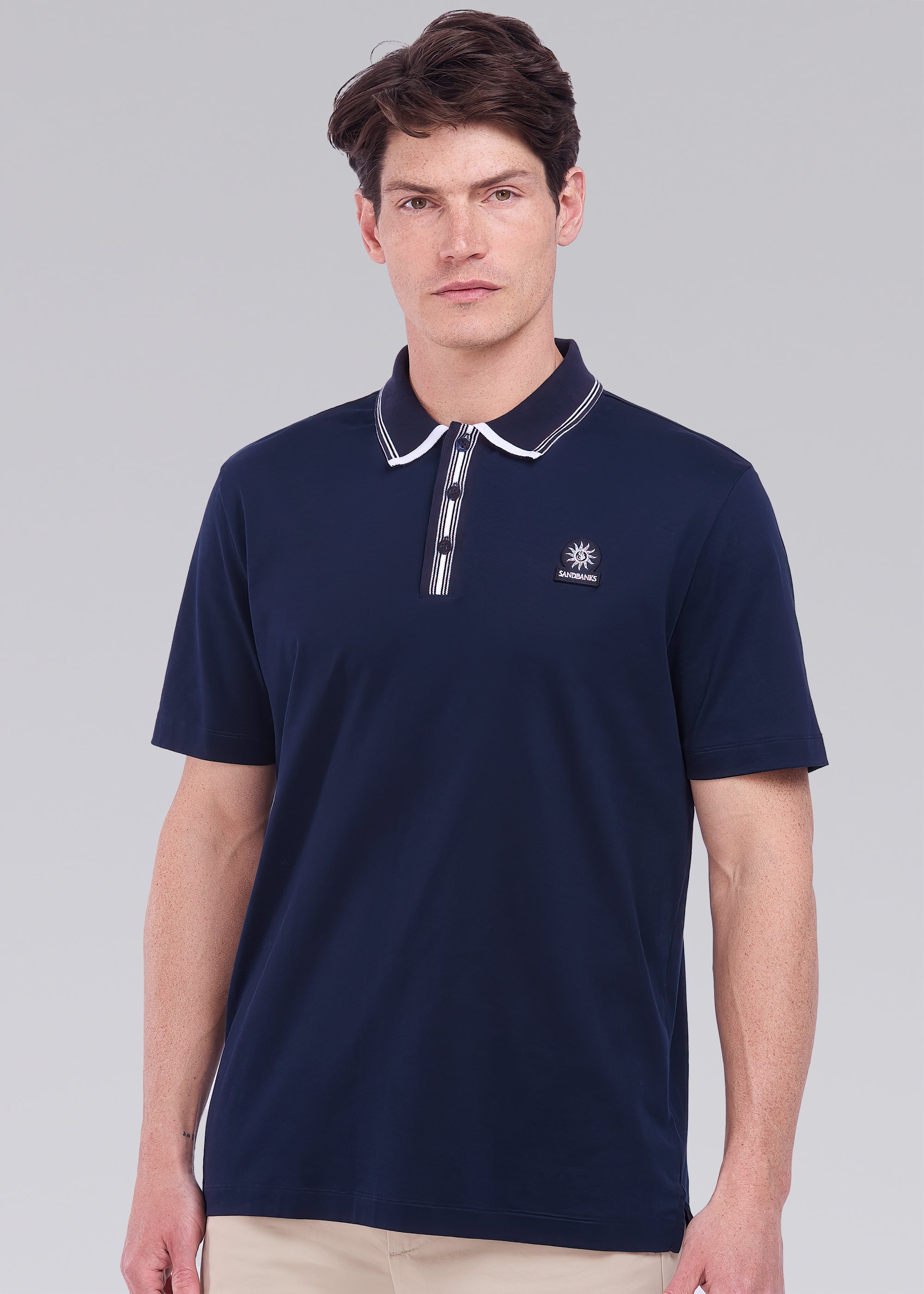 Sandbanks men's contrast stripe polo shirt in navy, made from sustainably sourced 100% BCI Cotton. This classic fitting polo shirt features statement contrast stripe collar and placket, Sandbanks embroidered chest badge, and tri-colour back neck binding.
