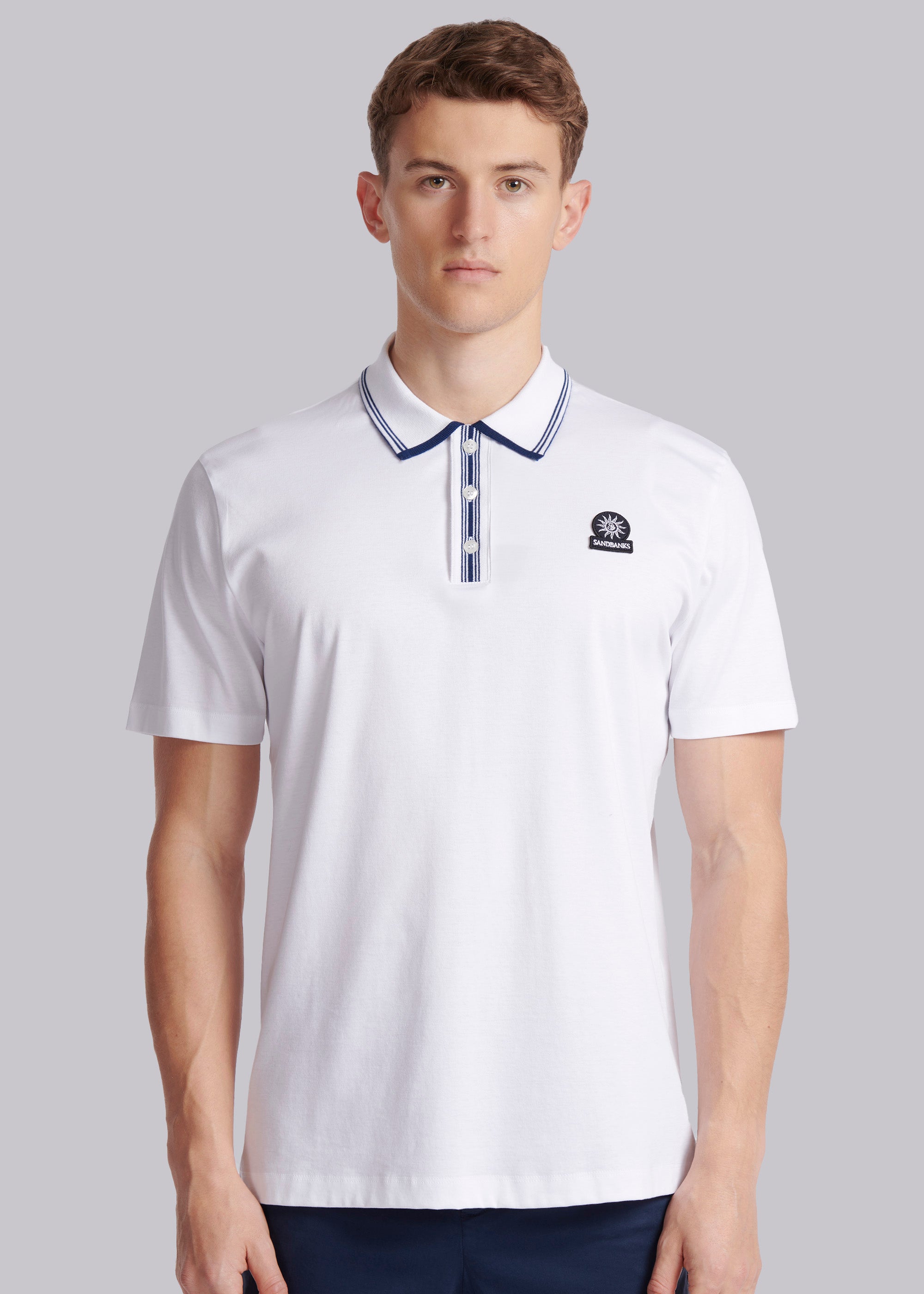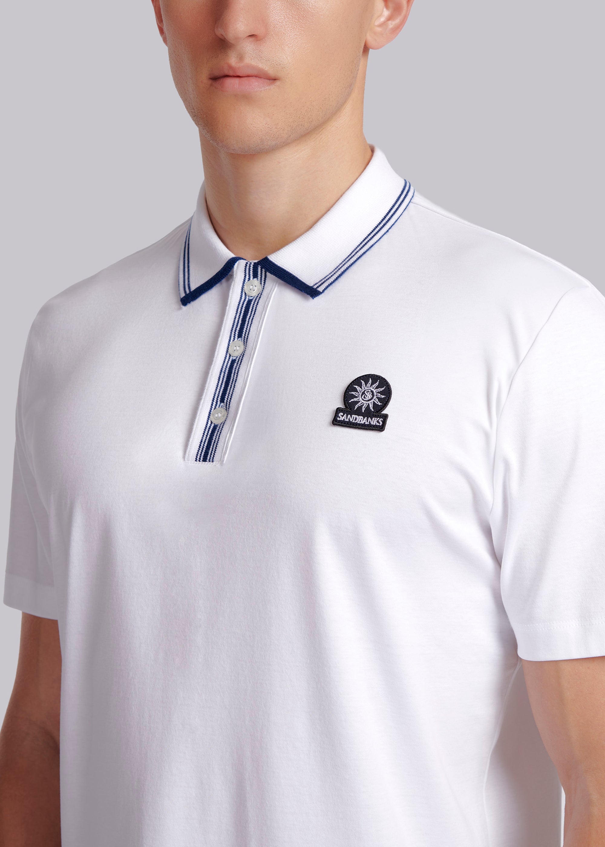 Sandbanks men's contrast stripe polo shirt in white, made from sustainably sourced 100% BCI Cotton. This classic fitting polo shirt features statement contrast stripe collar and placket, Sandbanks embroidered chest badge, and tri-colour back neck binding.