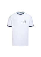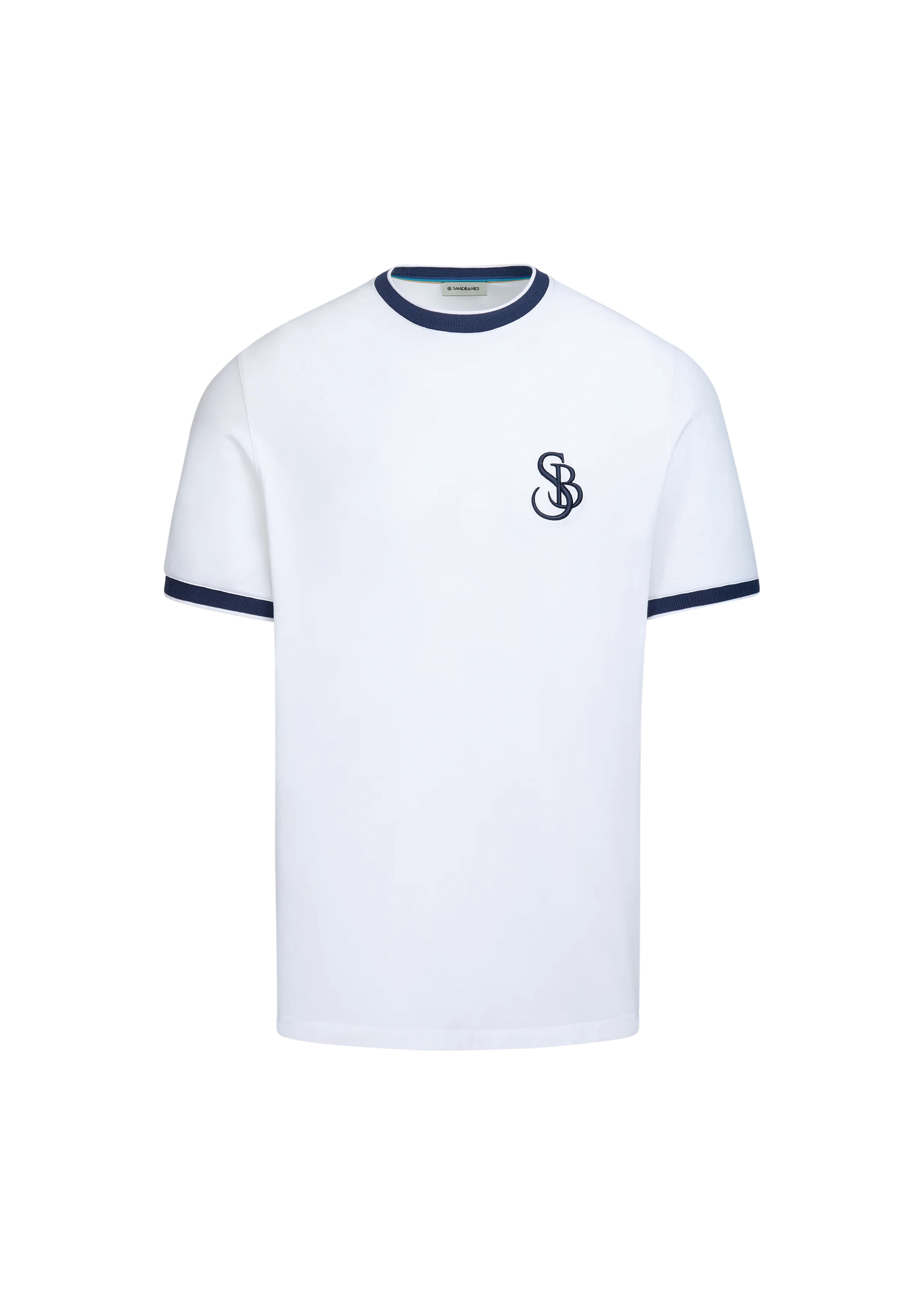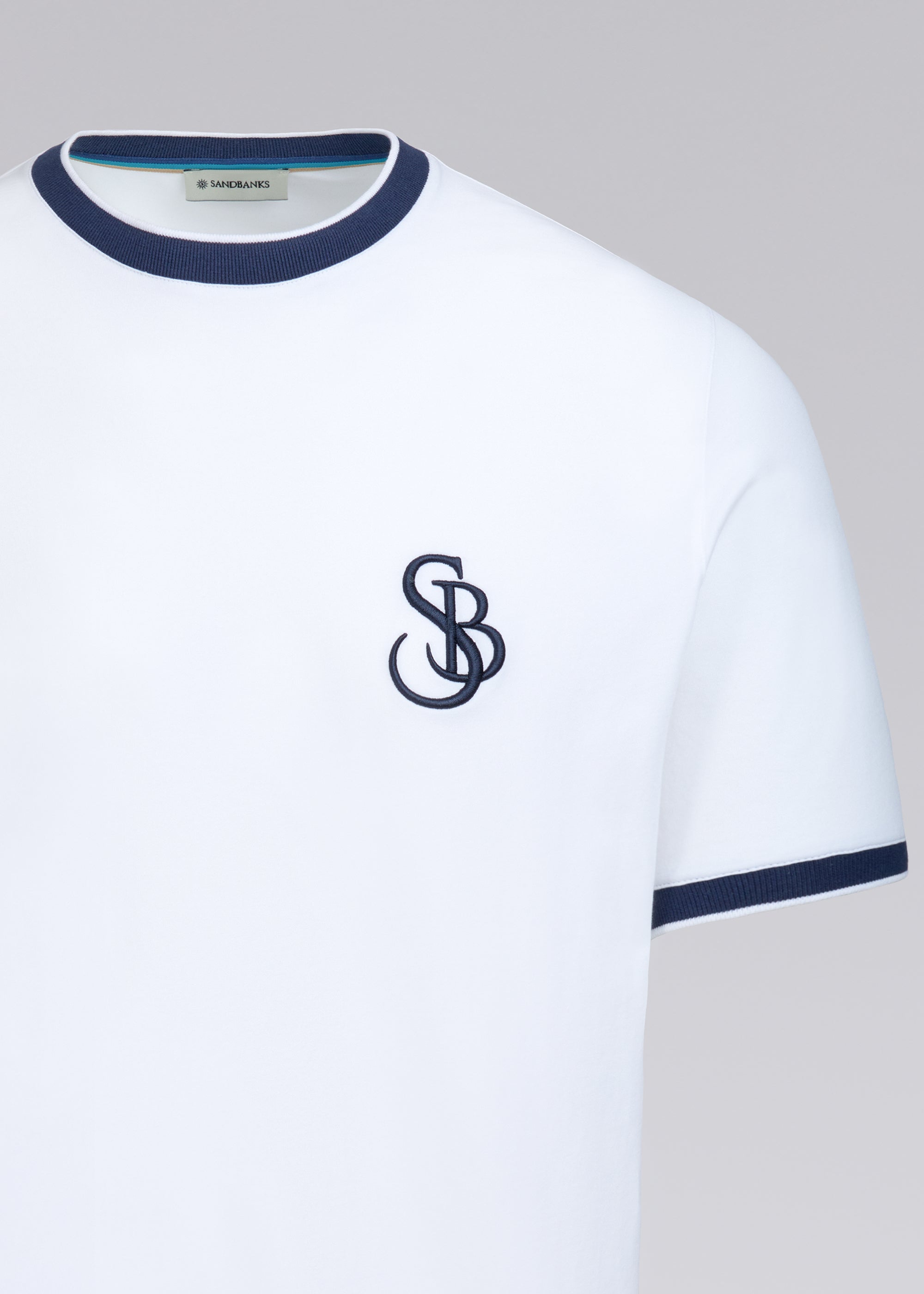 Crafted from 100% BCI cotton, the white Sandbanks SB Ringer T-Shirt has a relaxed-fit crew neck design featuring distinctive navy ribbed collar and cuffs, complemented by sophisticated 3D SB embroidery on the chest.