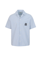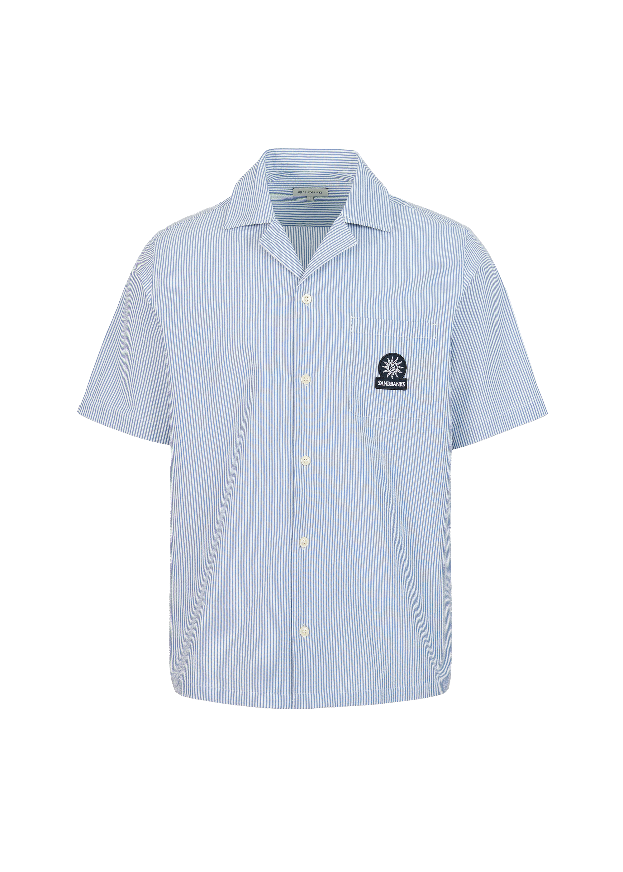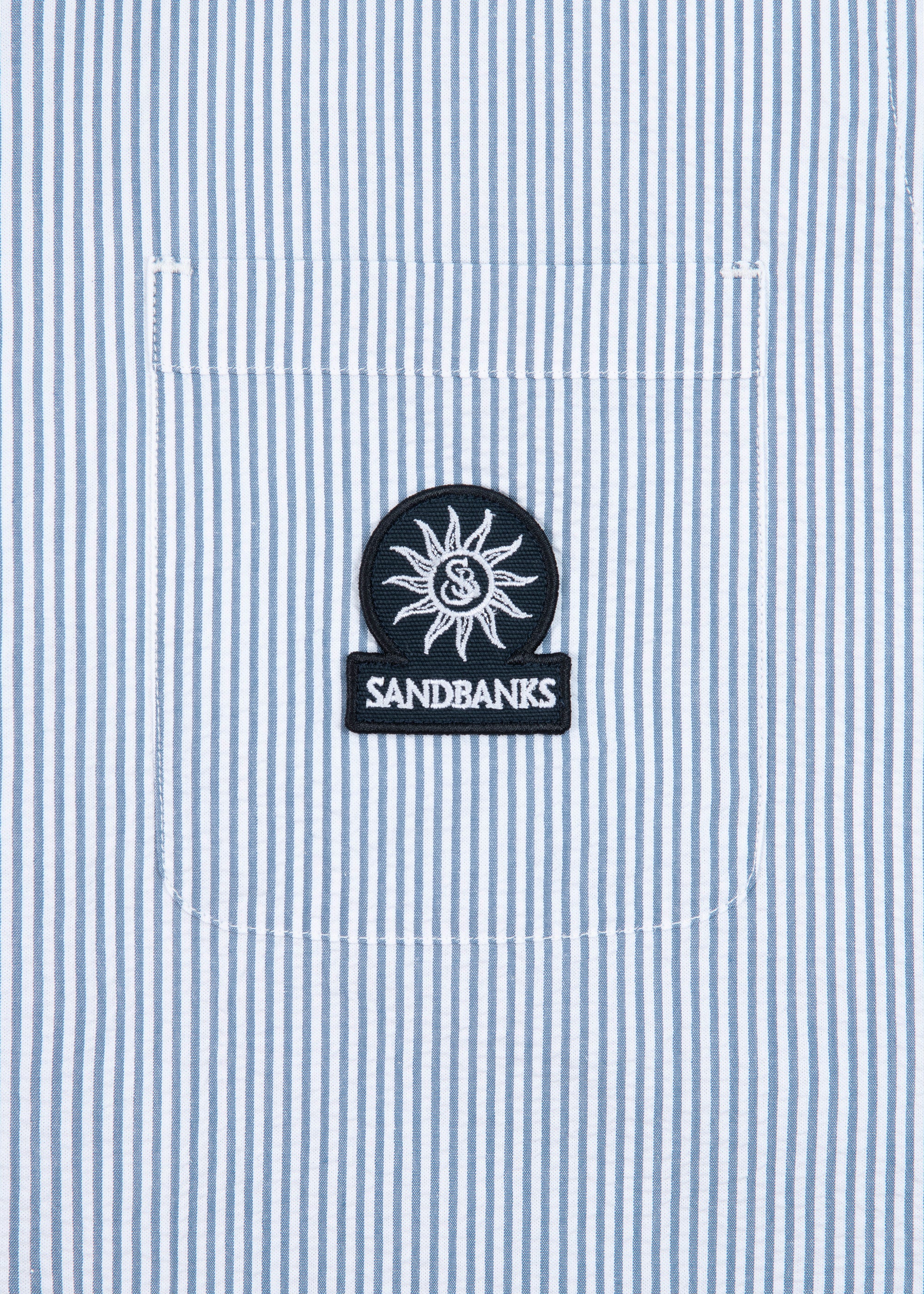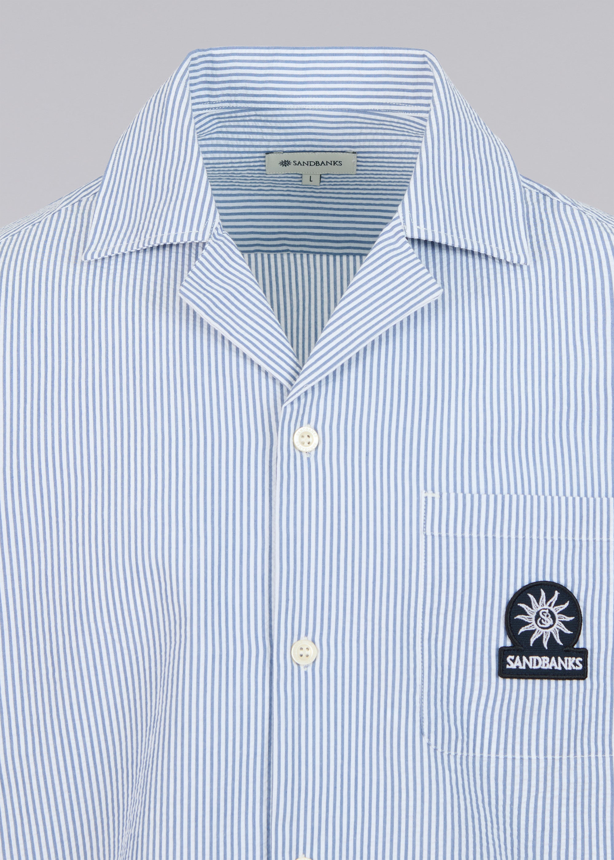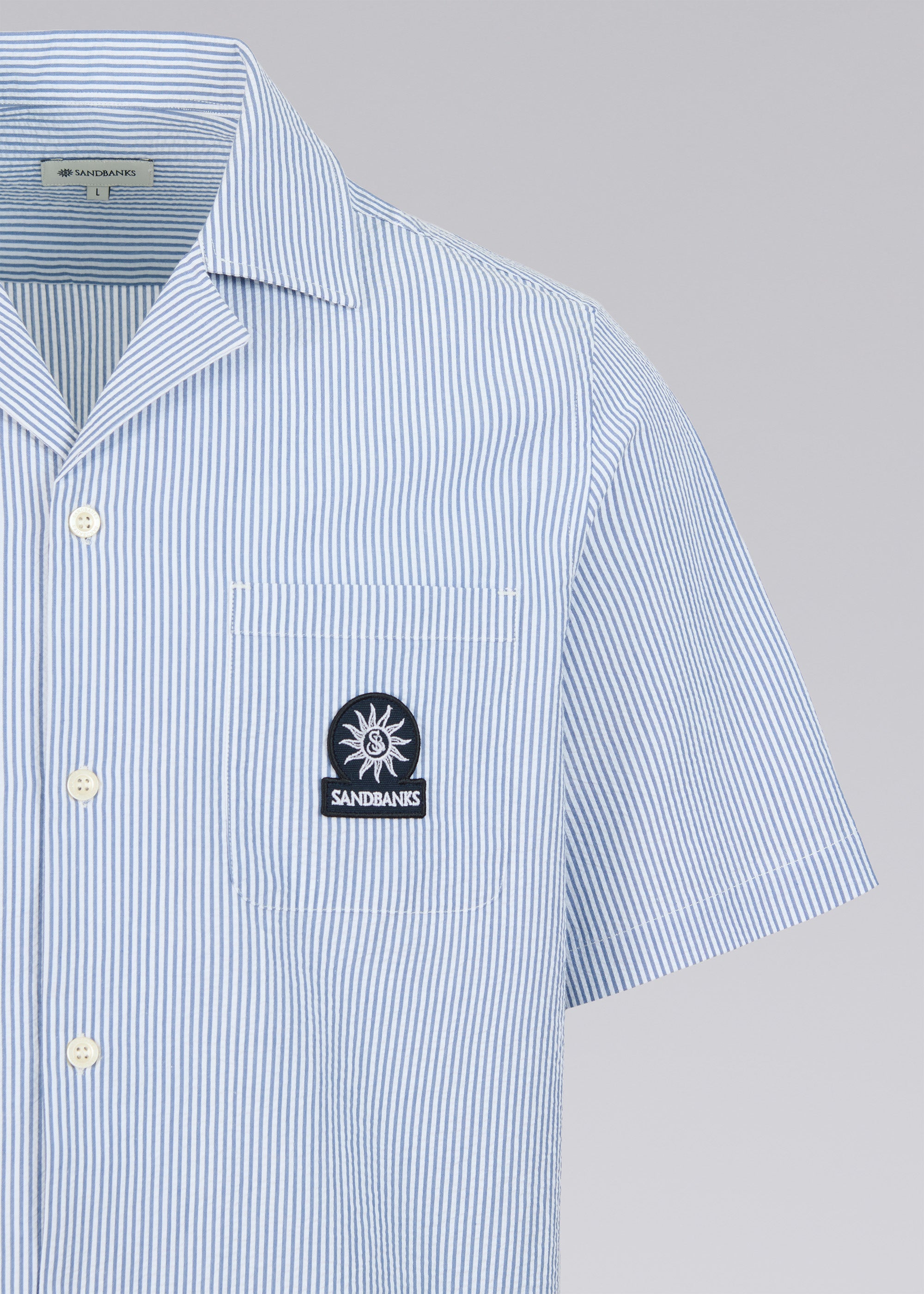 Sandbanks striped seersucker resort shirt in a fine navy and white stripe design. The shirt features a sophisticated revere collar, embroidered badge logo and breathable fabric.