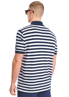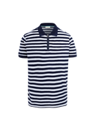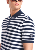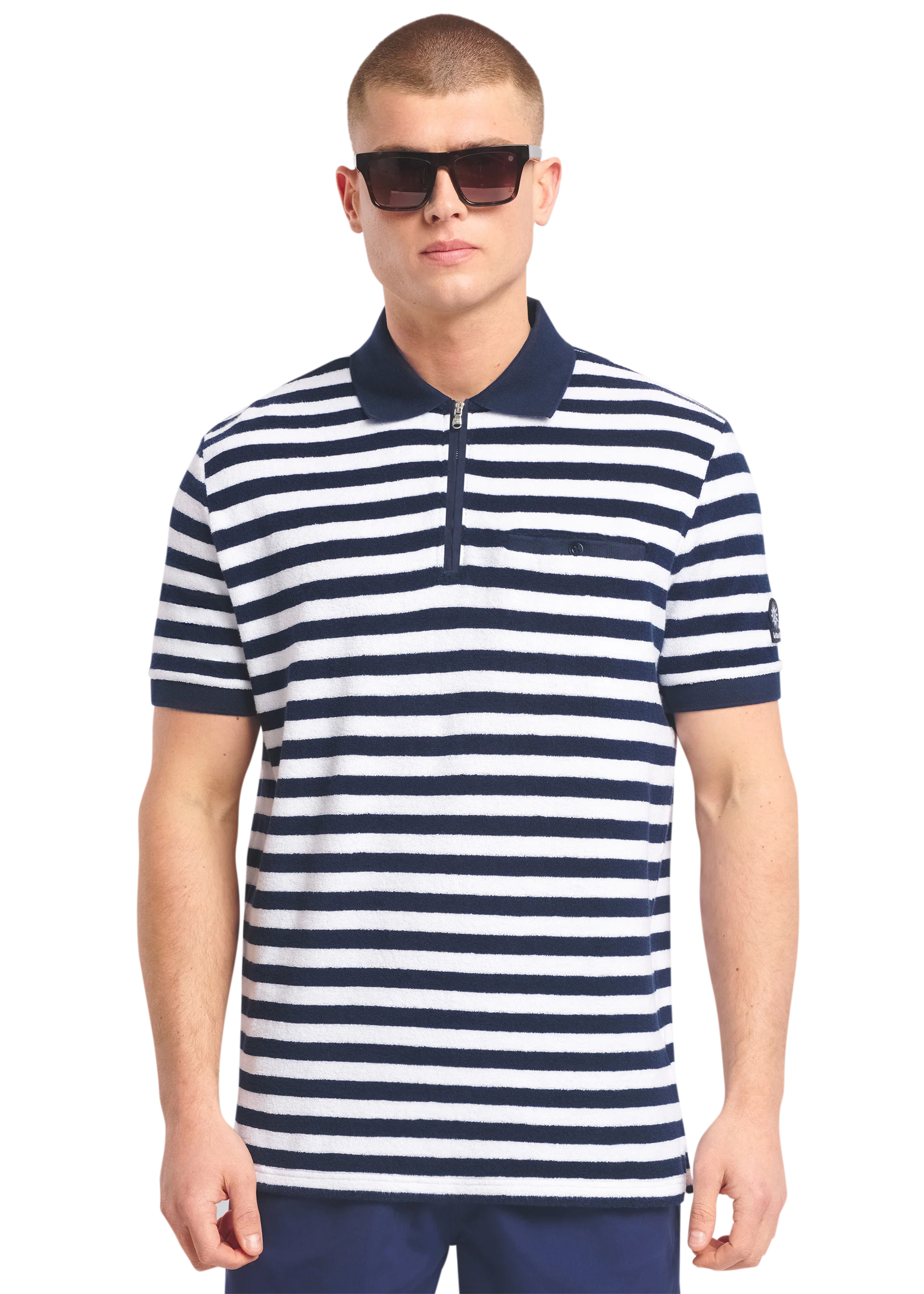 Sandbanks men's stripe towelling zip polo shirt in navy and white, made from 100% BCI cotton. This classic fitting zip polo shirt features an engraved puller, button up chest pocket, and embroidered badge on the sleeve.