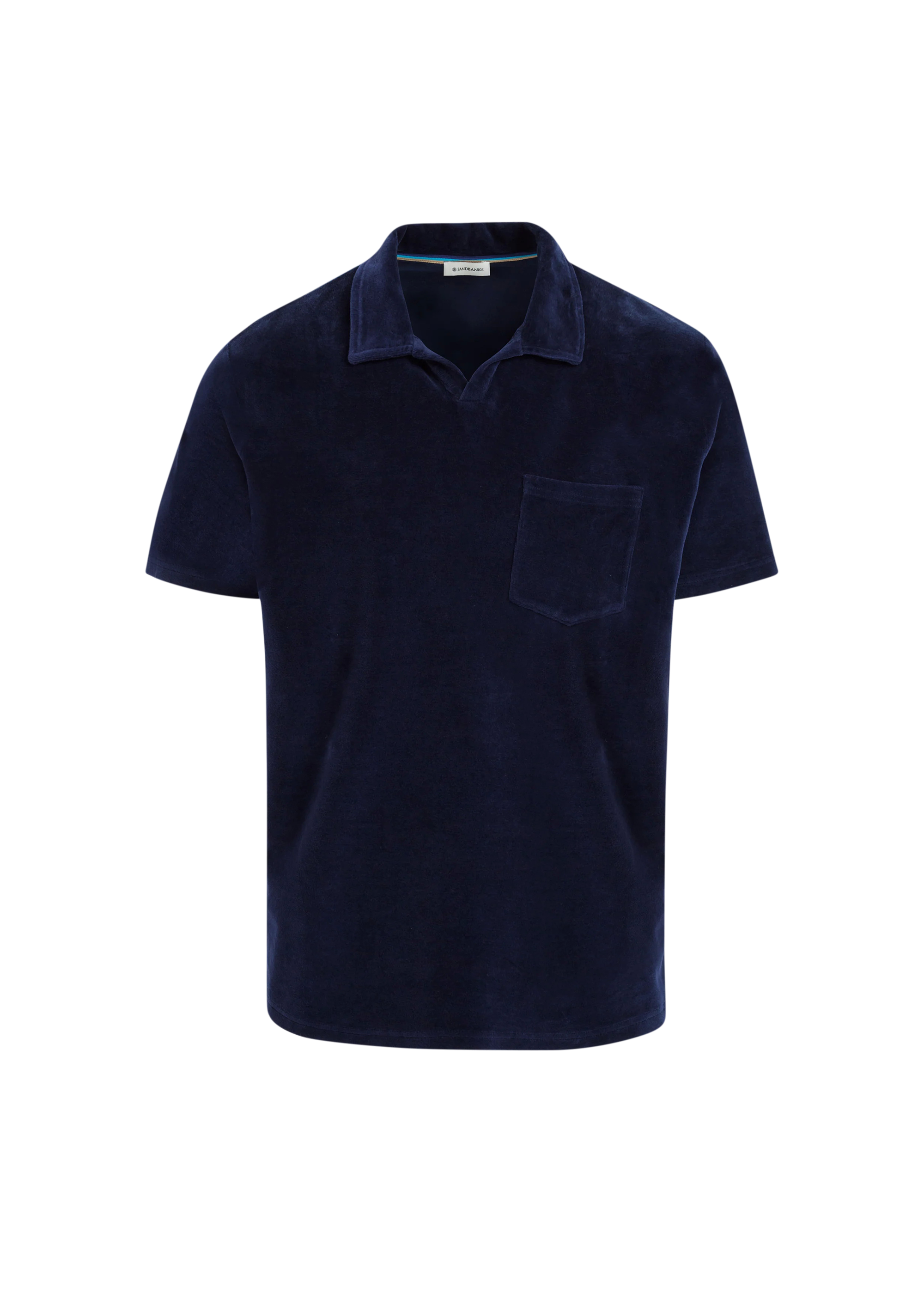 Sandbanks men's revere collar towelling polo shirt in navy, made from sustainably sourced 100% BCI cotton. This classic fit polo shirt features chest pocket, embroidered Sandbanks badge logo and tri-colour back neck binding.