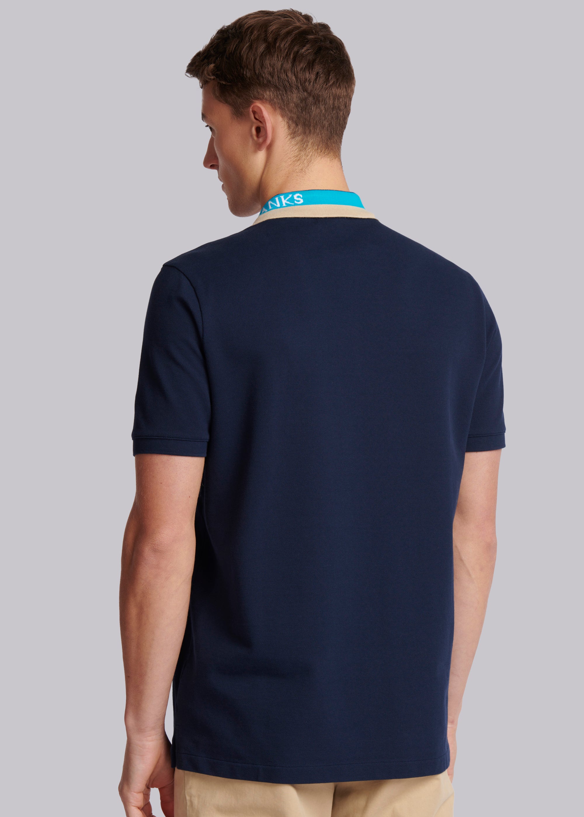 Sandbanks men's tri-colour collar polo shirt in navy, made from 100% organic cotton. This classic fitting polo shirt features statement tri-colour jacquard collar with contrast Sandbanks logo, tri-colour back neck binding and classic two button placket with engraved buttons.