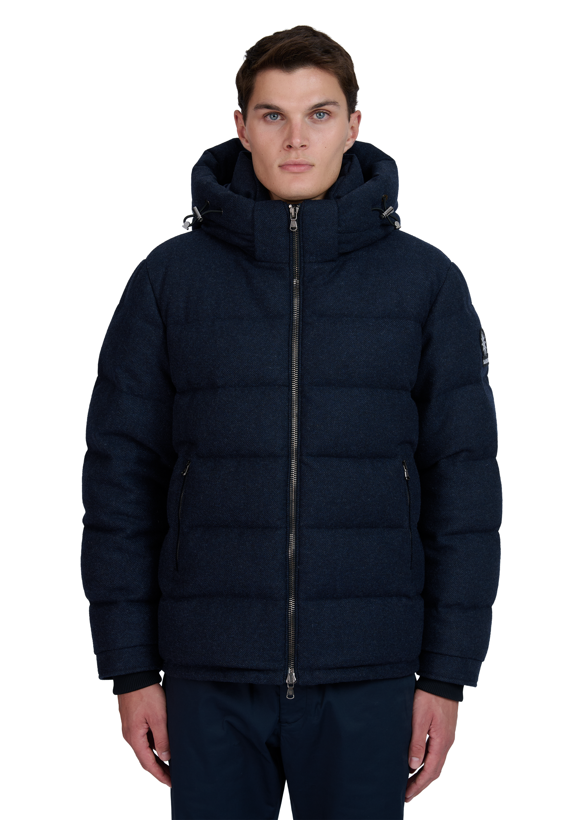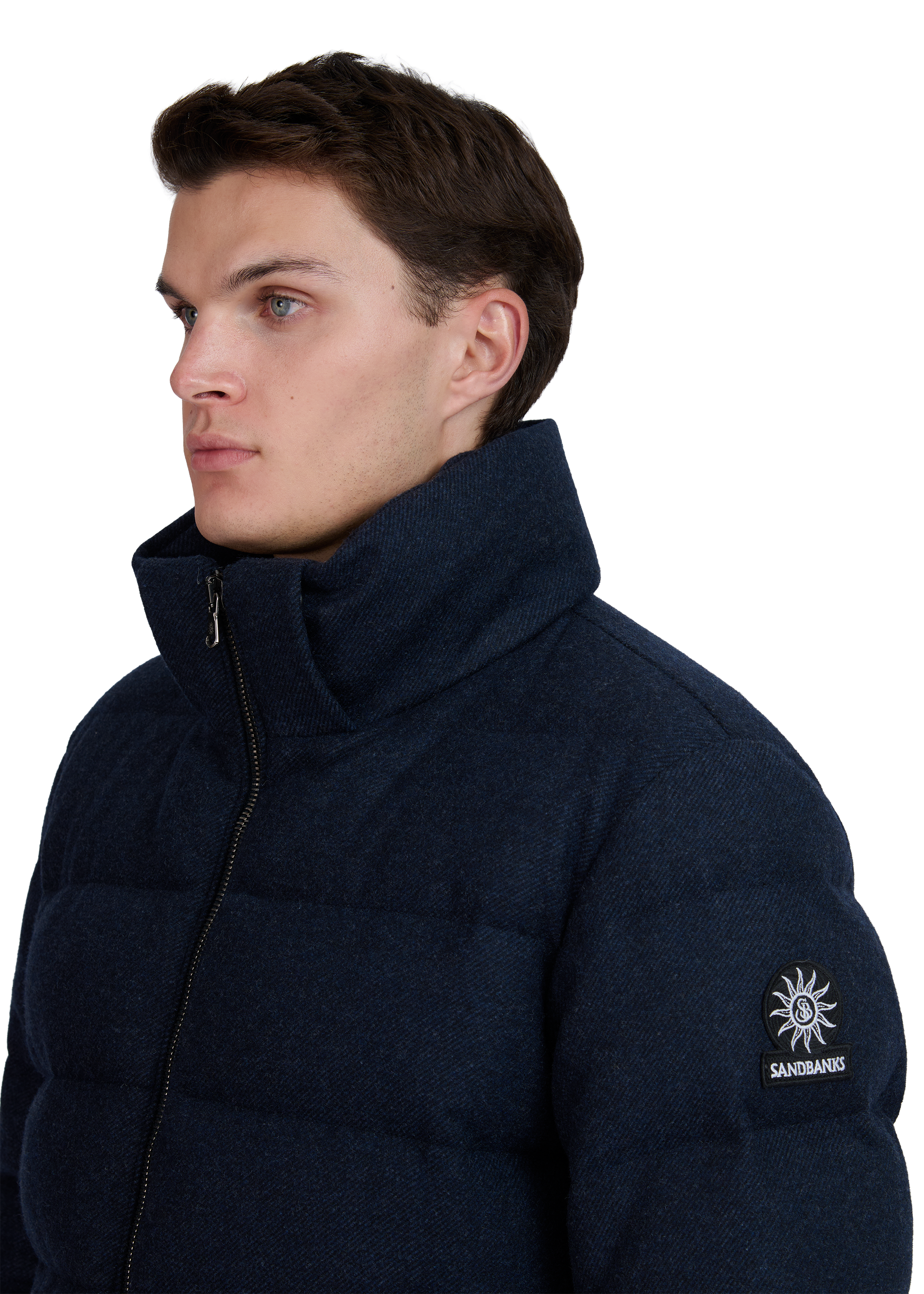 Our signature Sandbanks Banks puffer jacket transformed into statement outerwear as part of our Artisan Series. This luxury jacket is crafted from Italian artistry wool, meticulously finished with gun metal components and Lampo zips, this puffer has high thermal retention and features a Sandbanks embroidered logo badge, detachable hood and filled with recycled natural down.