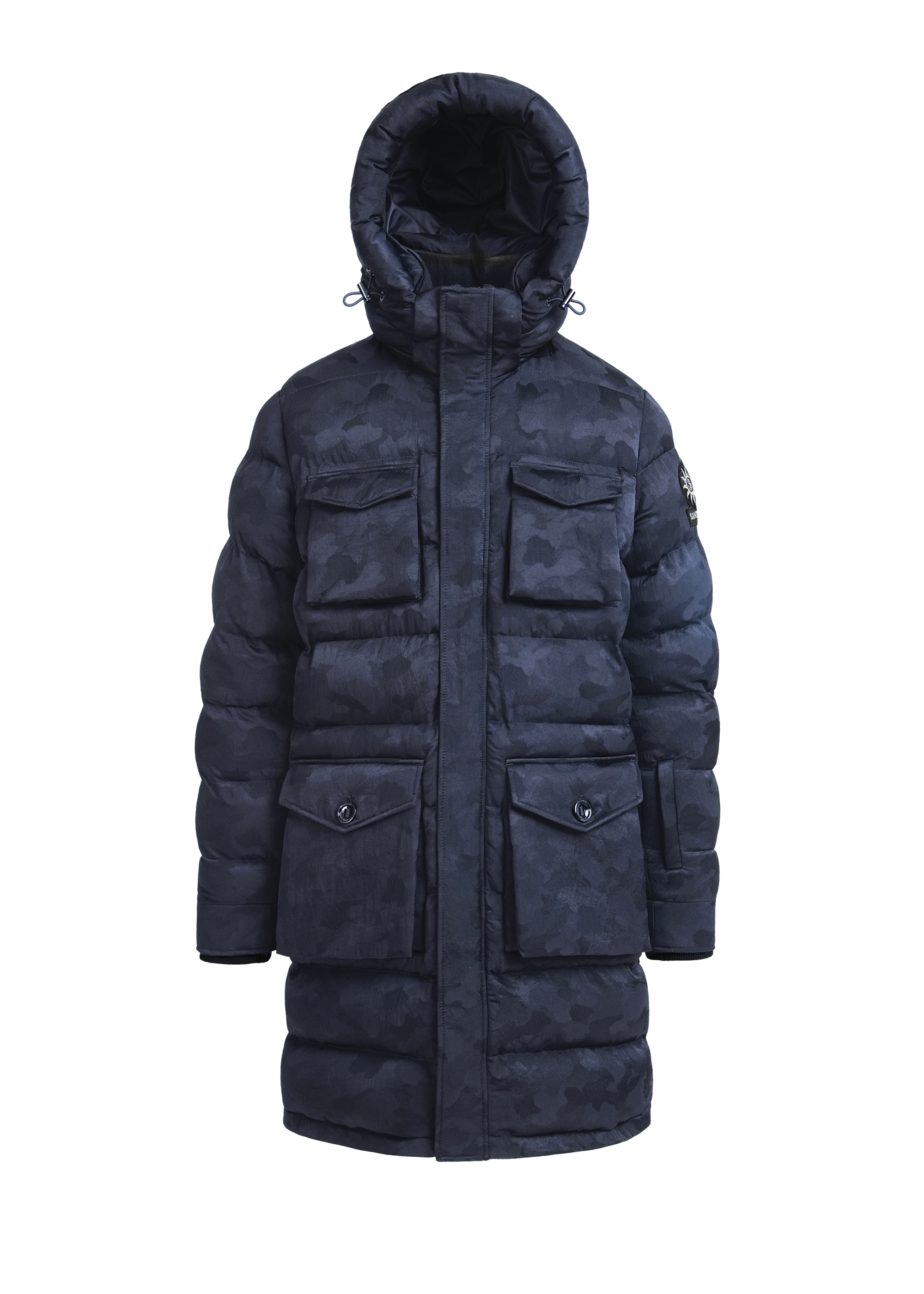 Sandbanks C6 Econyl® Branksome long puffer in navy camo jacket is made almost entirely from recycled plastic bottles. With a black camo water resistant Econyl® outer shell fabric made from recycled nylon in Italy. This long puffer jacket has high thermal retention and features a Sandbanks felt badge with rubber print, 4 utility styled pockets, detachable hood and features Italian luxury shiny black enamel Lampo zips and engraved Sandbanks components.