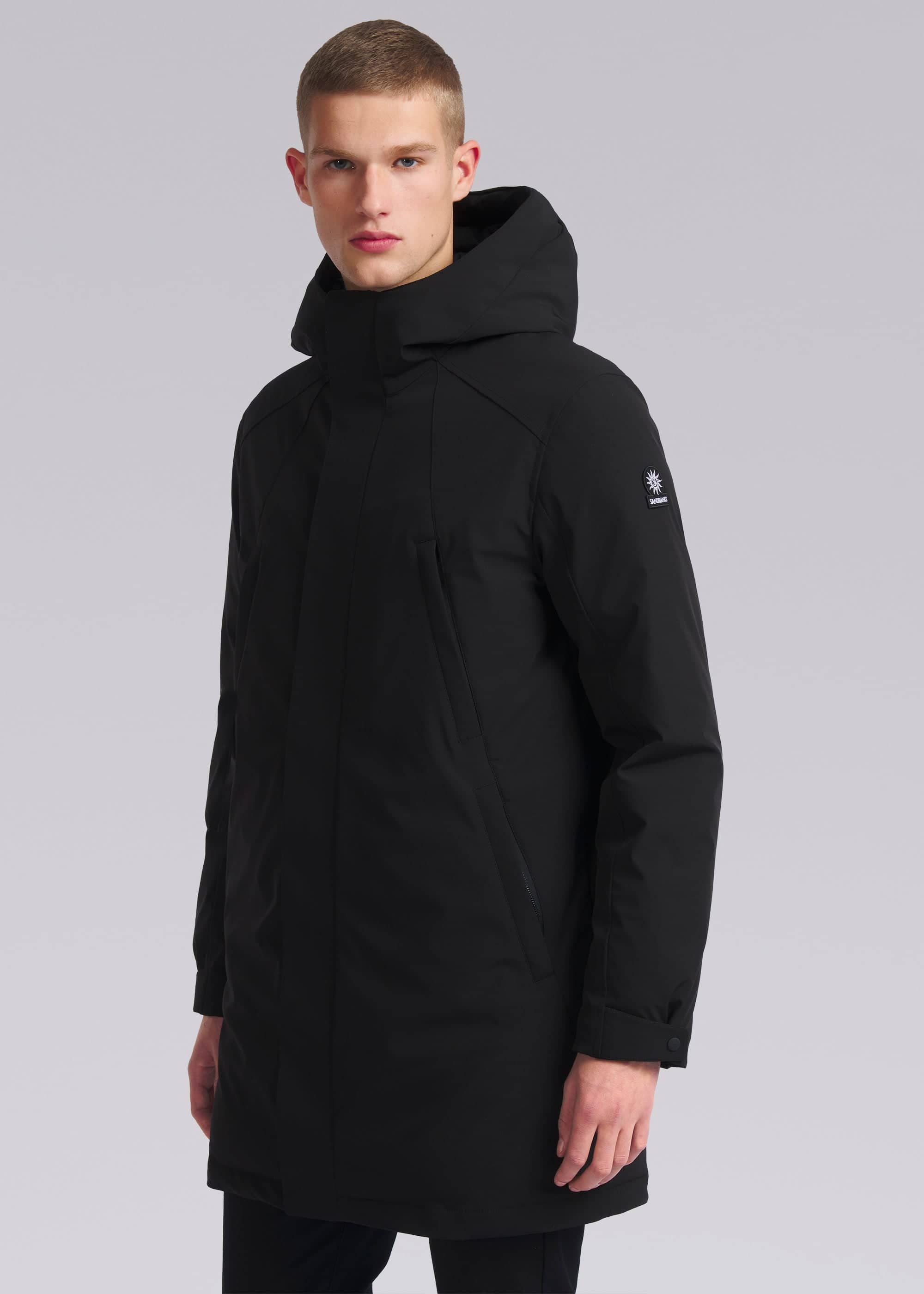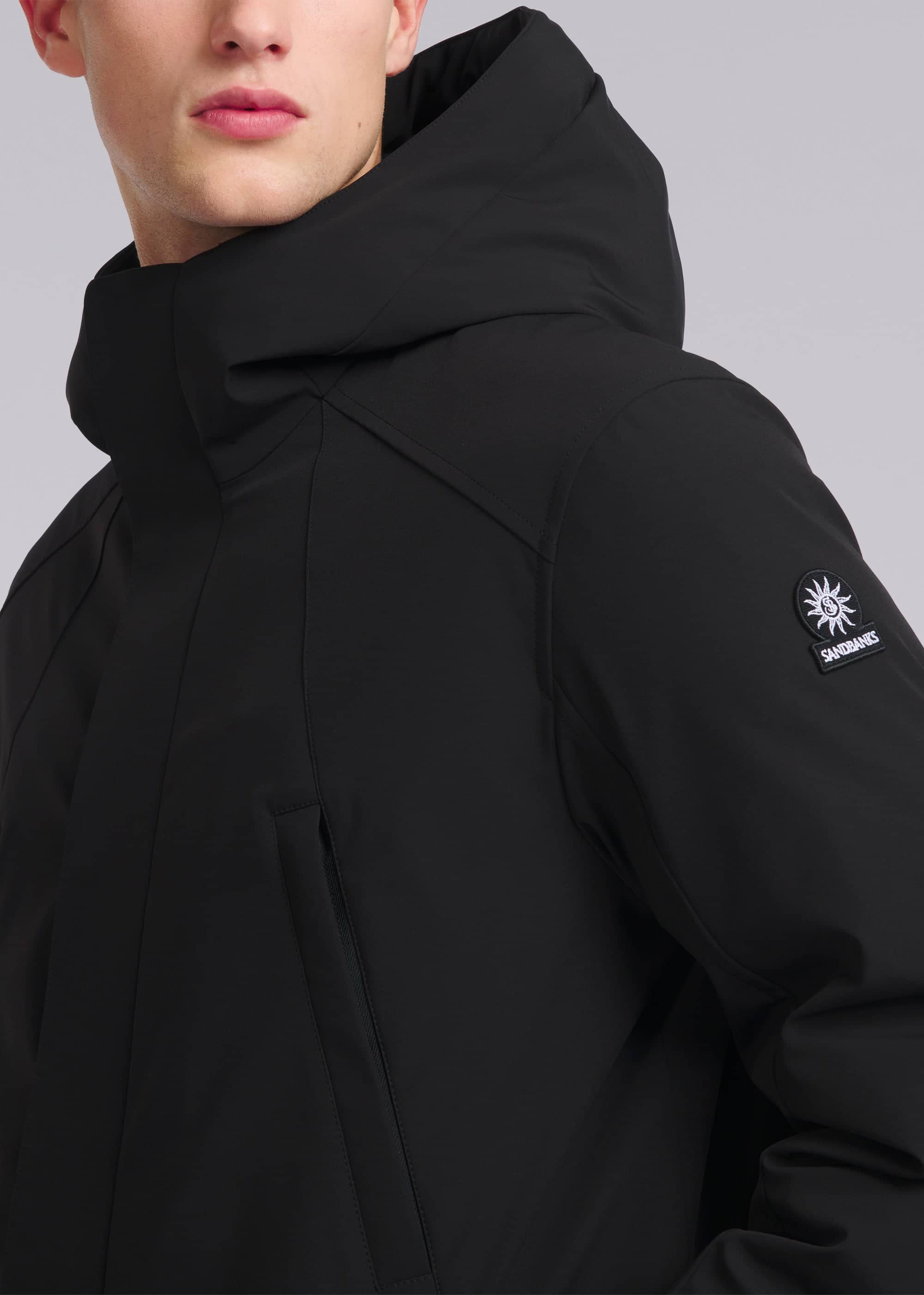 The Sandbanks Salterns jacket, a clean and contemporary looking jacket that features a black outer shell with eco-down puffer internal. This jacket has high thermal retention and featuring an adjustable hood, embroidered logo badges, engraved black rubberised components and zip pocket details.