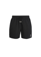 The Sandbanks badge logo swim shorts in black, made from a luxurious emerised fabric using 100% recycled polyester yarns and features an embroidered badge logo, elasticated waistband with drawstring cords, brushed gun metal cord ends with laser engraved Sandbanks logo, side pockets and rear zip pocket with laser engraved SB zip puller.