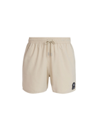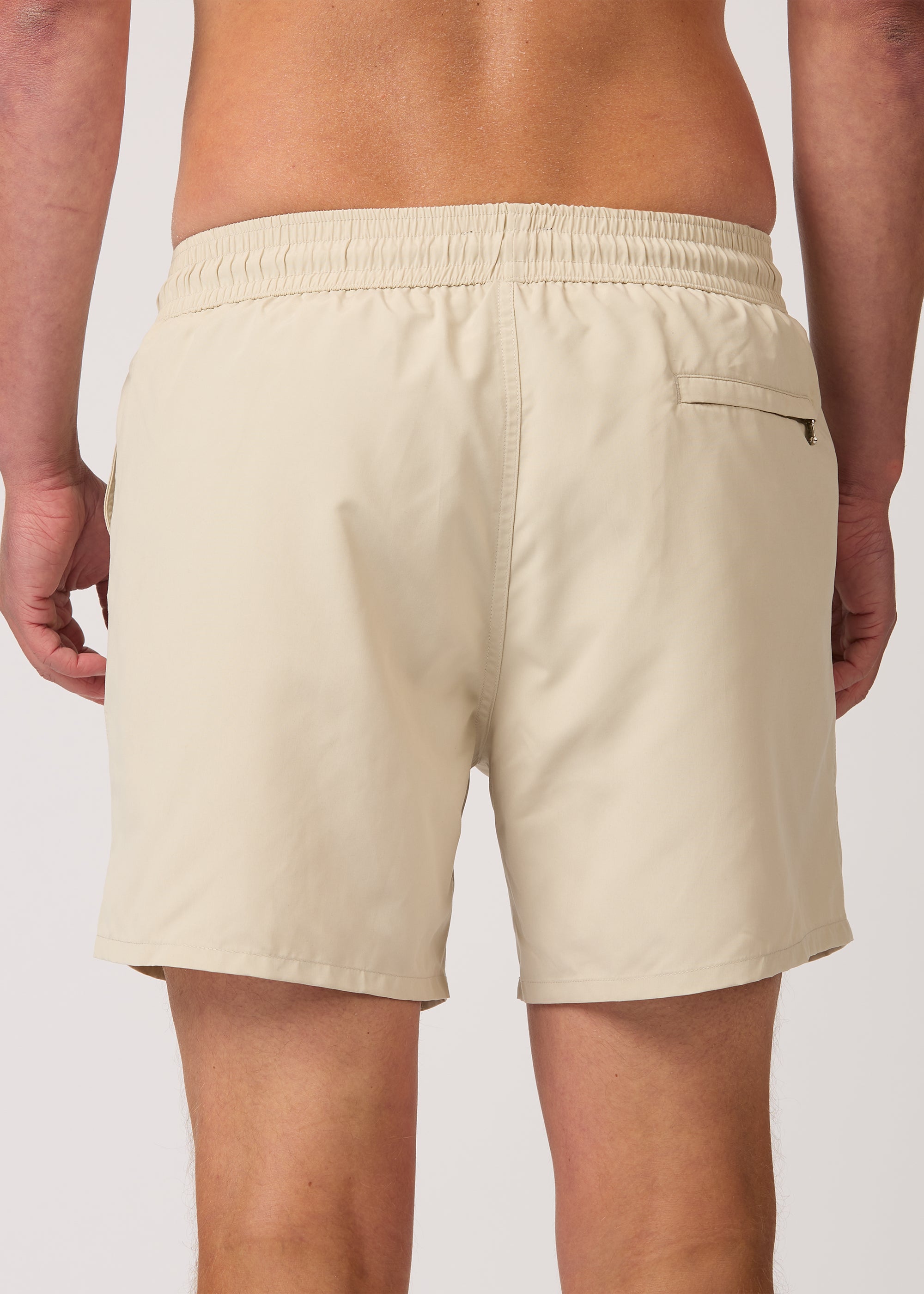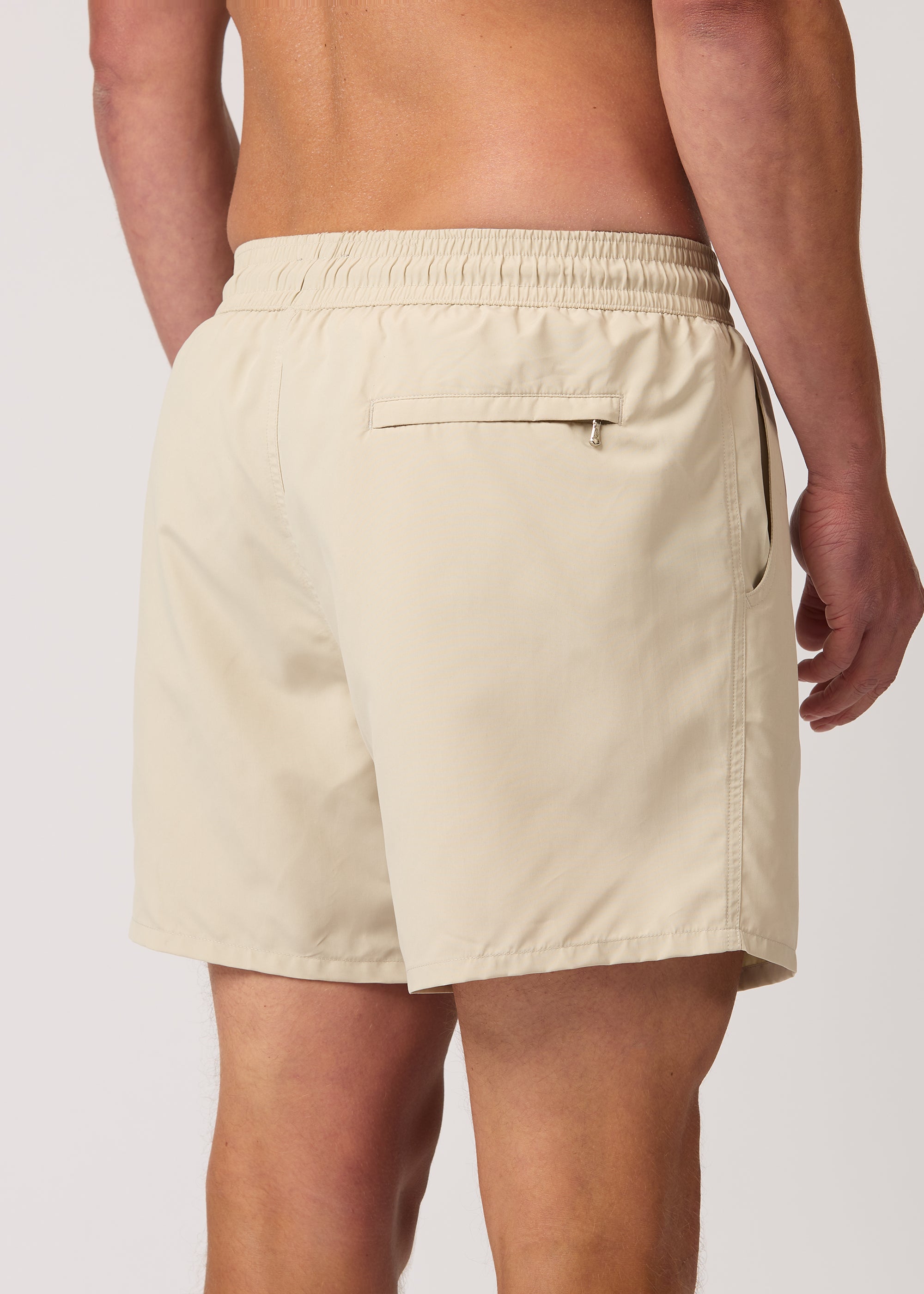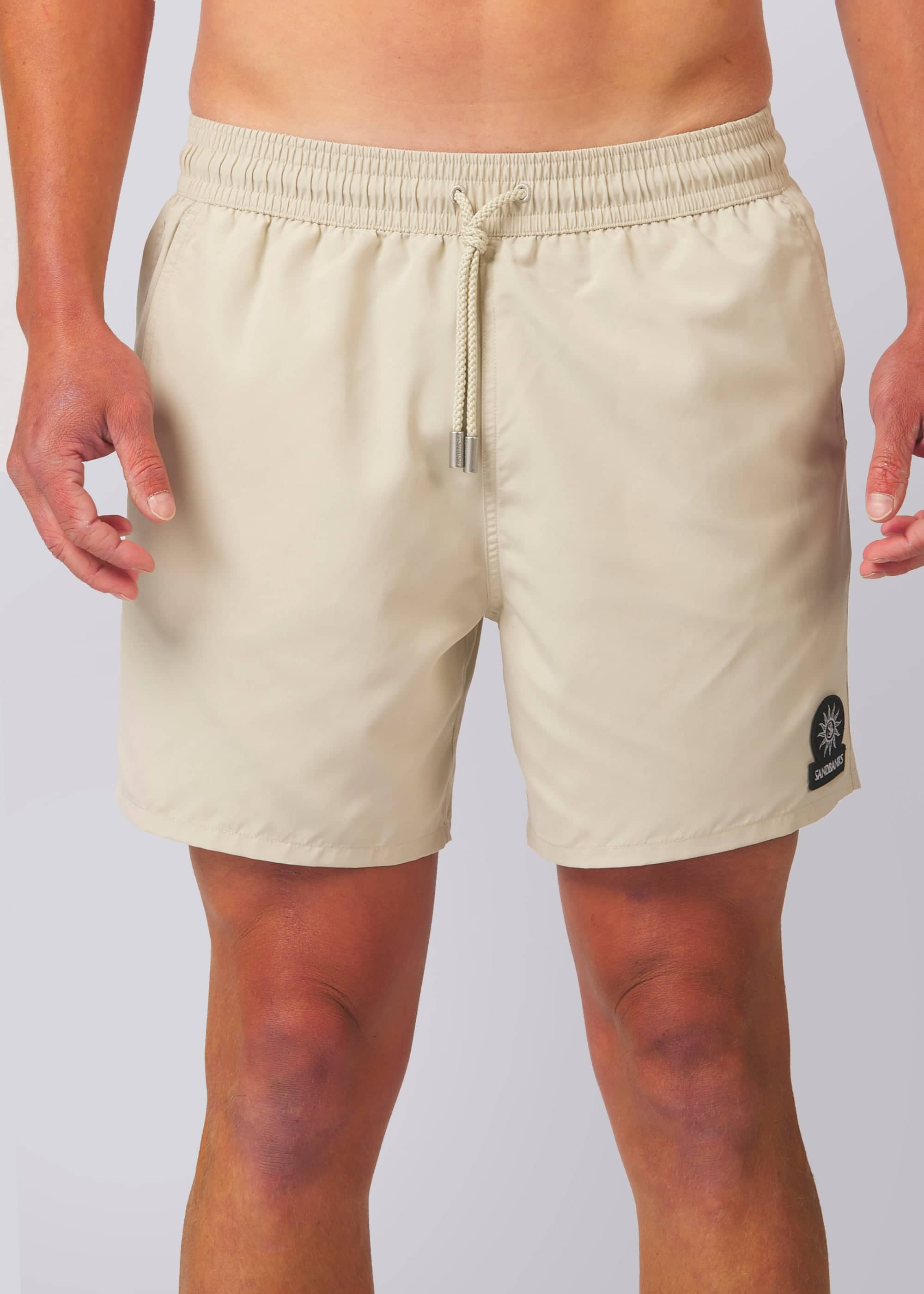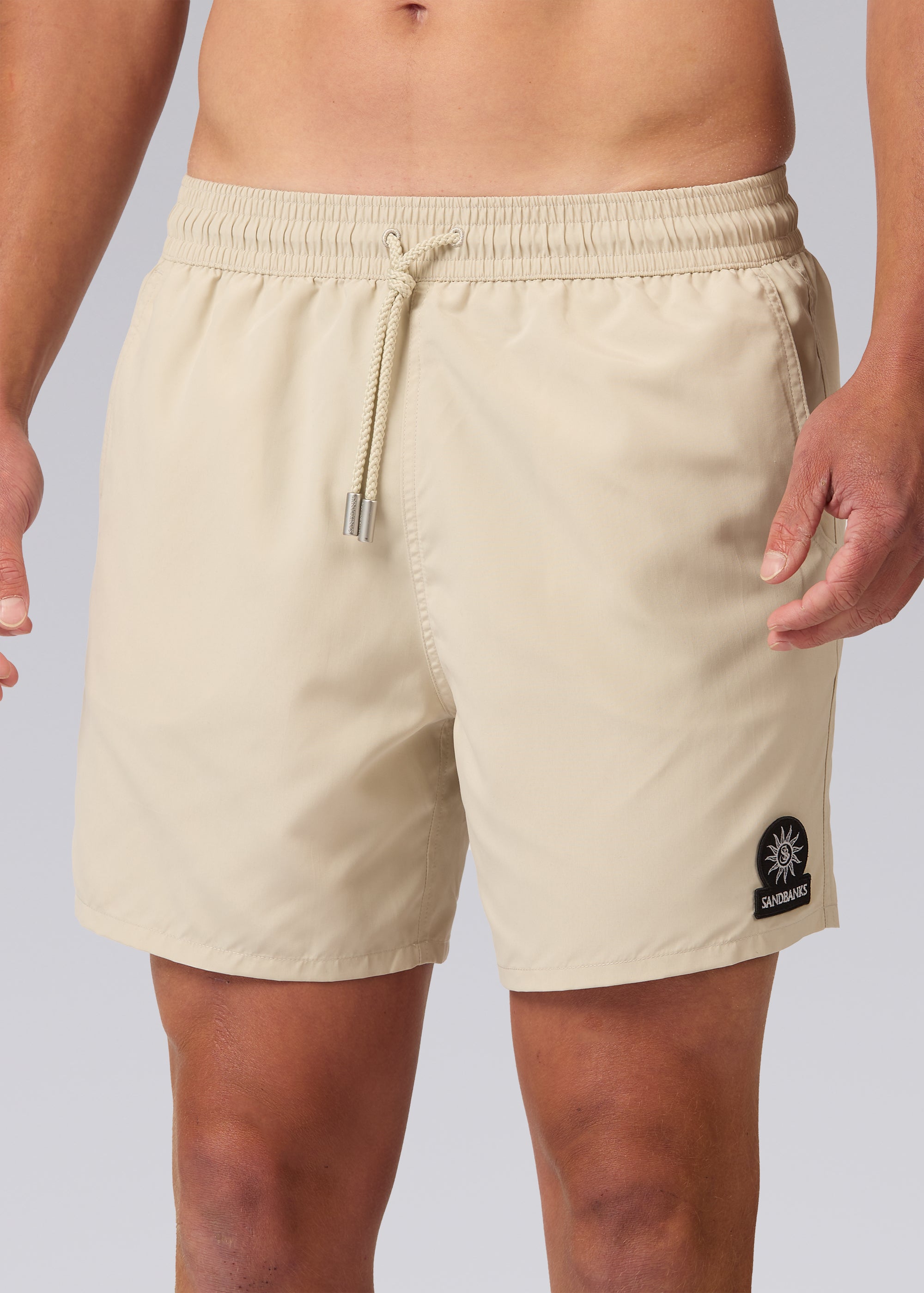 The Sandbanks badge logo swim shorts in stone, made from a luxurious emerised fabric using 100% recycled polyester yarns and features an embroidered badge logo, elasticated waistband with drawstring cords, brushed gun metal cord ends with laser engraved Sandbanks logo, side pockets and rear zip pocket with laser engraved SB zip puller.