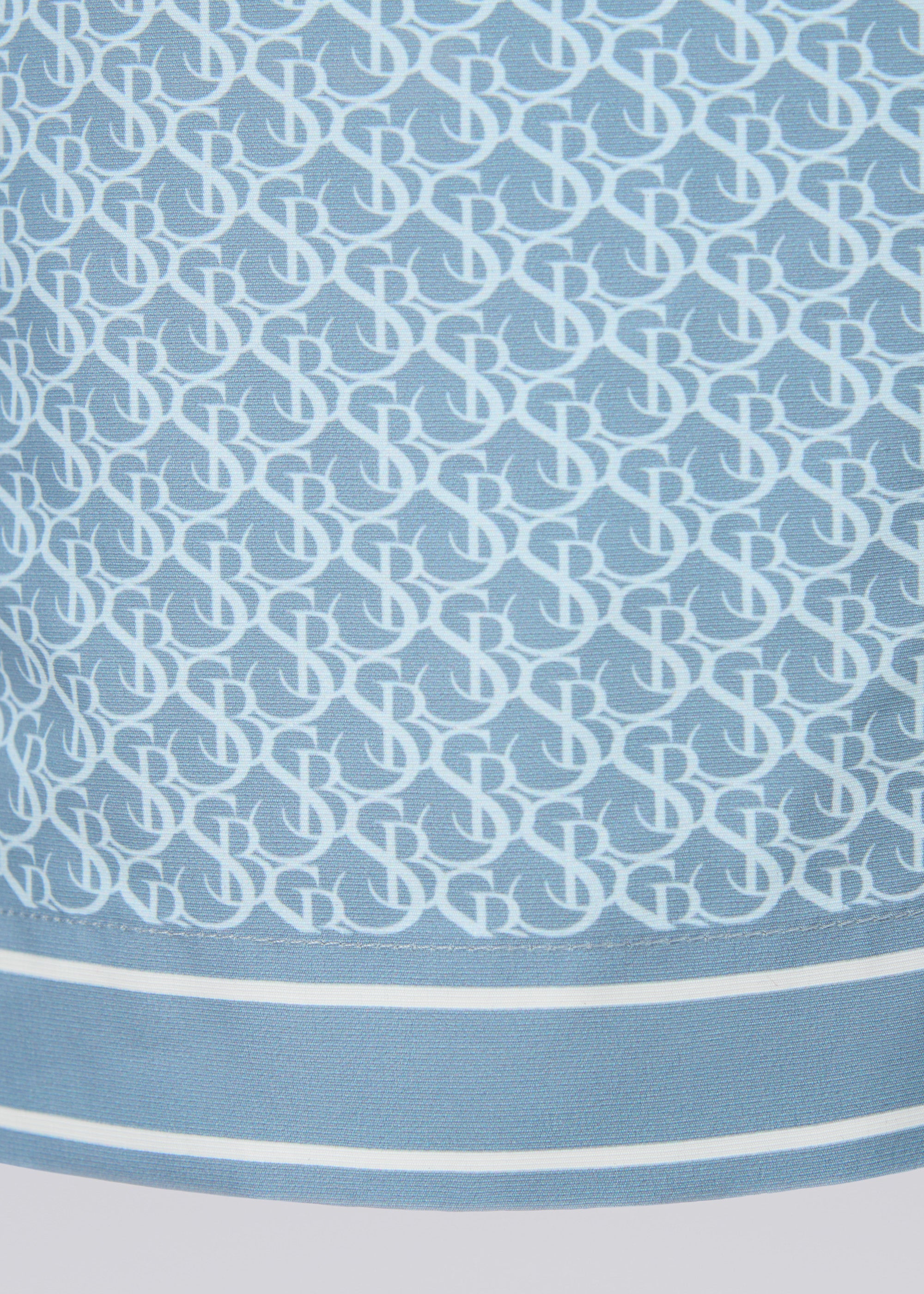 Sandbanks monogram resort shorts in crystal blue. These sophisticated swim shorts feature a high shine silver engraved snap closure, zip front and rear pocket with Lampo zip pulls.