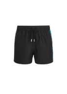 The Sandbanks retro swim shorts in black, made from a luxurious emerised fabric using 100% recycled polyester yarns and features a tri-colour ribbon side seam details with Sandbanks print, elasticated waistband with drawstring cords, brushed gun metal cord ends with laser engraved Sandbanks logo, side pockets and rear zip pocket with laser engraved SB zip puller.