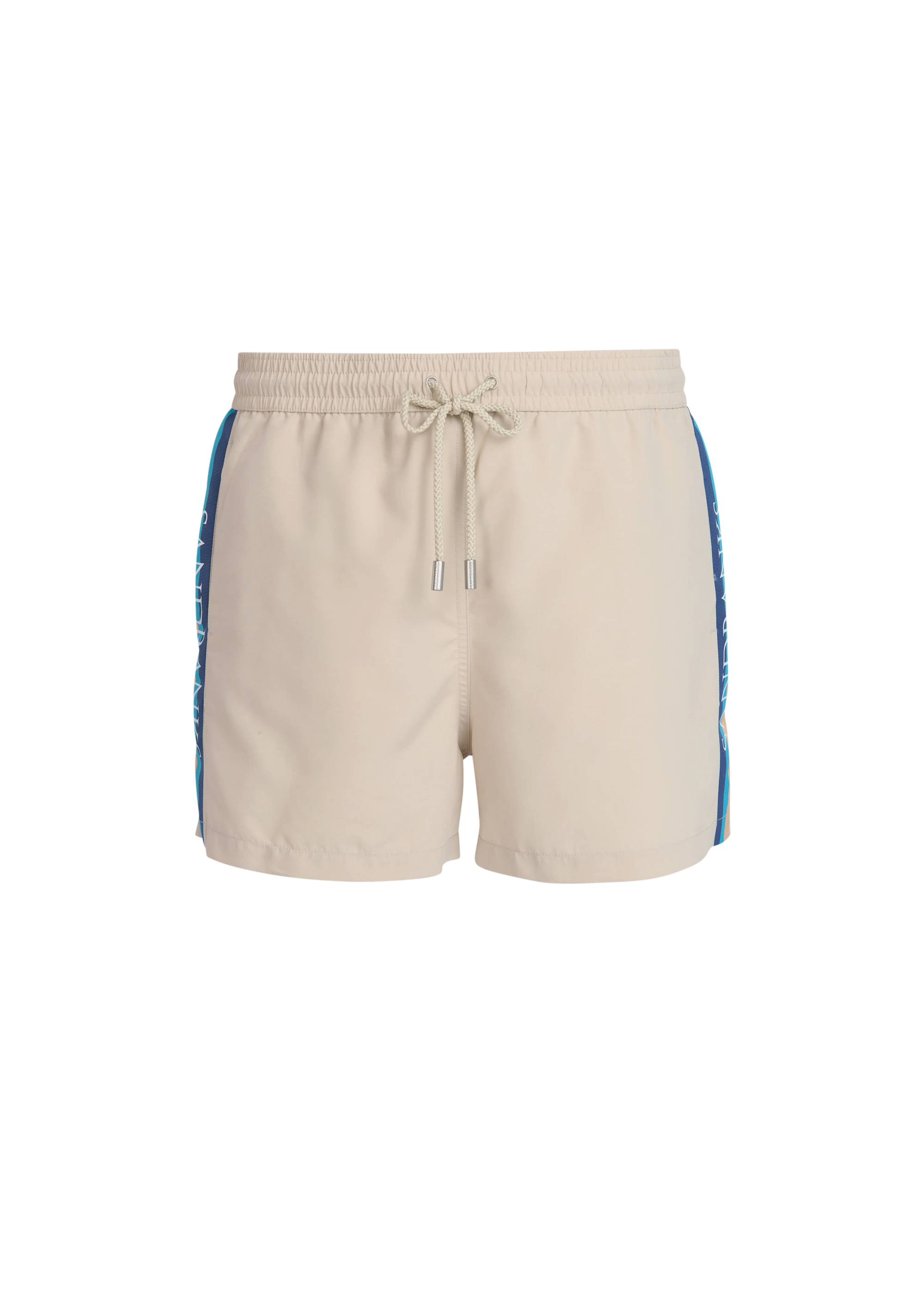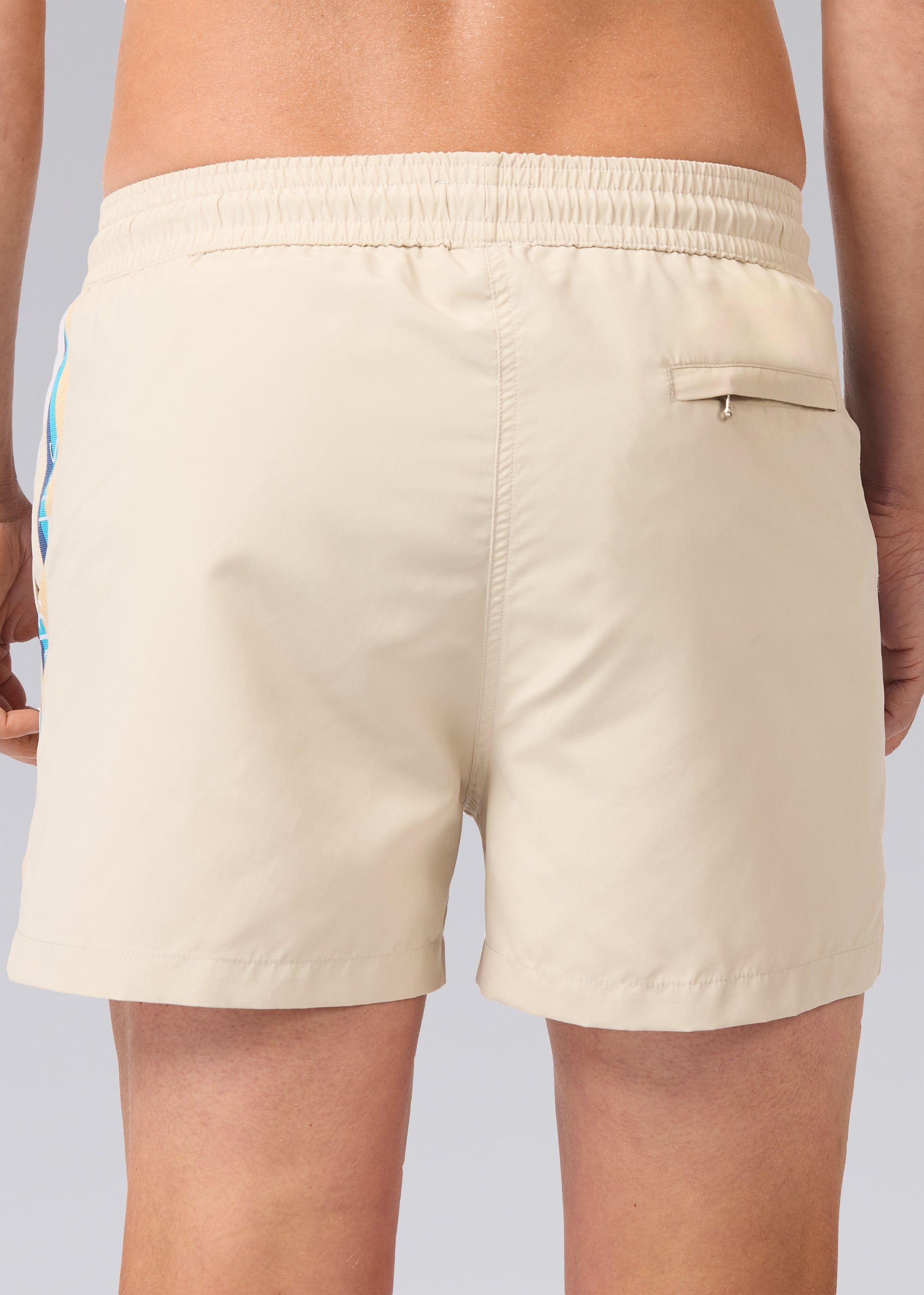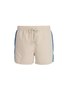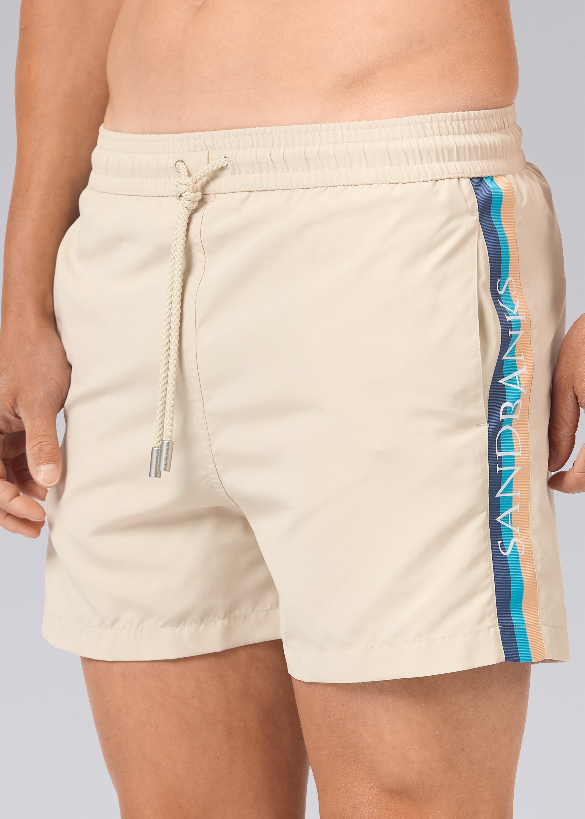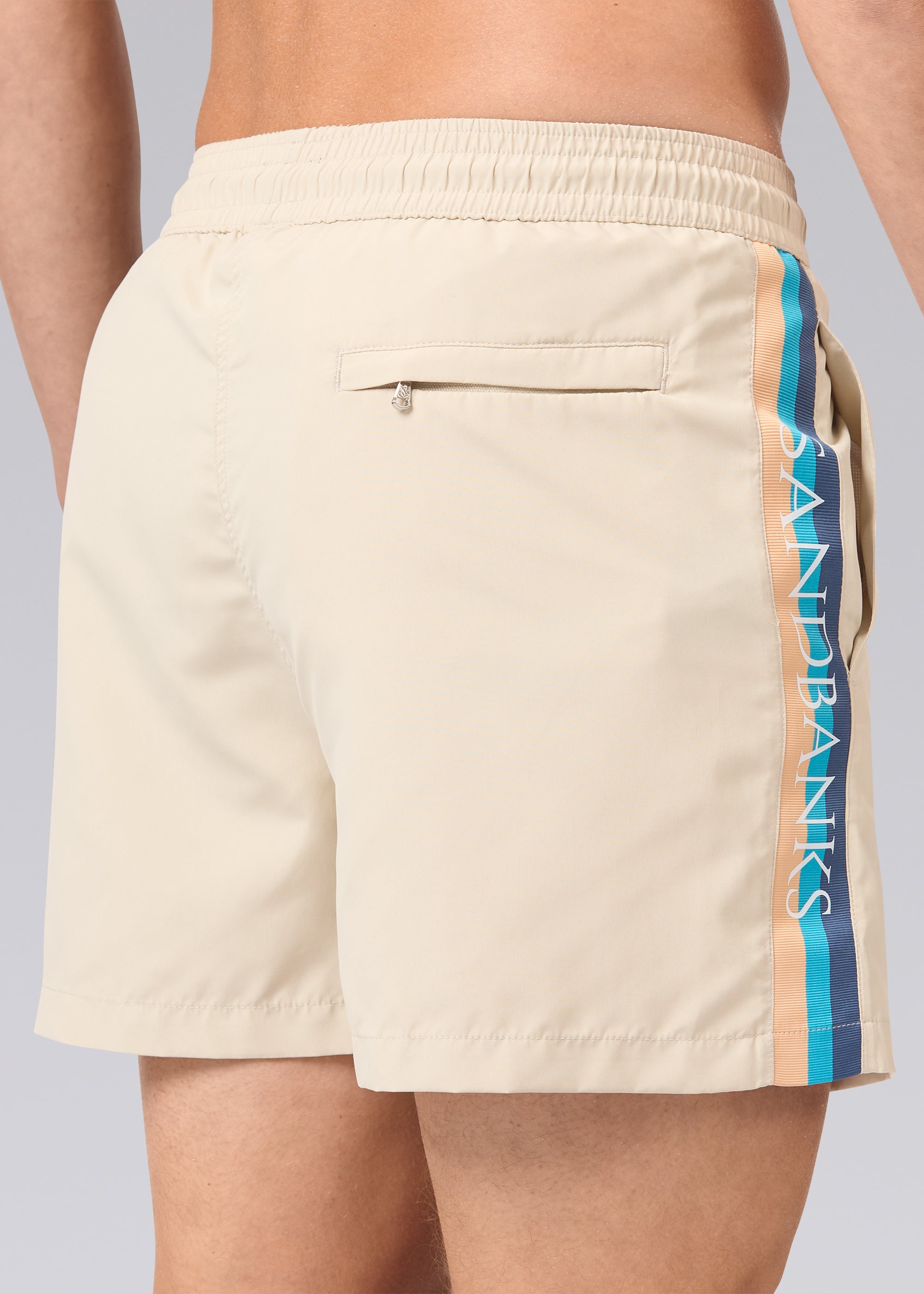 The Sandbanks retro swim shorts in stone, made from a luxurious emerised fabric using 100% recycled polyester yarns and features a tri-colour ribbon side seam details with Sandbanks print, elasticated waistband with drawstring cords, brushed gun metal cord ends with laser engraved Sandbanks logo, side pockets and rear zip pocket with laser engraved SB zip puller.